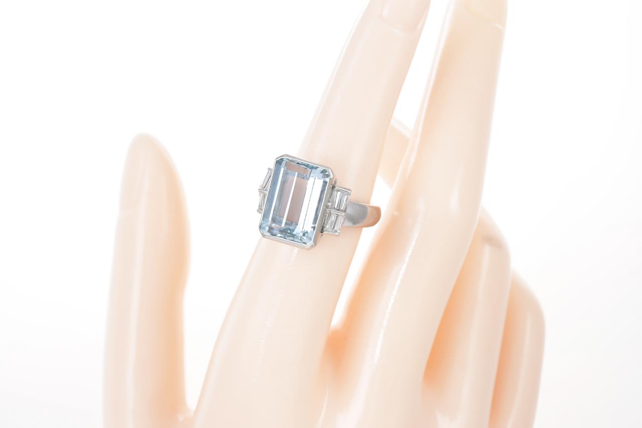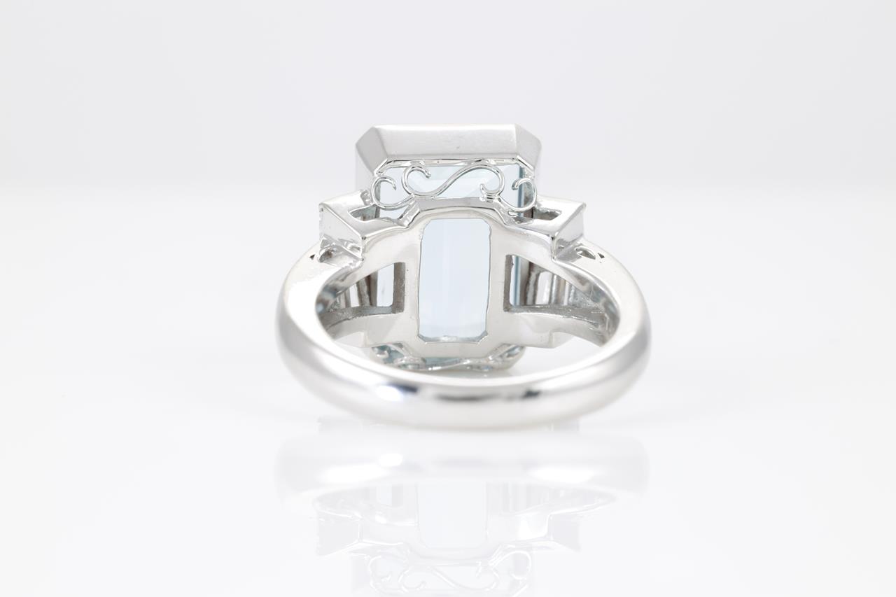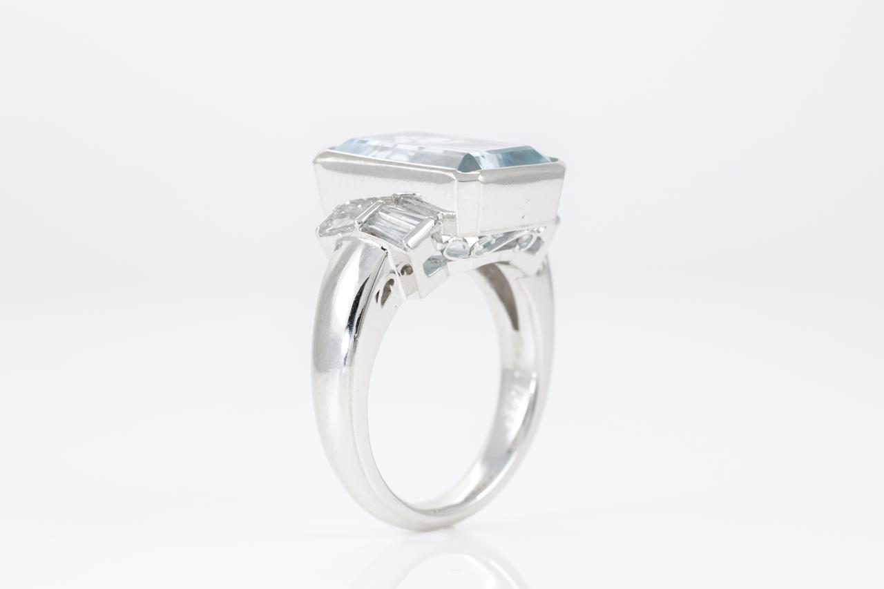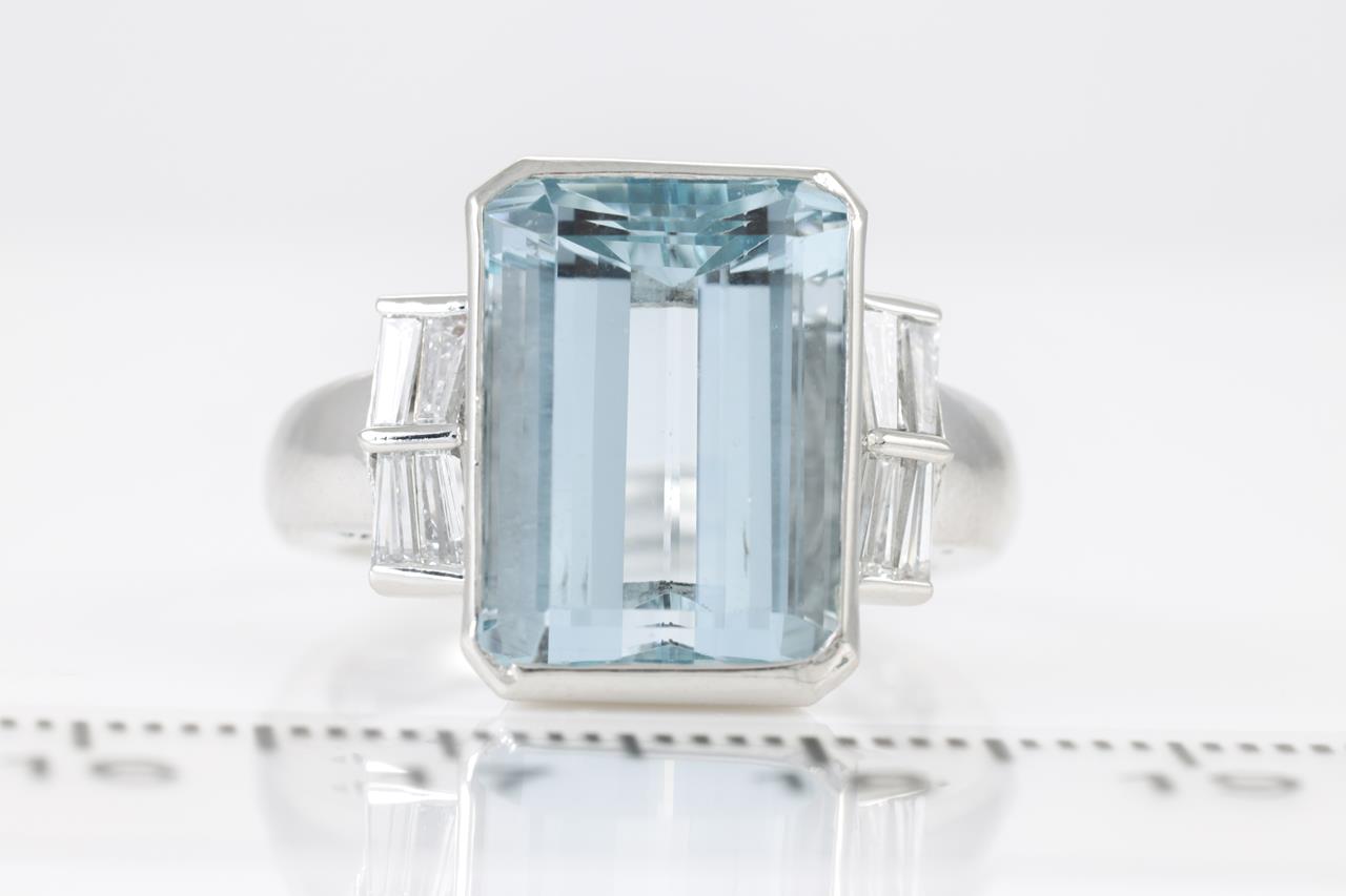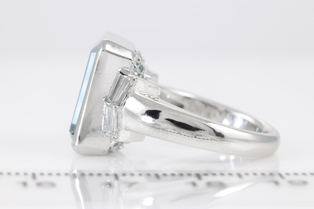 Aquamarine and Diamond Ring with emerald cut Aquamarine of 7.45ct with 4 baguette cut Diamonds totalling 0.44cts (Estimated grading: G SI). Platinum. Ring size M - ring resizing is not recommended. Weight: 13.6g (Pre-owned)