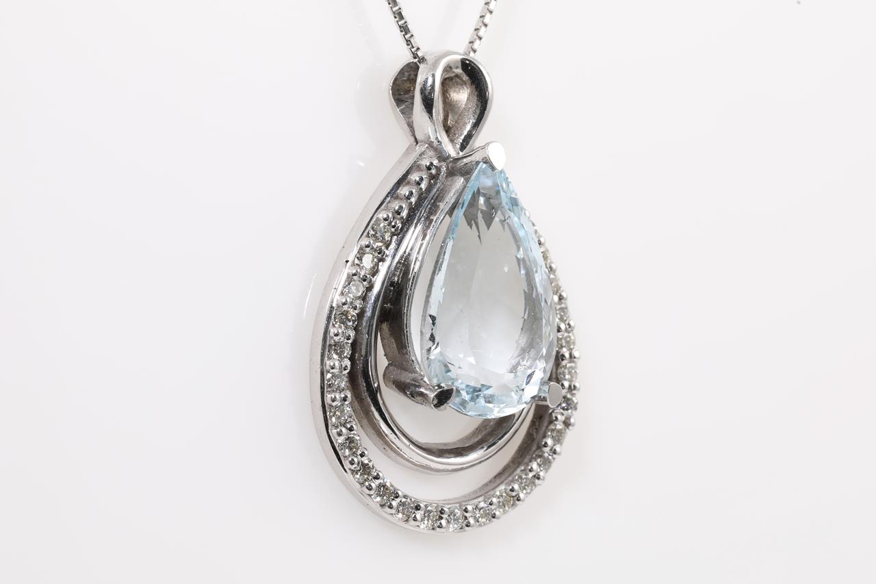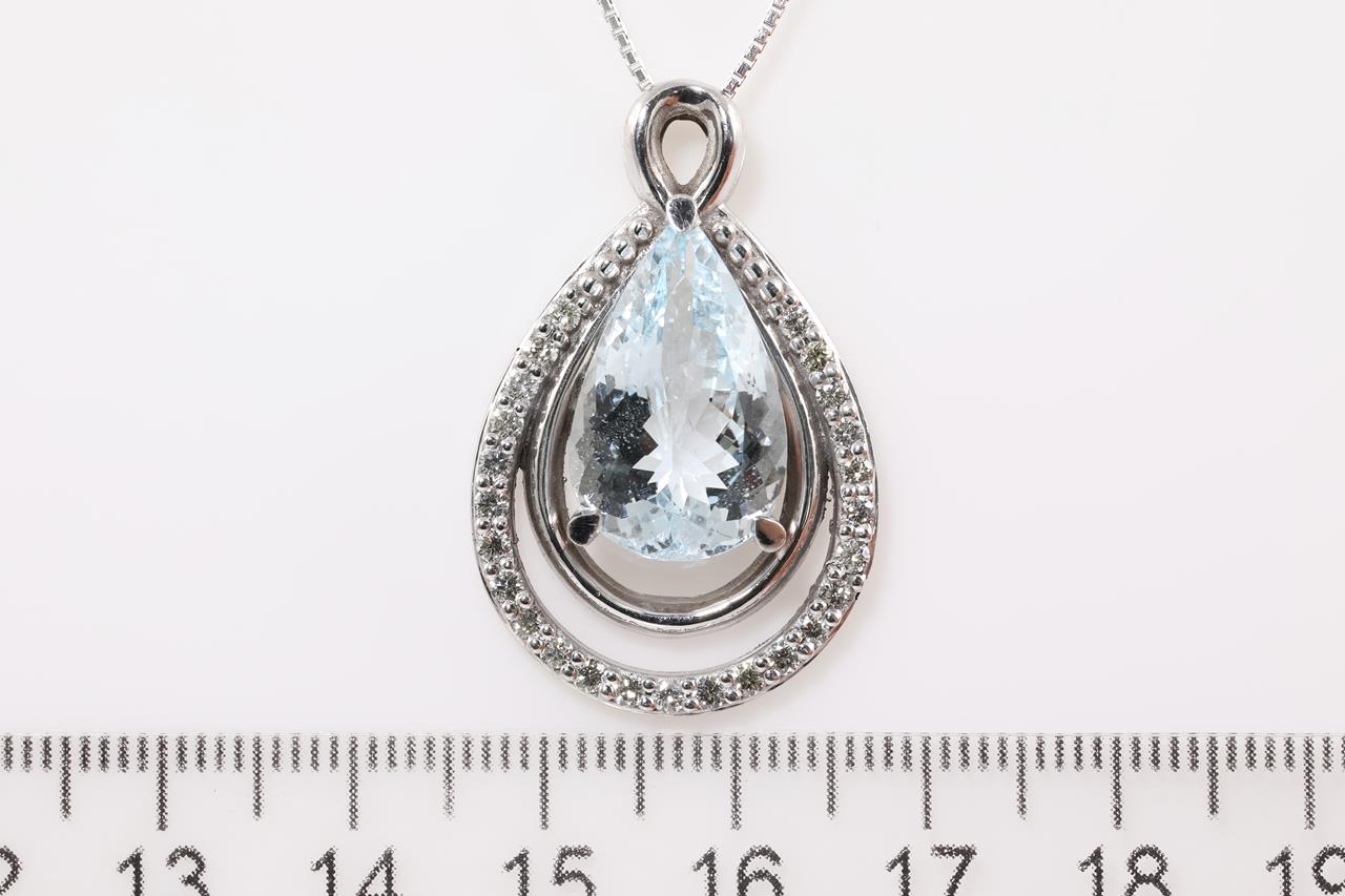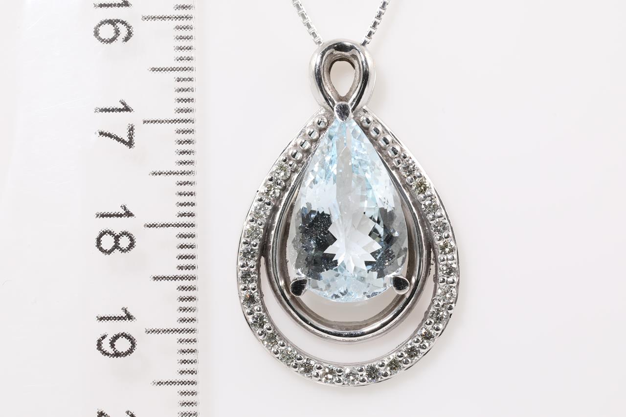 Aquamarine and Diamond Pendant with 7.52ct pear shape Aquamarine and 25 round Diamonds totalling approximately 0.50cts (Estimated grading: J-K SI). 14ct white gold. With display chain (base metal). Pendant Weight: 11.4g. (As New)