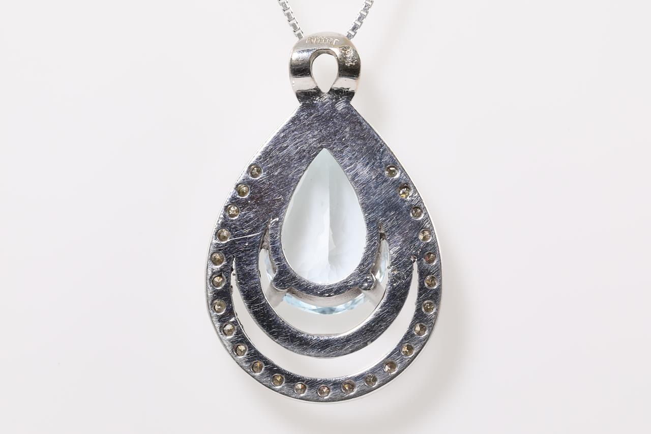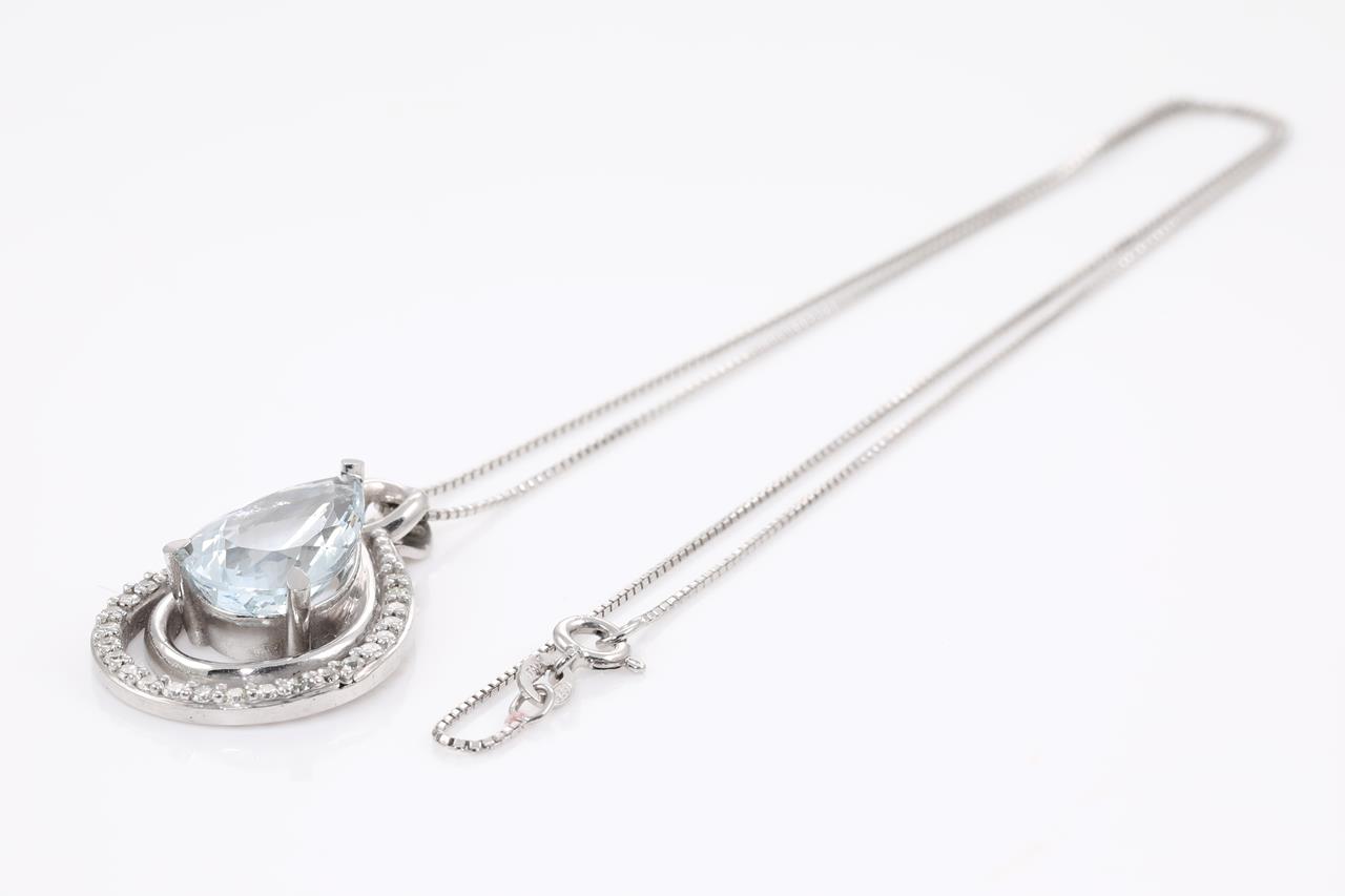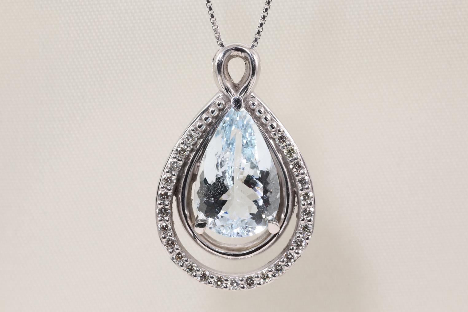 Aquamarine and Diamond Pendant with 7.52ct pear shape Aquamarine and 25 round Diamonds totalling approximately 0.50cts (Estimated grading: J-K SI). 14ct white gold. With display chain (base metal). Pendant Weight: 11.4g. (As New)