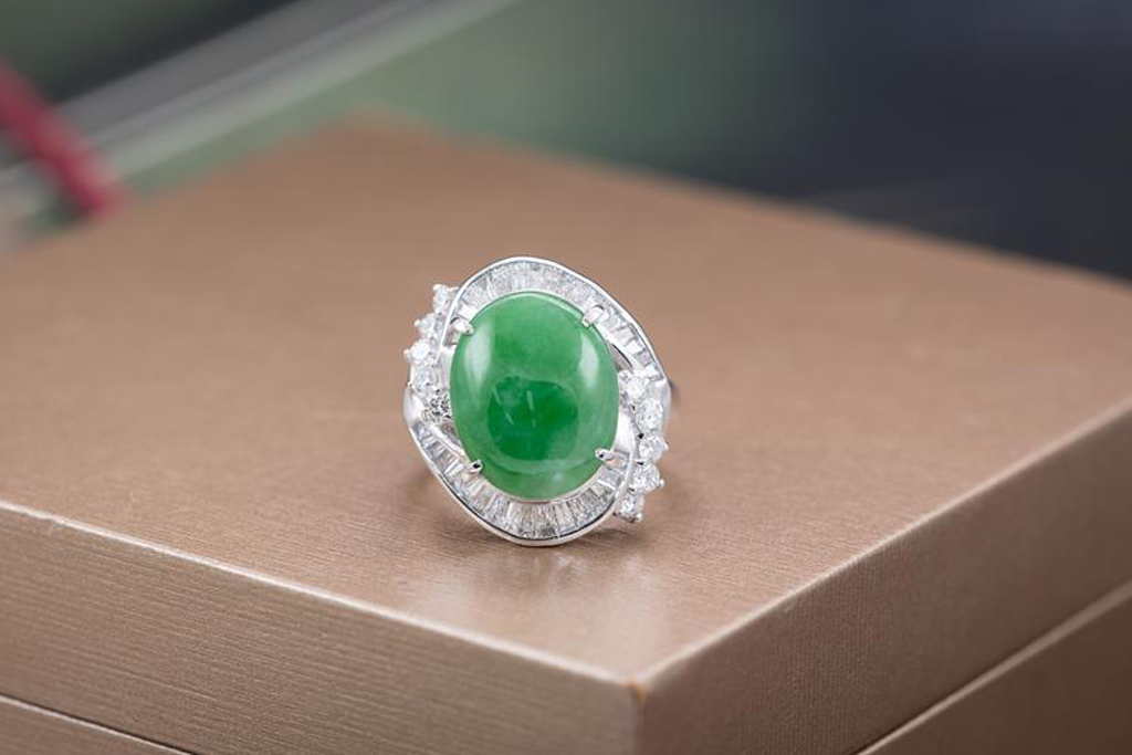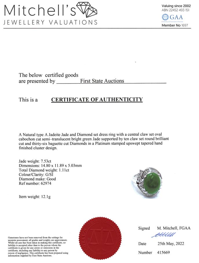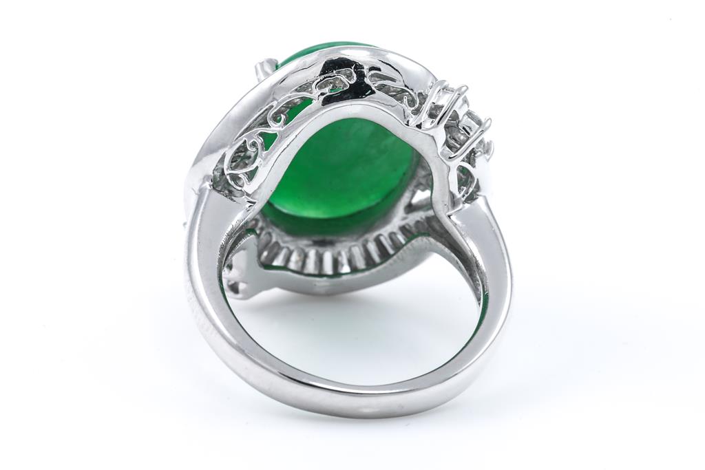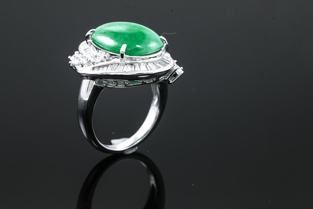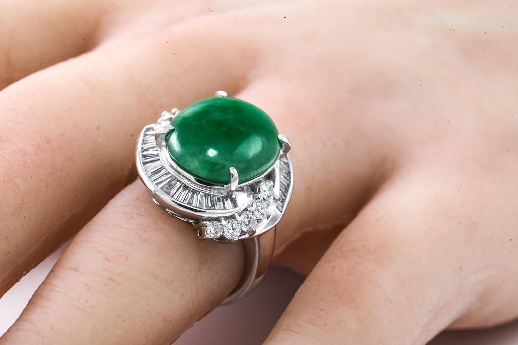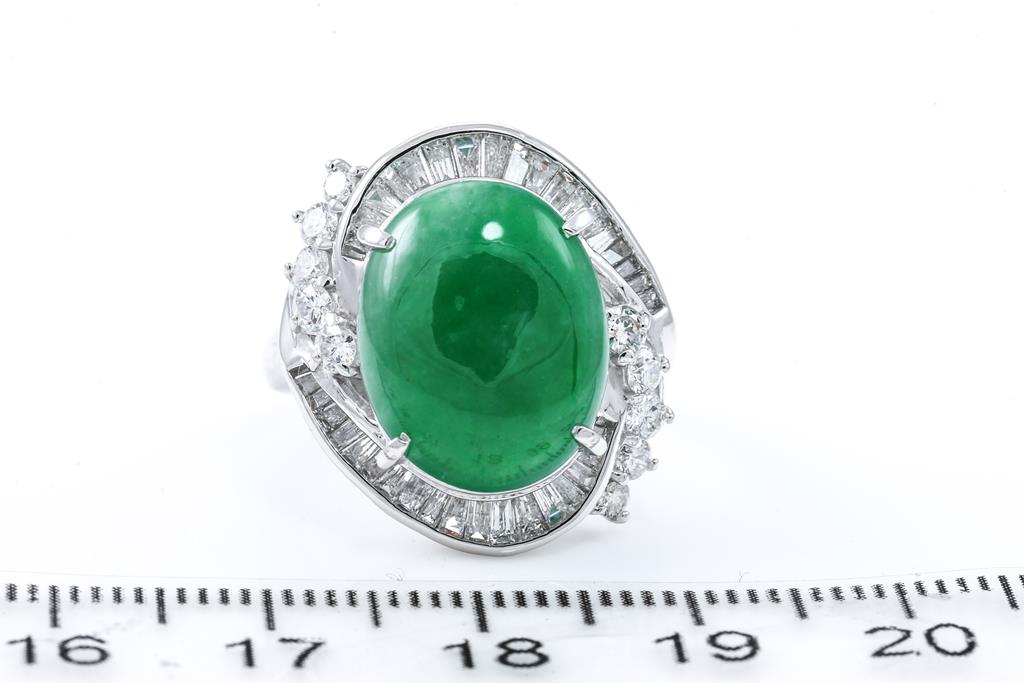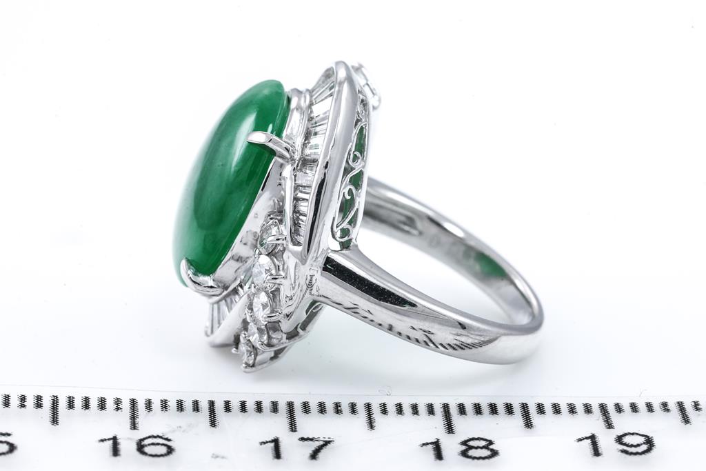 Jade and Diamond Ring with an oval cabochon cut Natural Type A green Jadeite Jade of 7.53ct and round & baguette cut Diamonds totalling 1.11cts (Estimated grading: G SI). Platinum. Ring size: J. Weight: 12.1g. With certificate #415669. (Pre-owned)