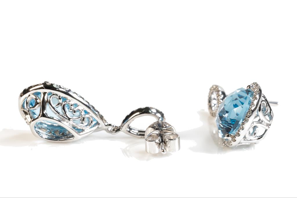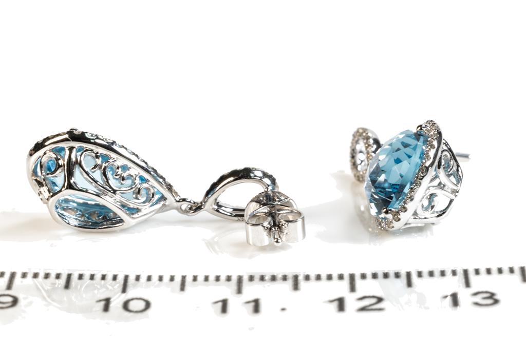 Topaz and Diamond earrings with pear blue Topaz totalling 7.53cts and round Diamonds totalling 0.39cts (Estimated grading: I-J SI). 14ct white gold with 18ct white gold backs. Weight: 5.0g. (New)