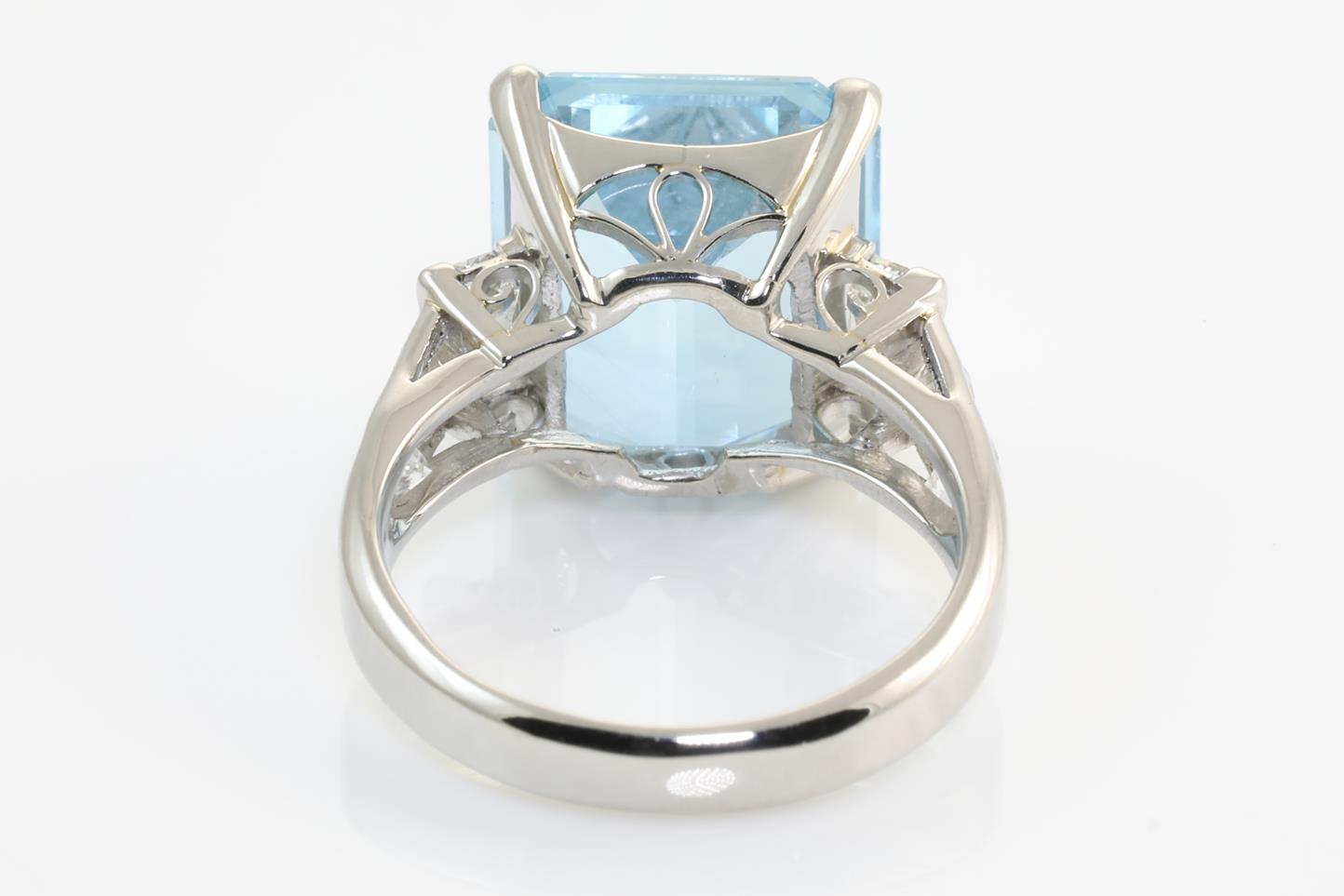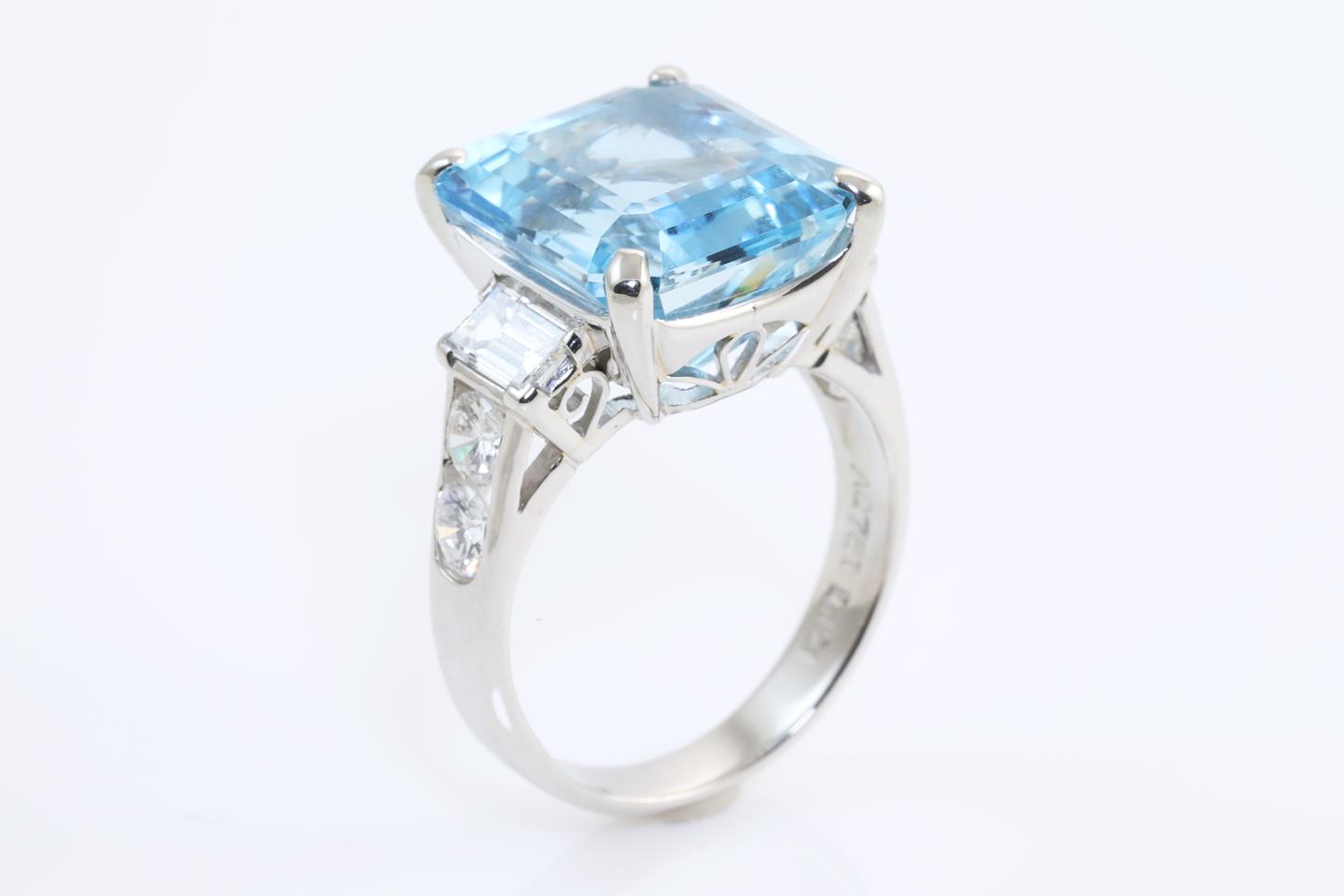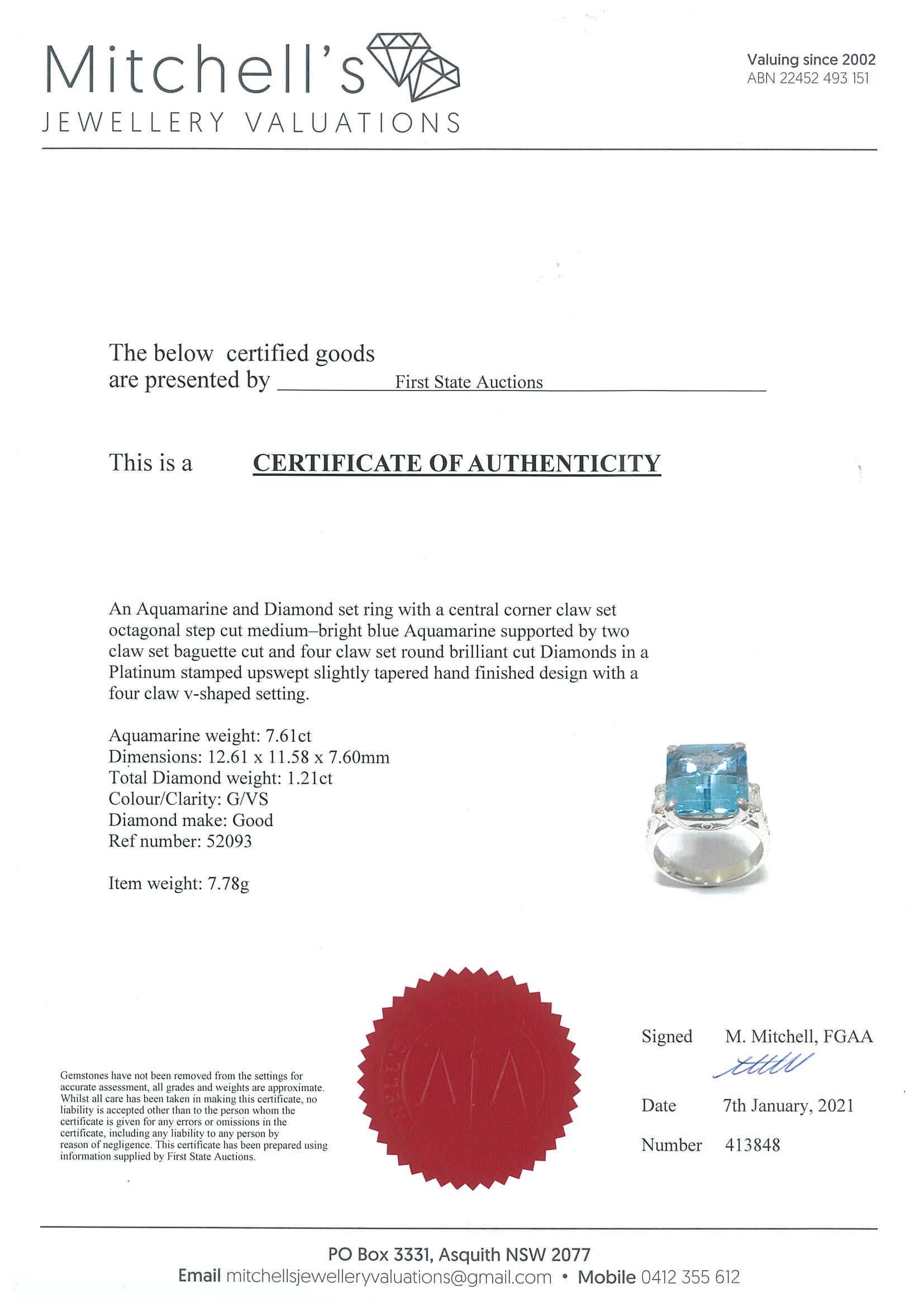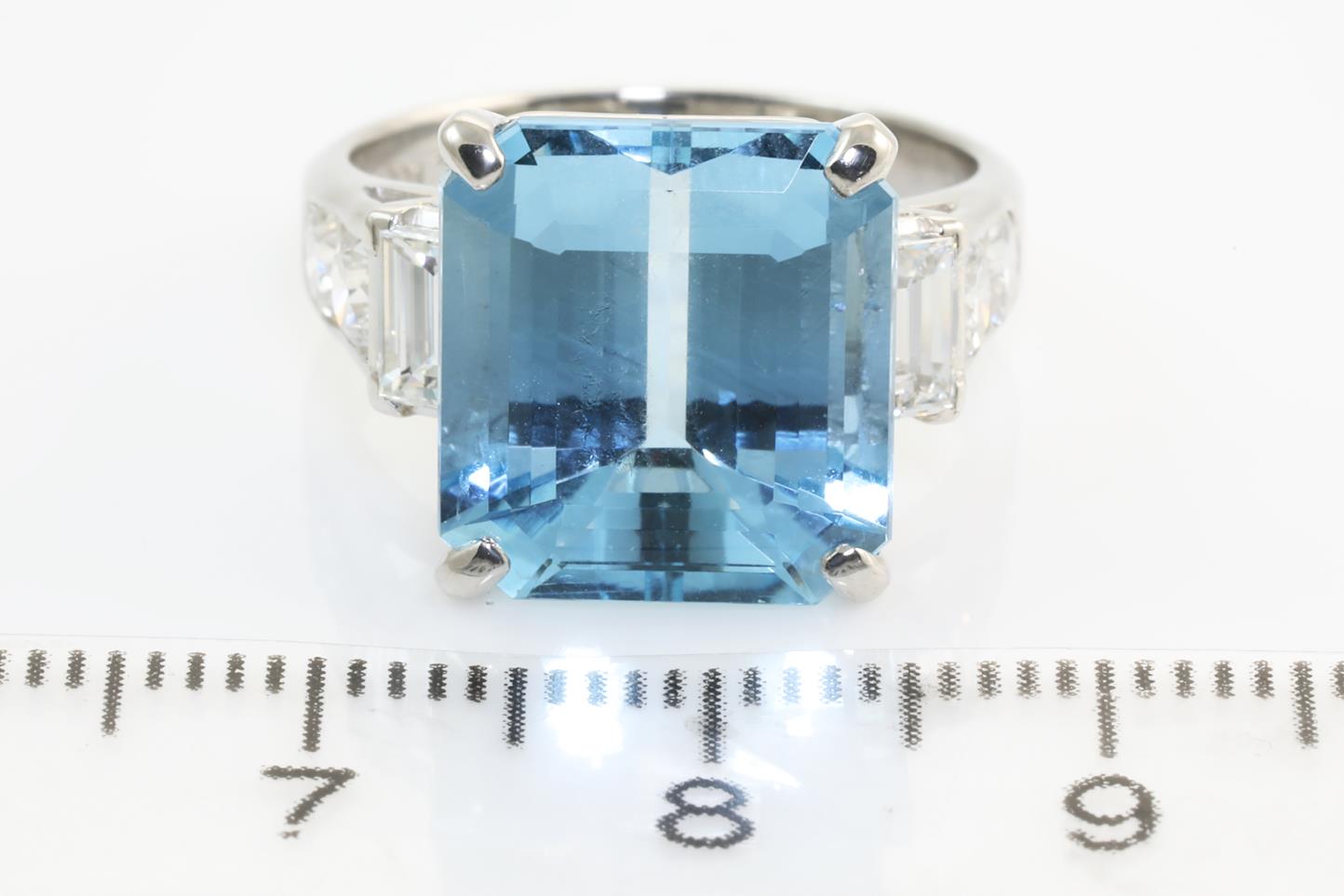 Aquamarine and Diamond ring with an emerald cut Aquamarine of 7.61ct with round and emerald cut shoulder Diamonds totalling 1.21cts (Estimated Grading: G VS). Platinum. Ring size L - Note this ring can only be resized up by a maximum of 3 sizes, down by ring clip. Weight: 7.7g. With certificate #413848 (Pre-owned)