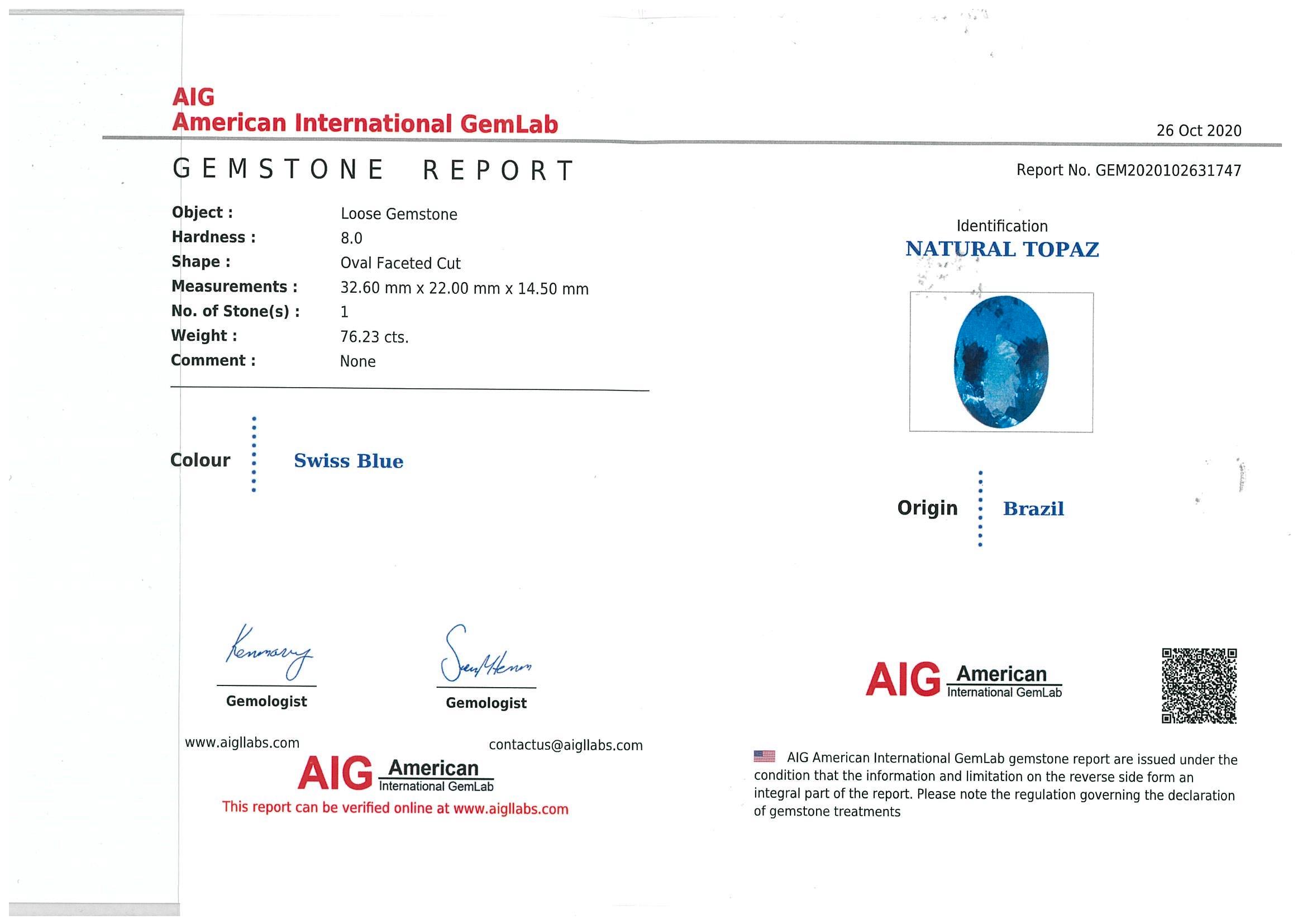 A loose oval faceted cut Natural Topaz of 76.23ct (with AIG report #GEM2020102631747). Size: 32.6 x 22.0 x 14.5mm. (New)