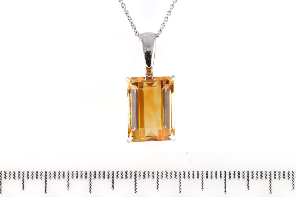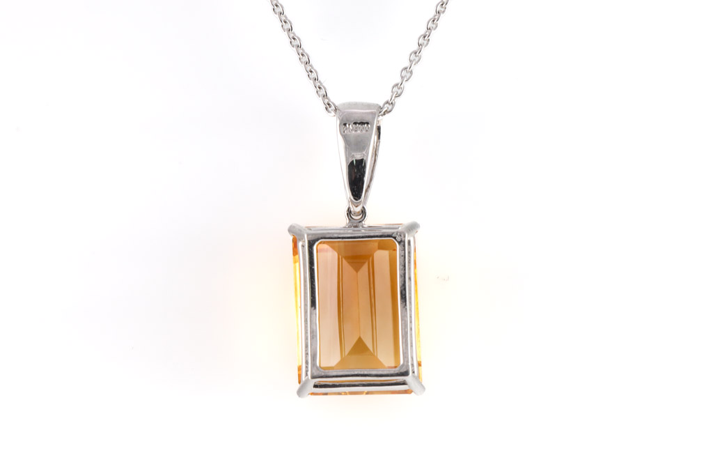 Citrine pendant with emerald cut Citrine of approximately 7.69ct. Platinum - 900 with 18ct white gold 42cm chain. Weight: 6.2g. (Pre-owned)