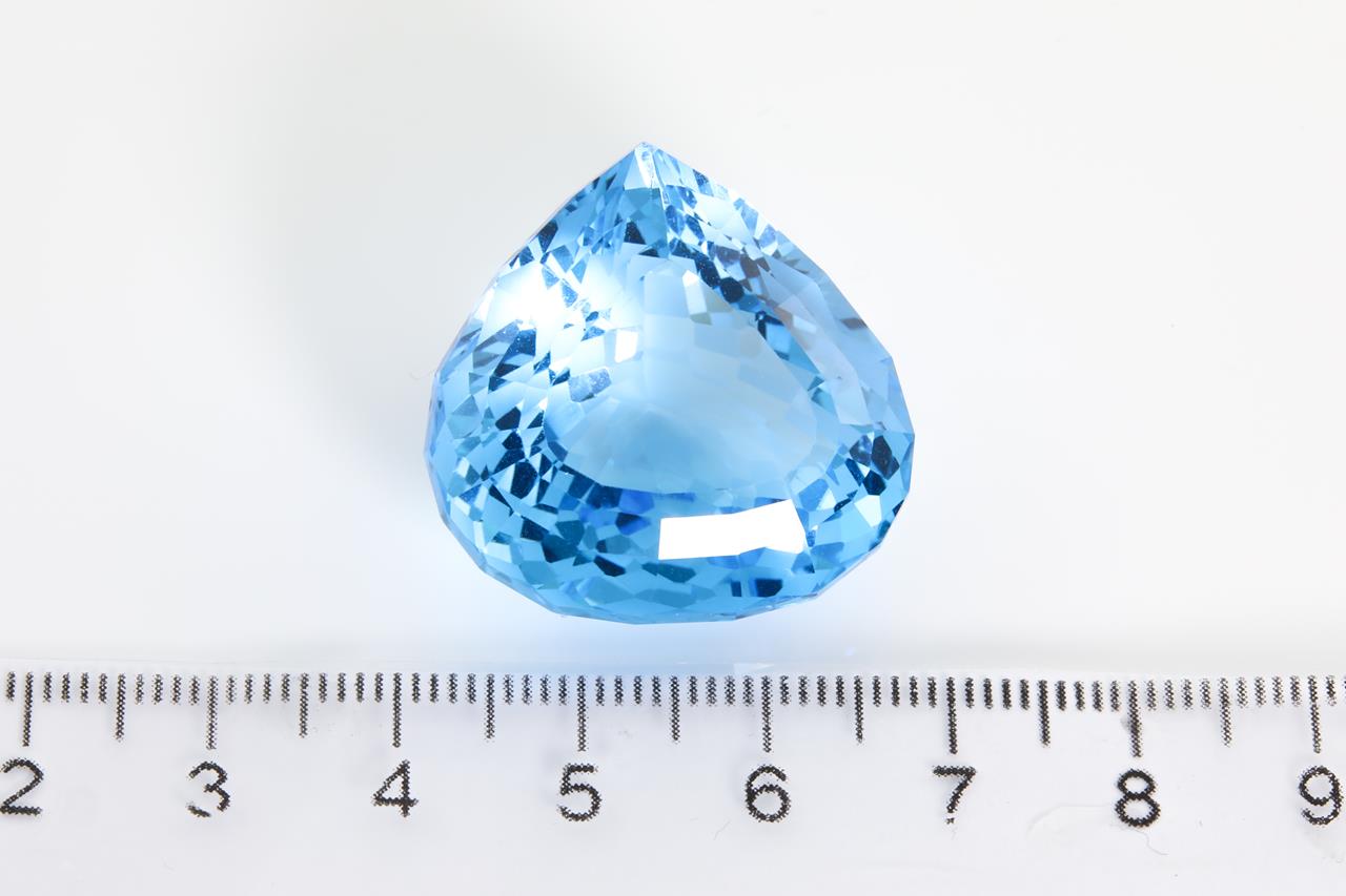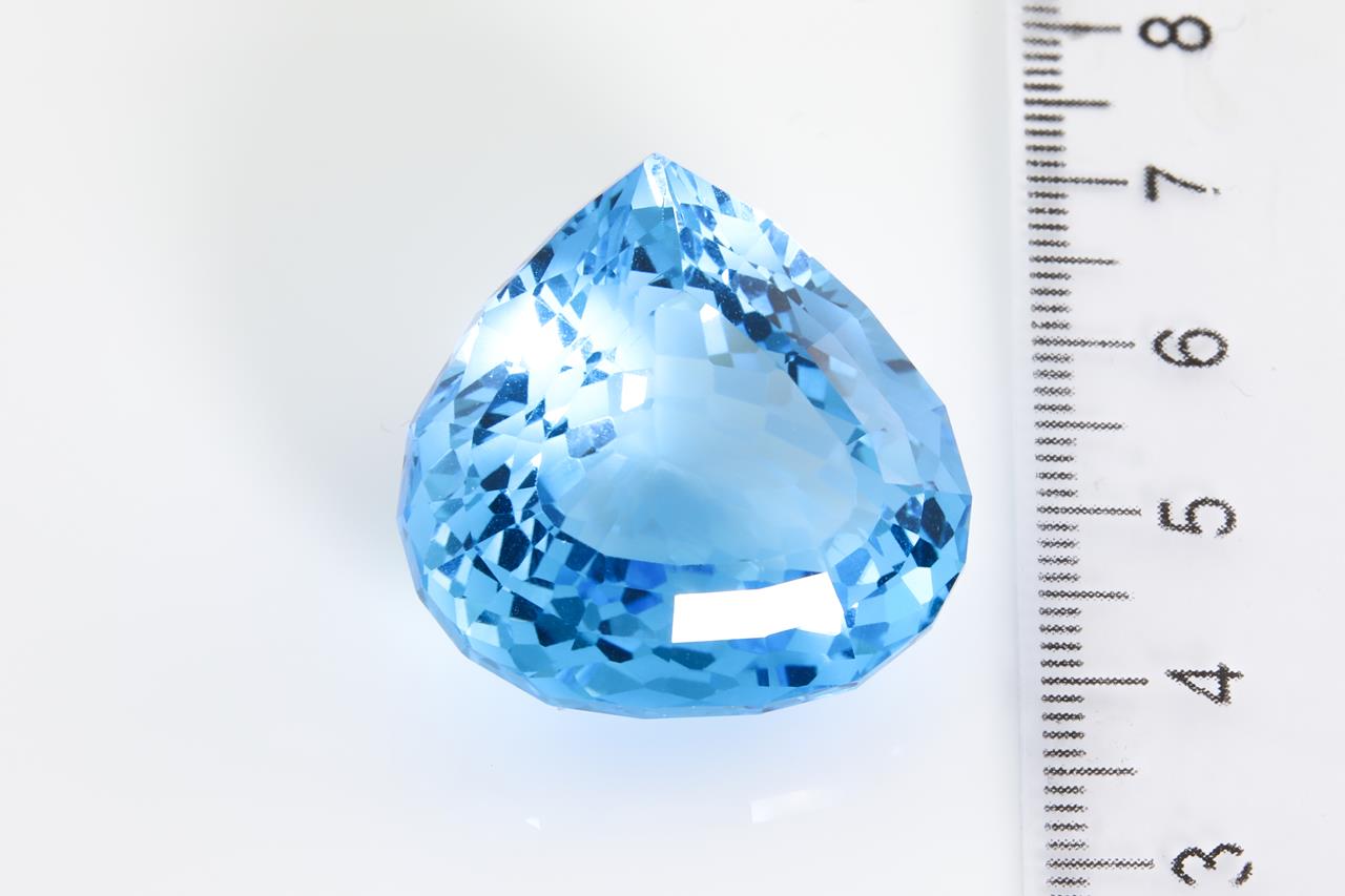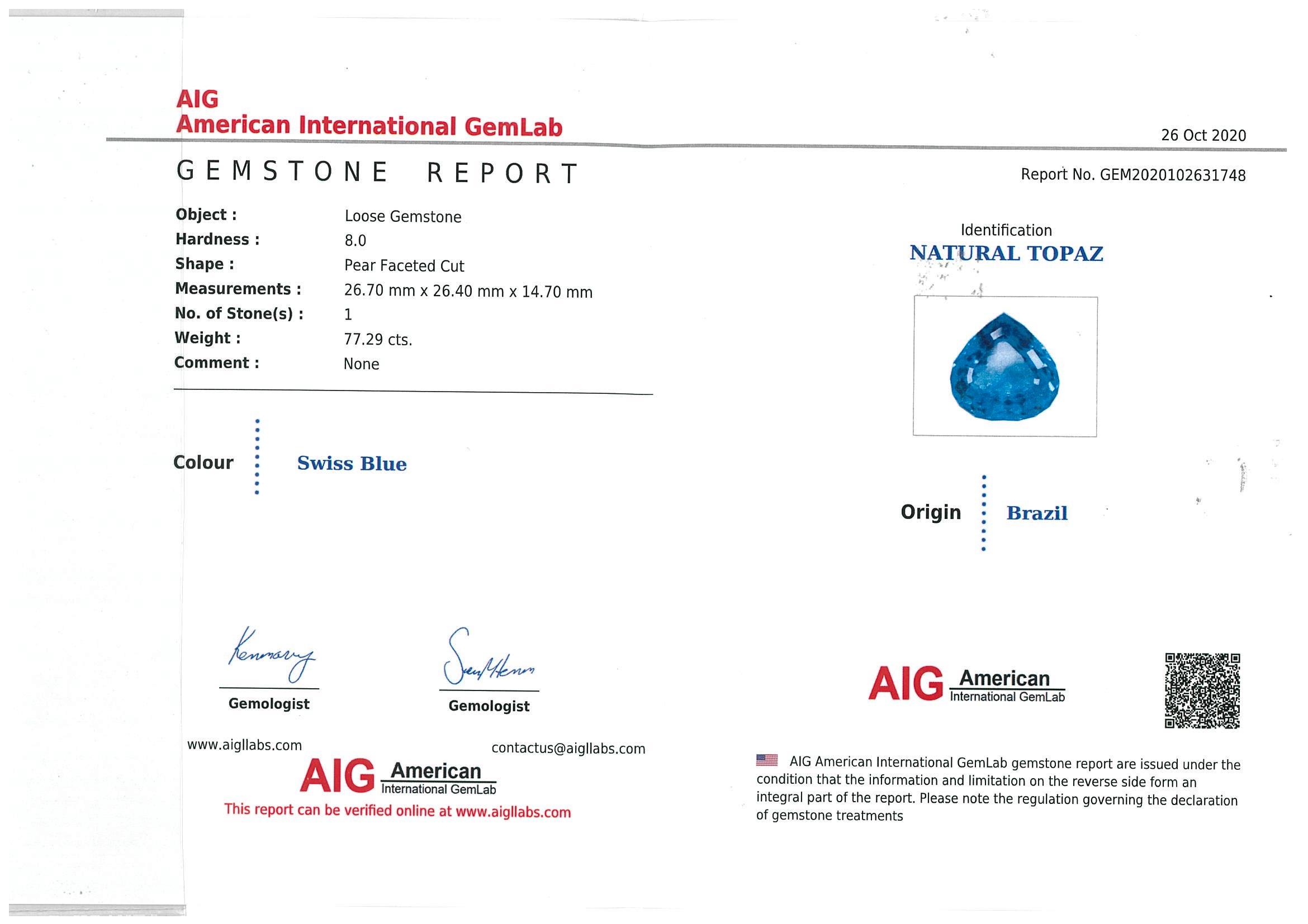 A loose pear faceted cut Natural Topaz of 77.29ct (with AIG report #GEM2020102631748). Size: 26.7 x 26.4 x 14.7mm. (New)