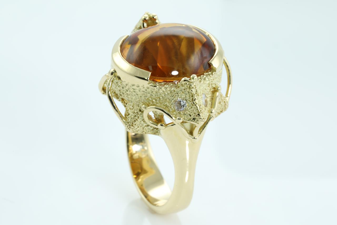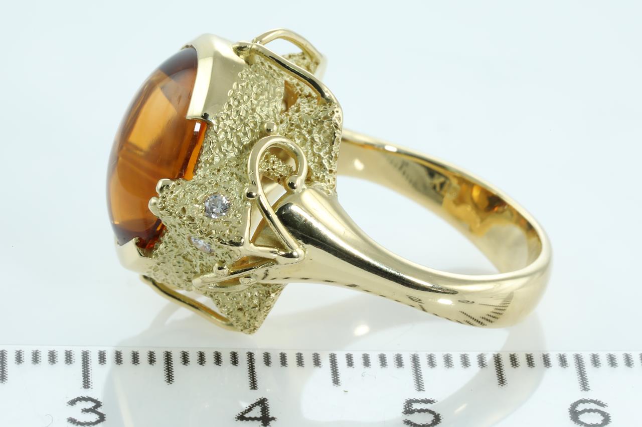 Citrine and Diamond ring with oval cabochon shape (with faceted pavilion) Citrine of 7.75ct and Diamonds totalling 0.08cts. 18ct yellow gold. Ring size: M. Weight: 13.5g (Pre-owned)