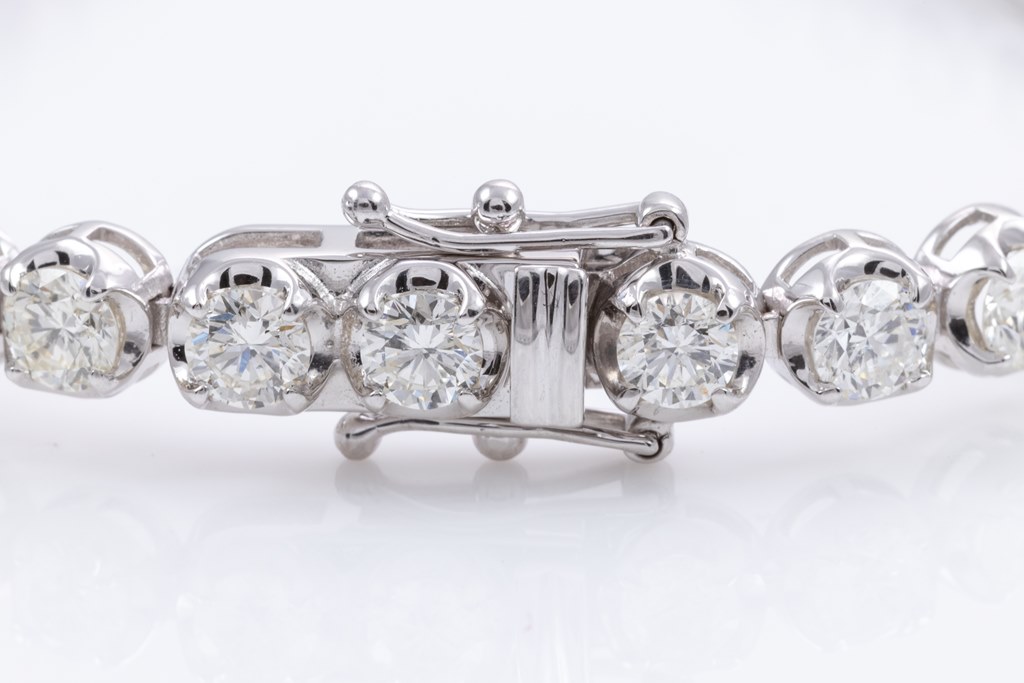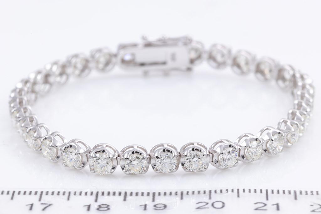 Diamond tennis bracelet with 32 round Diamonds totalling 7.75cts (Estimated grading: I-J SI). 18ct white gold. Length: 18cm. Weight: 14.1g. With certificate #415547. (New)