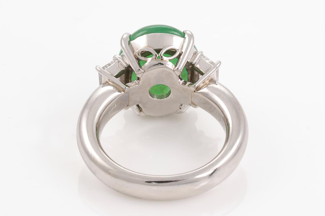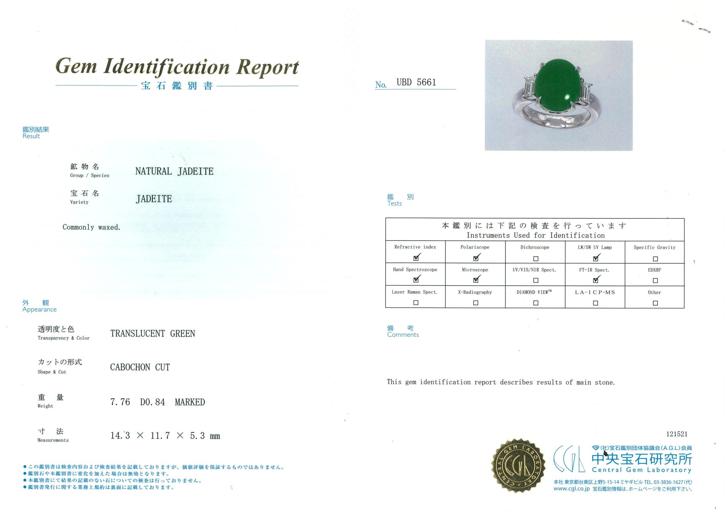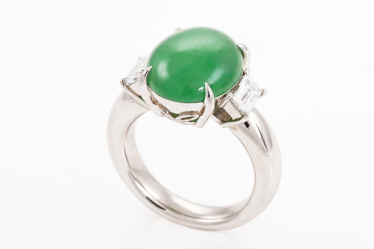 Jade and Diamond Ring with oval cabochon cut translucent green natural Type A Jadeite Jade of 7.76ct and 2 baguette cut Diamonds totalling 0.84cts (Estimated grading: G VS). Platinum. Ring size M. Weight: 16.9g. With Gem Identification Report #UBD5661. (Pre-owned)