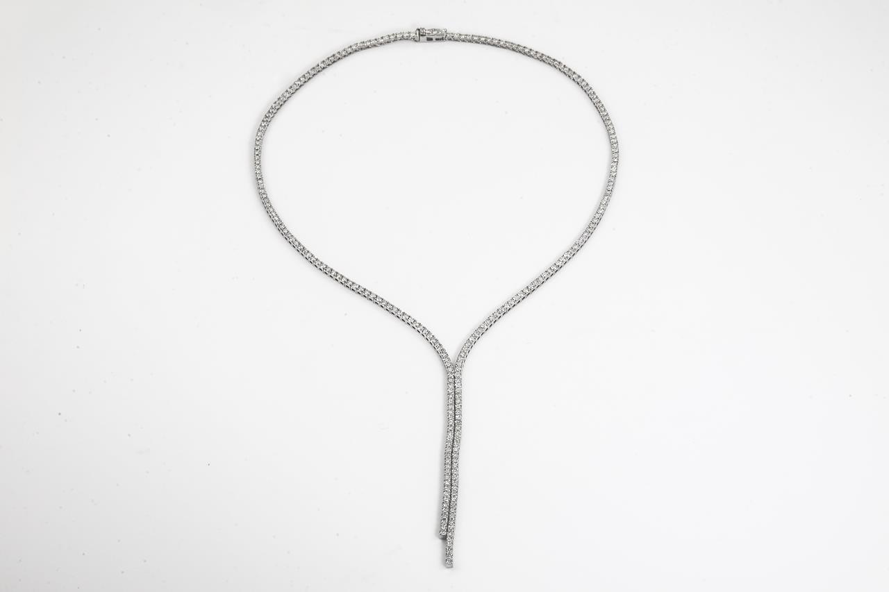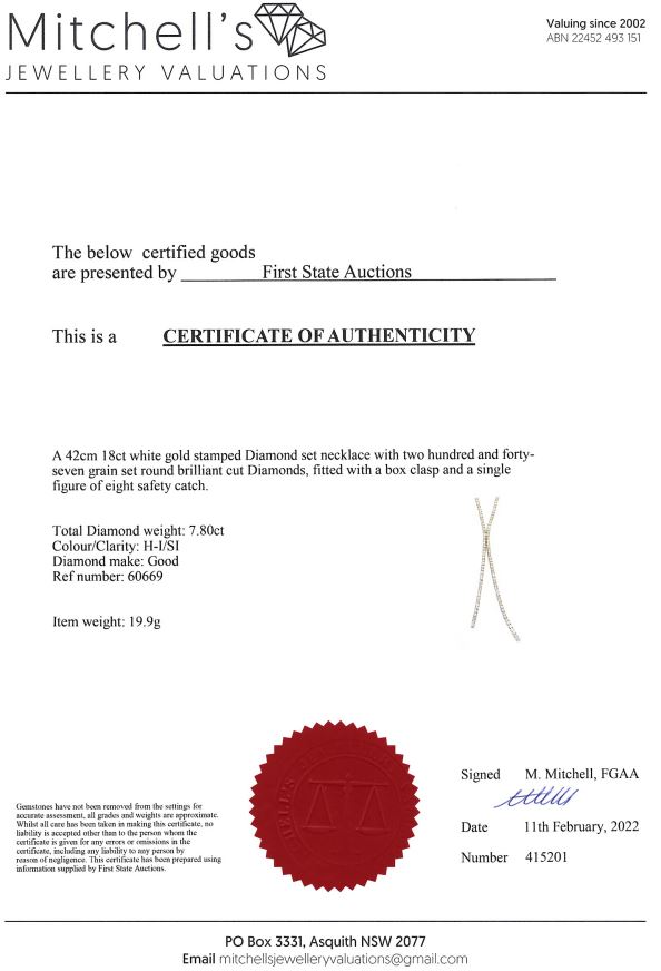 Diamond necklace with 247 round Diamonds totalling 7.80cts (Estimated grading: H-I SI). 18ct white gold. Length: 42cm. Weight: 19.9g. With certificate #415201. (New)