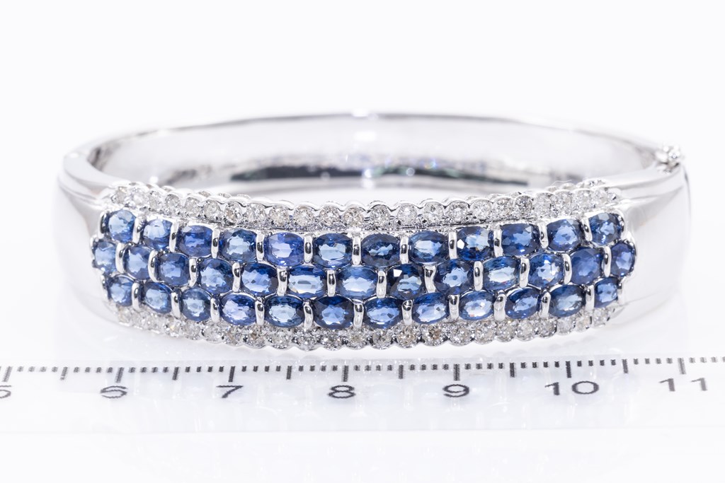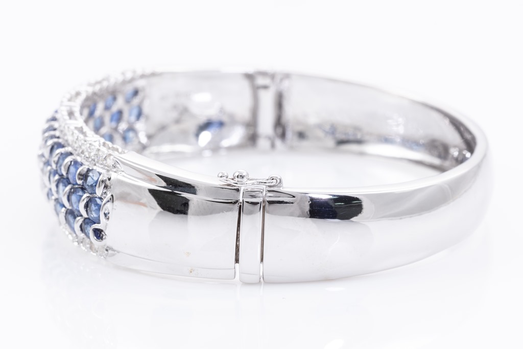 Sapphire and Diamond bangle with oval blue Sapphires totalling 7.87cts and round Diamonds totalling 0.79cts (Estimated grading: K-L SI). 18ct white gold. Circumference: 16.5cm. Weight: 35.8g. With Certificate #415724. (Pre-owned)