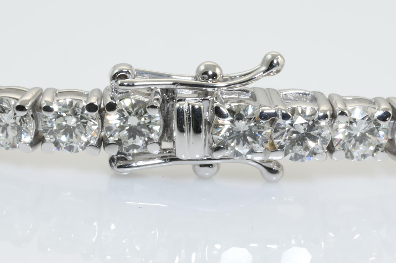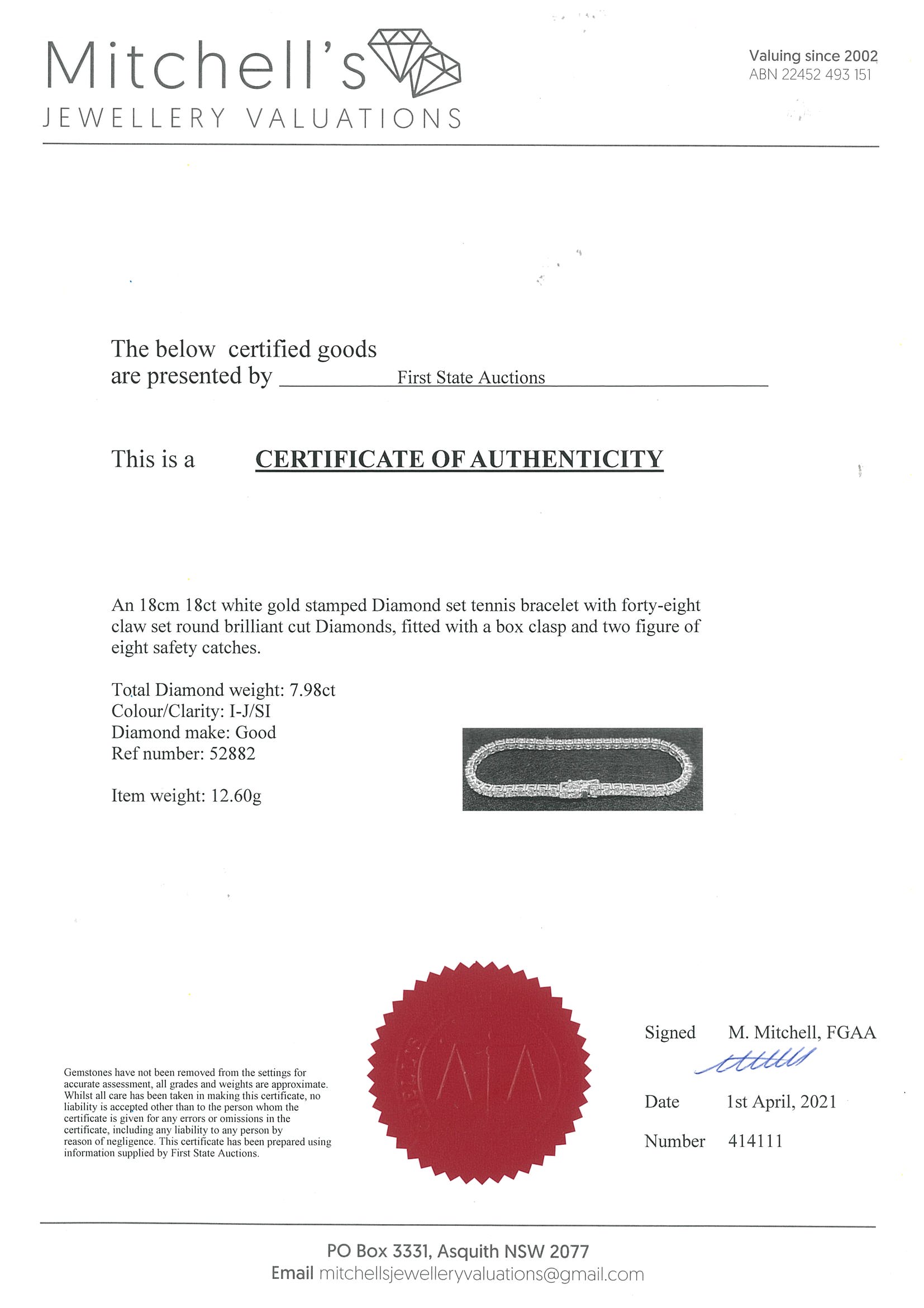 Diamond tennis bracelet with 48 round Diamonds totalling 7.98cts (Estimated grading: I-J SI). 18ct white gold. Length: 18cm Weight: 12.6g With certificate #414111. (New)