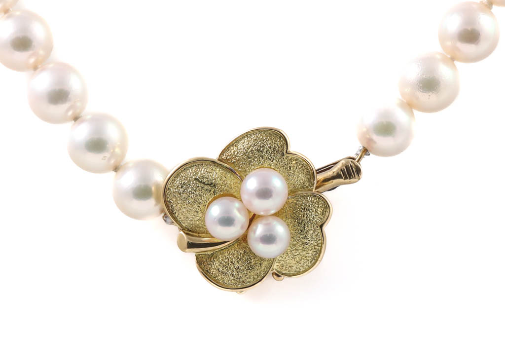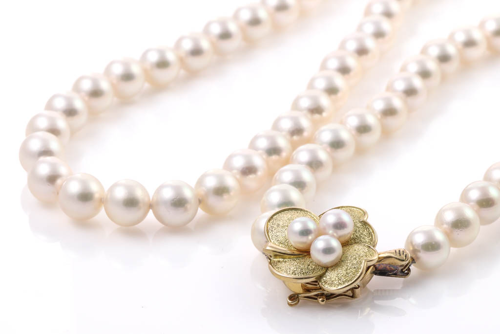 Pearl necklace with 114 Akoya Pearls of 7mm. 18ct yellow gold clasp with 3 Akoya Pearls of 4.7-5.3mm. Length: 85cm. Weight: 67.1g. (Pre-owned)