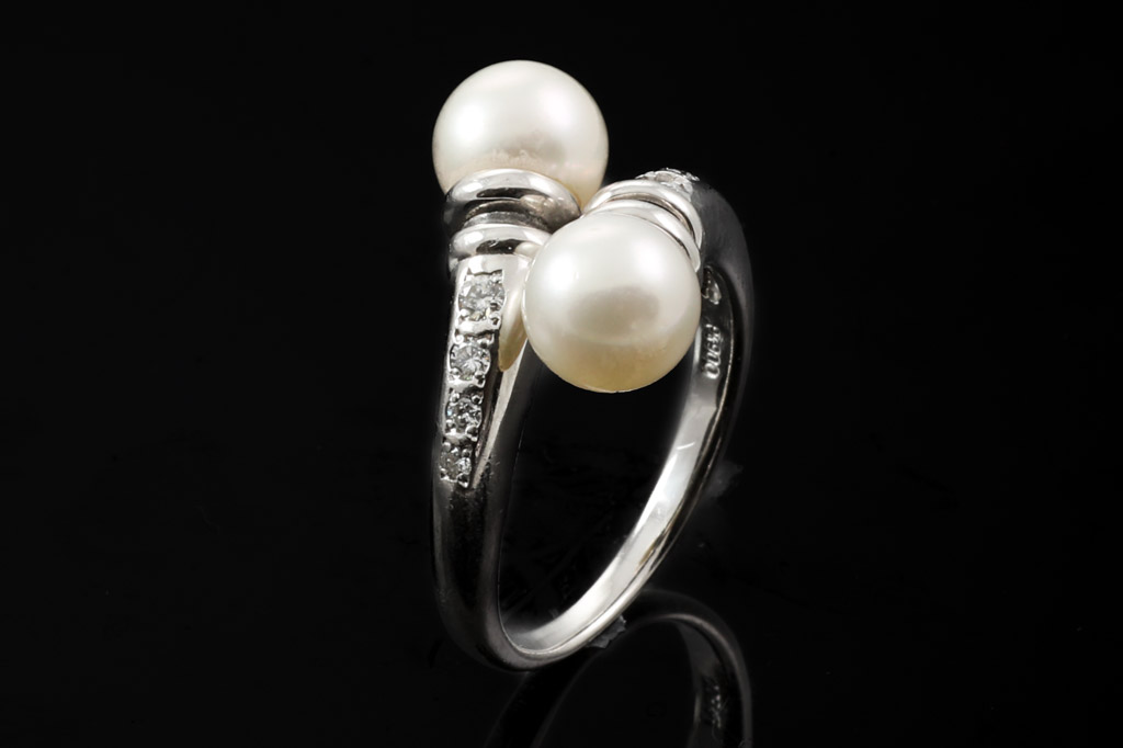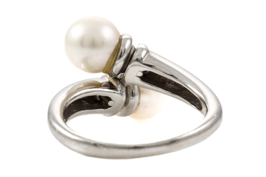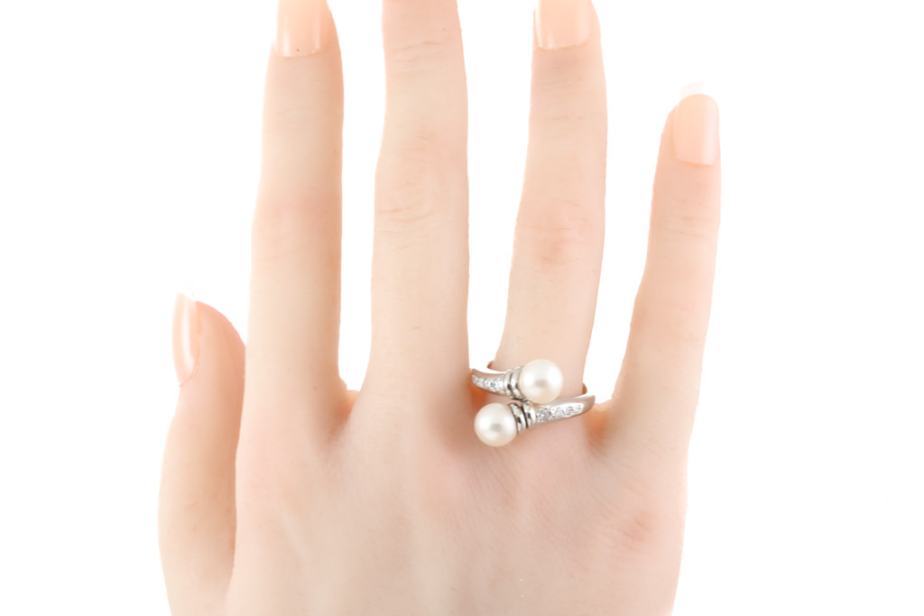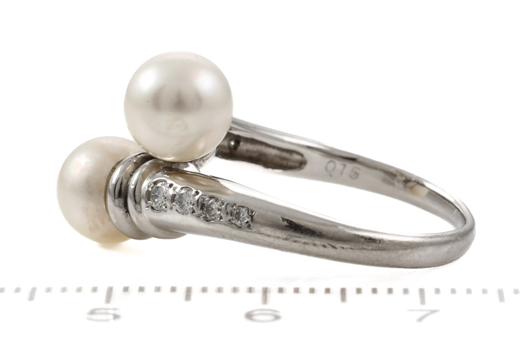 Pearl and Diamond ring with two white Cultured Pearls of 7.00mm and Diamonds totalling 0.15cts. Platinum-900. Ring size N - ring resizing is not recommended. Weight: 9.2g (Pre-owned)