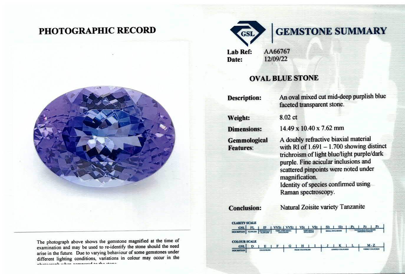 A loose oval shape Tanzanite of 8.02ct. Dimensions:14.49mm x 10.40mm x 7.62mm. With GSL Summary Report #AA66767. (As New)