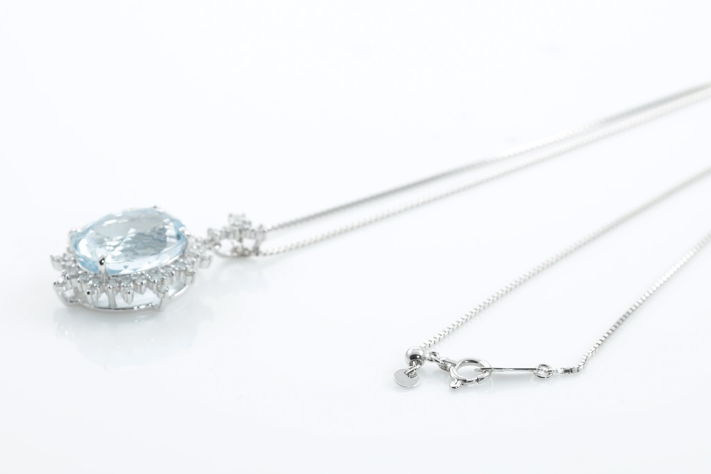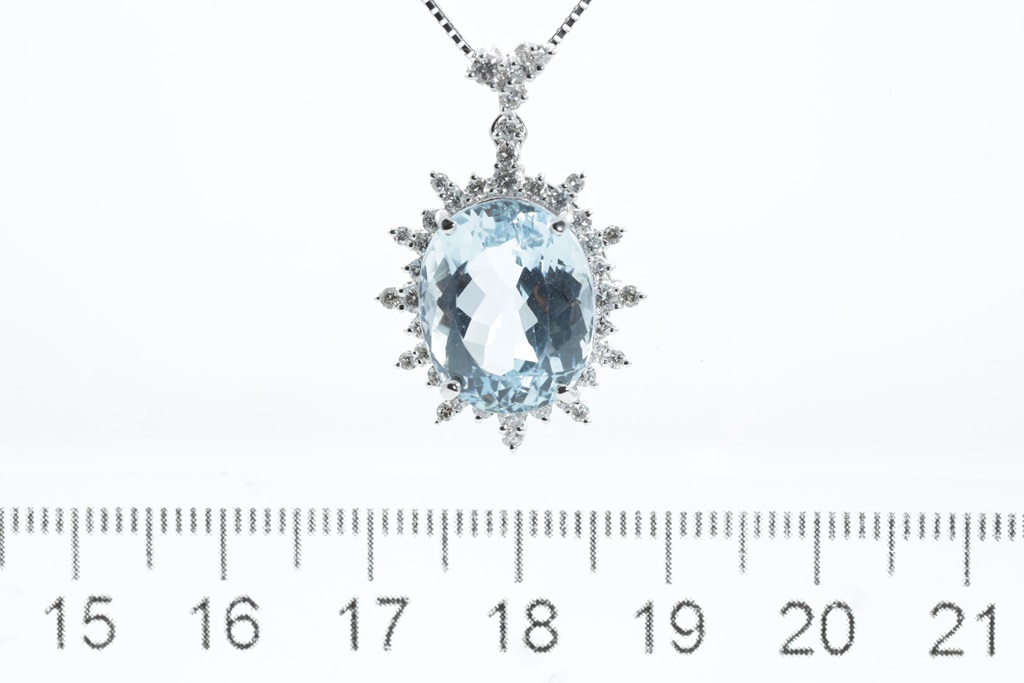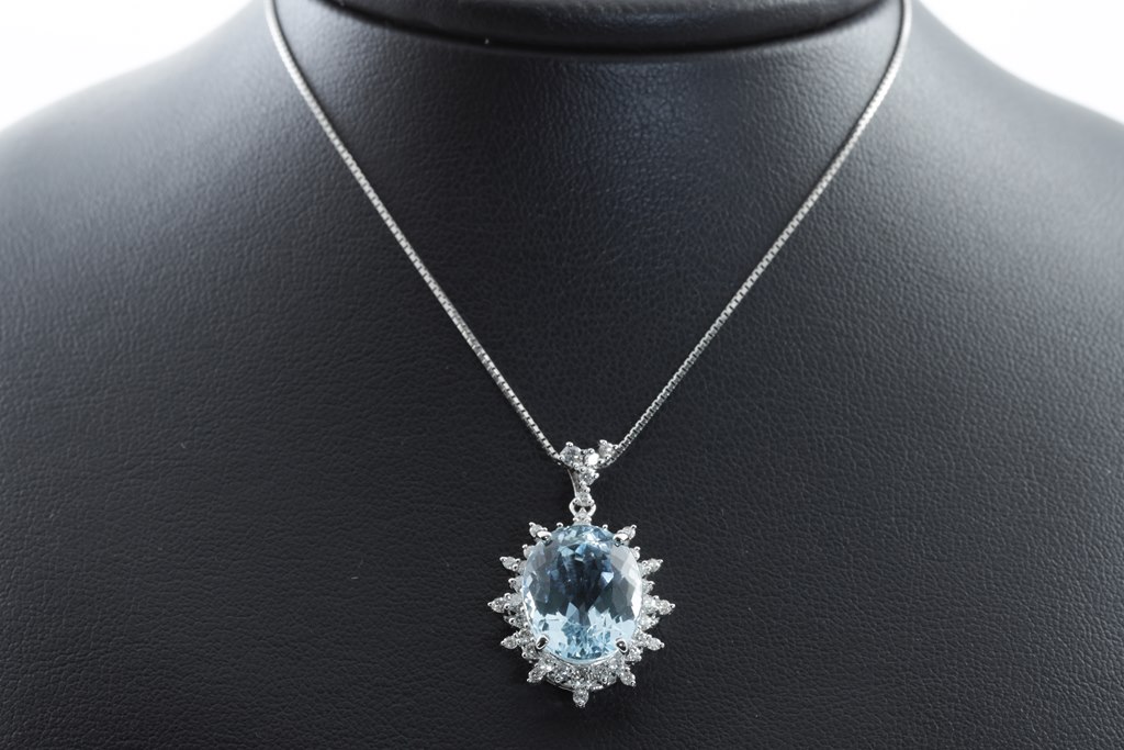 Aquamarine and Diamond Pendant with oval shape Aquamarine of 8.03ct and round Diamonds totalling 0.61cts (Estimated grading: H-I SI). Platinum with 18ct white gold 44cm adjustable chain. Weight: 9.2g. (Pre-owned)