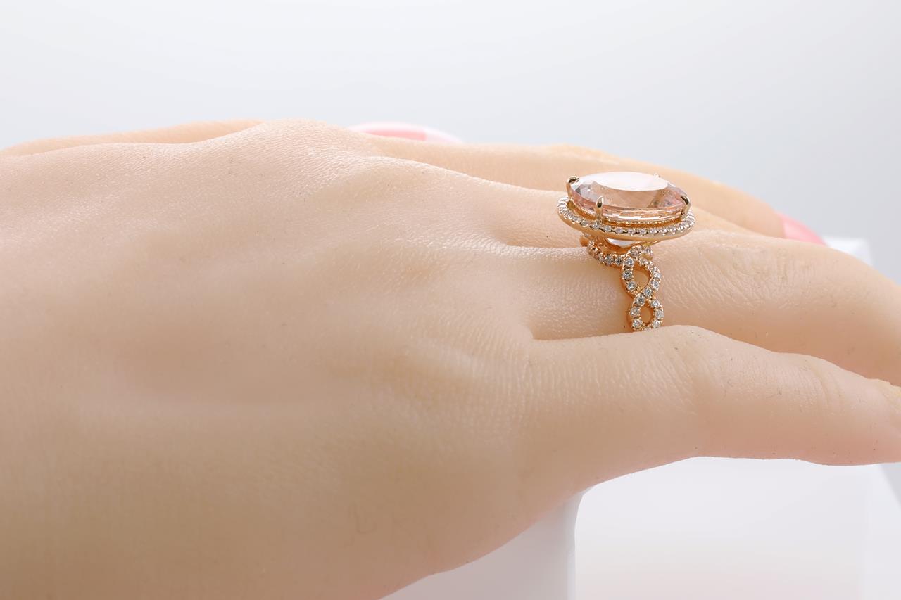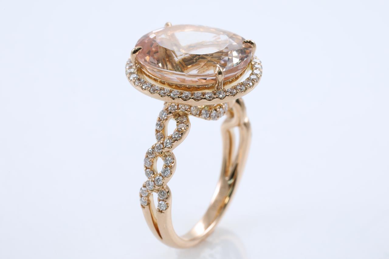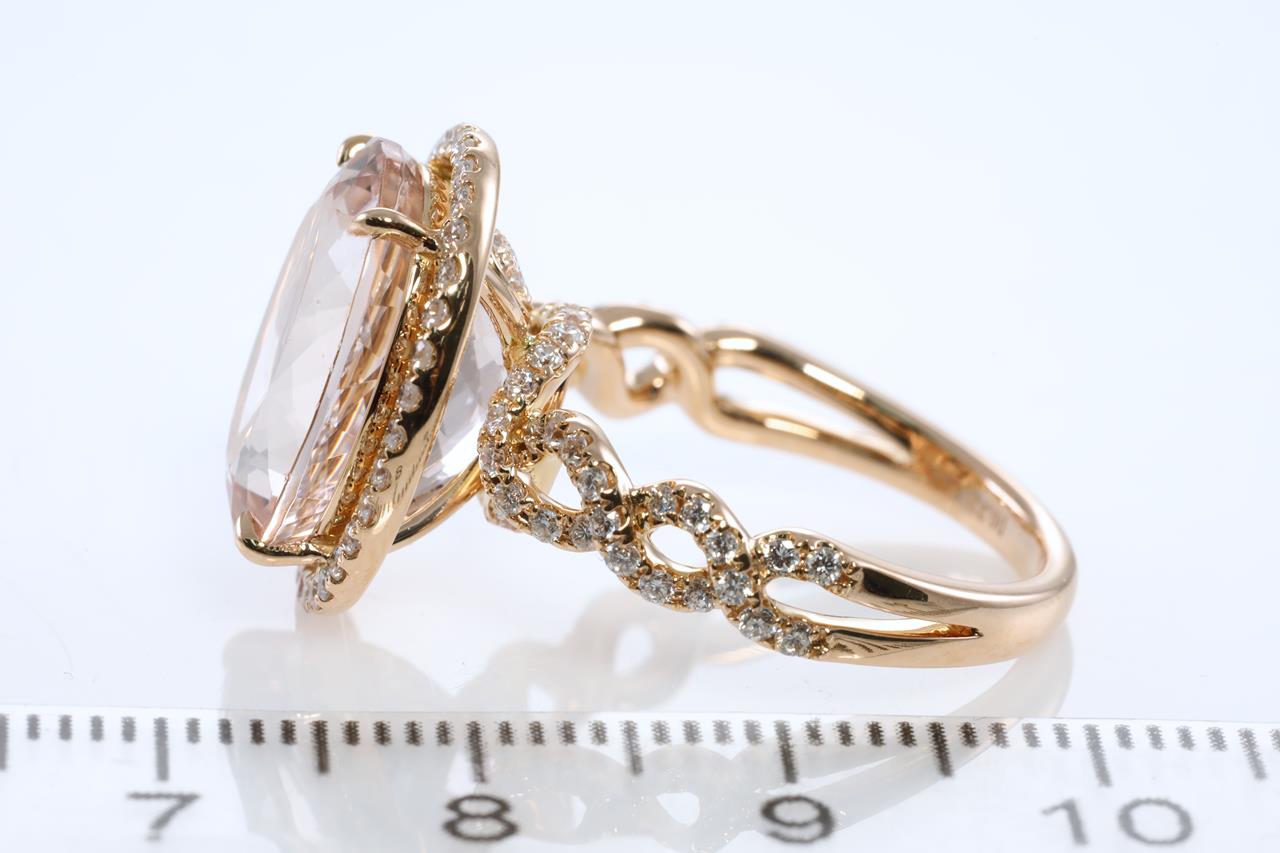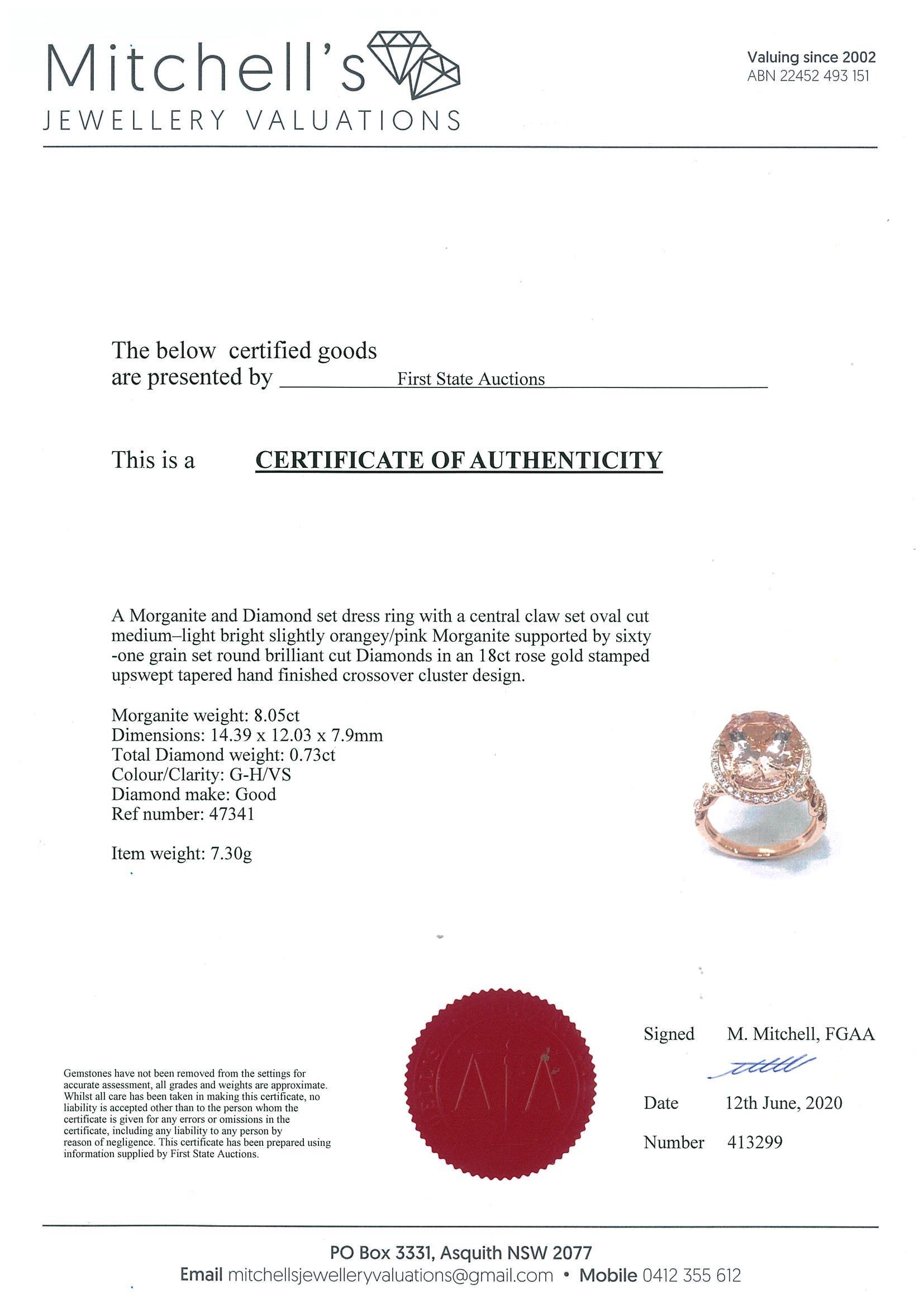 Morganite and Diamond ring with oval shape Morganite of 8.05ct and Diamonds totalling 0.73cts (Estimated grading: G-H VS). 18ct gold: rose gold. Ring size M. With Certificate #413299. Weight: 7.3g (Pre-owned)
