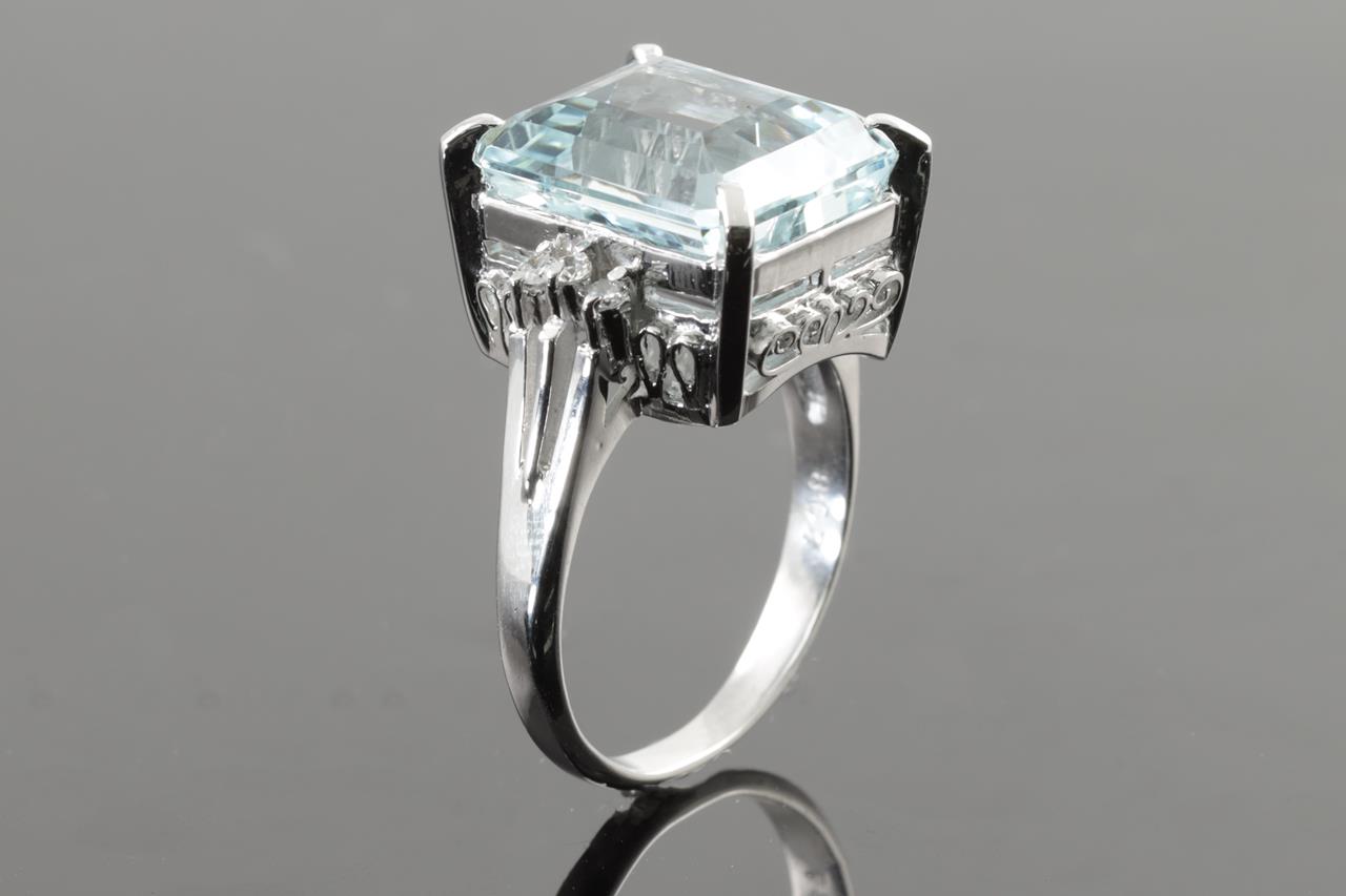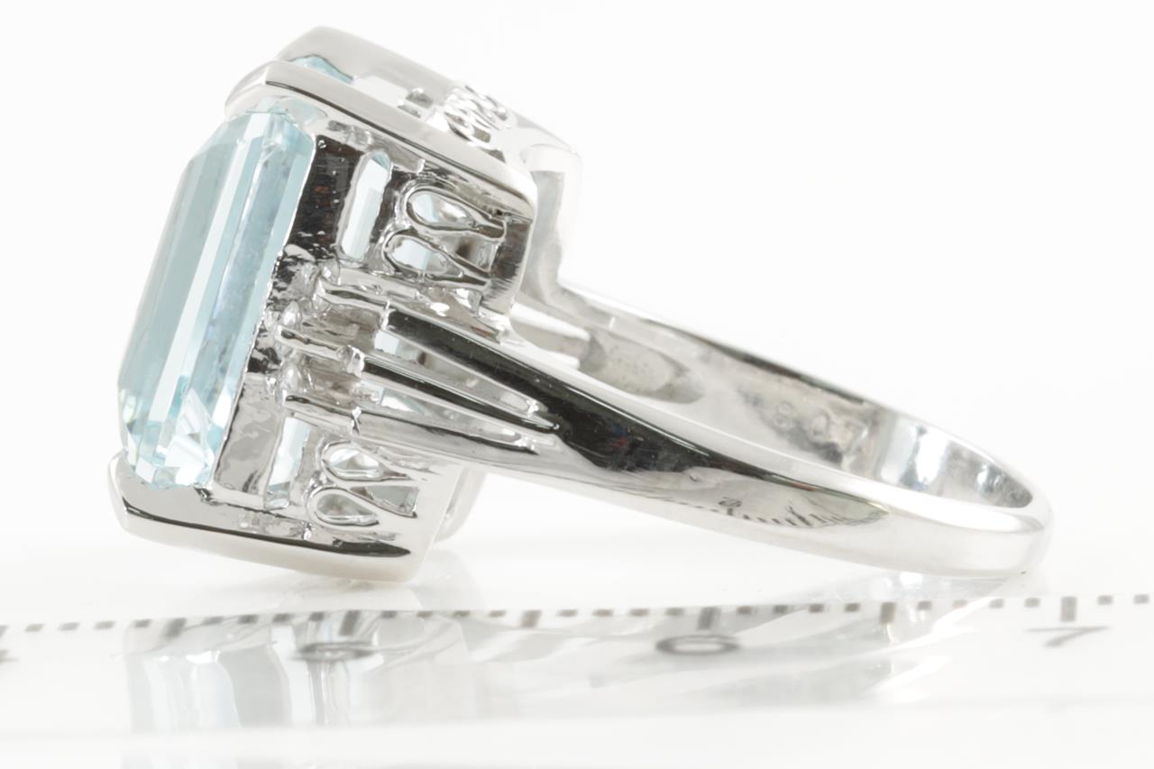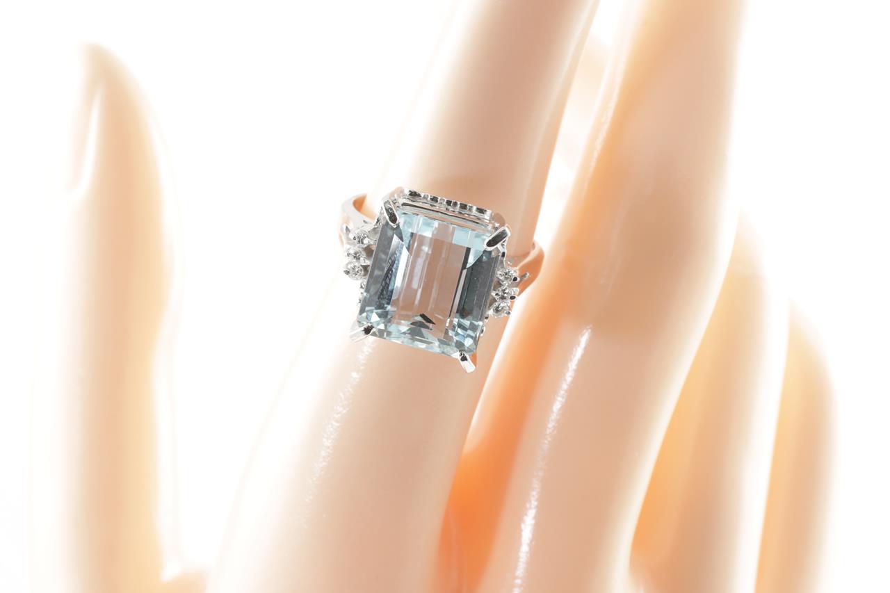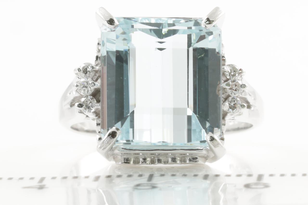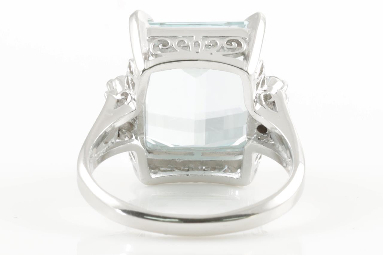 Aquamarine and Diamond ring with an emerald cut Aquamarine of 8.07ct and Diamonds totalling 0.10cts. Platinum. Ring size N. Weight: 9.1g. (Pre-owned)