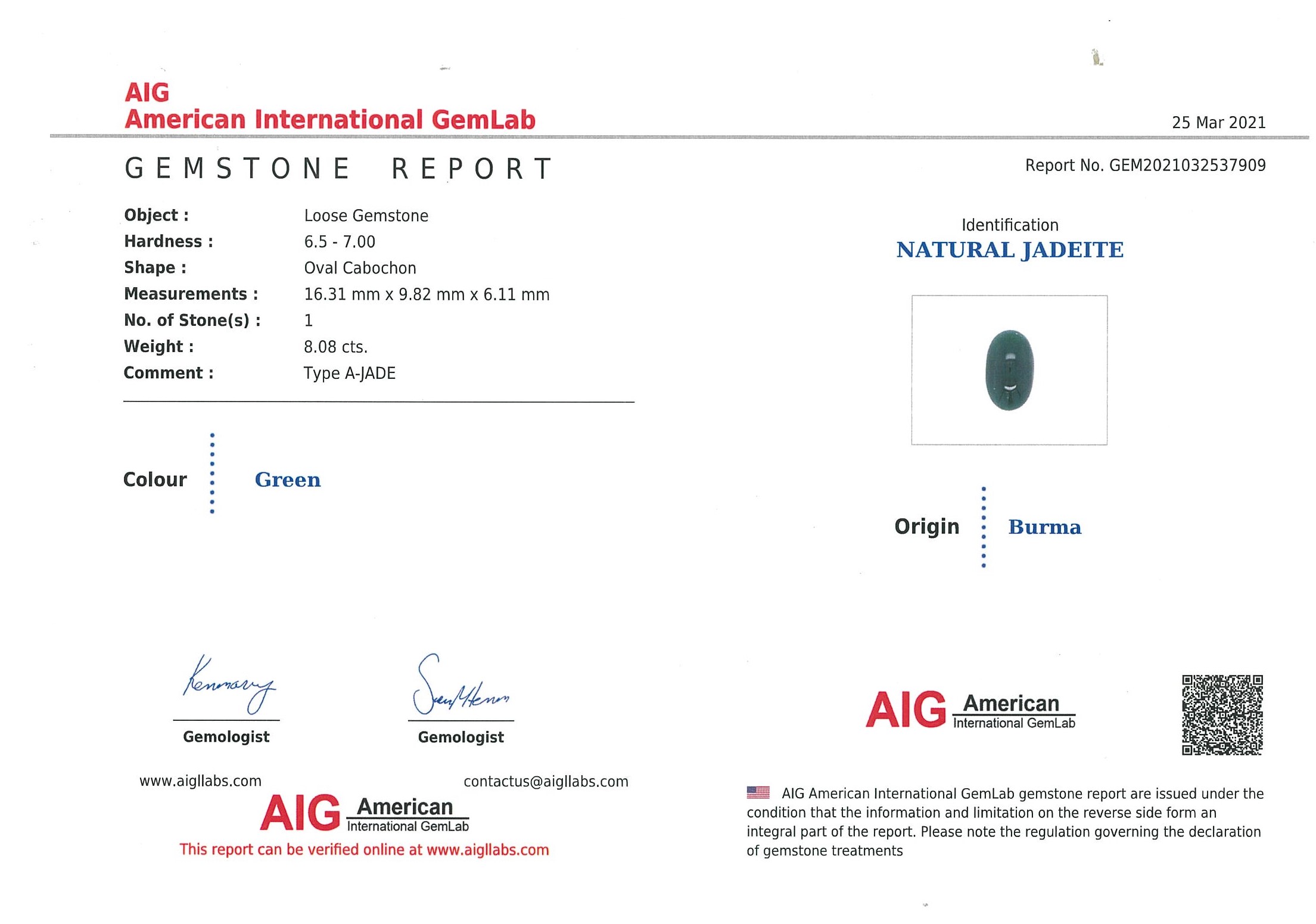 A loose oval cabochon cut Type A green Jadeite Jade of 8.08ct. With AIG report dated 25/03/2021. Origin: Burma. (As new)