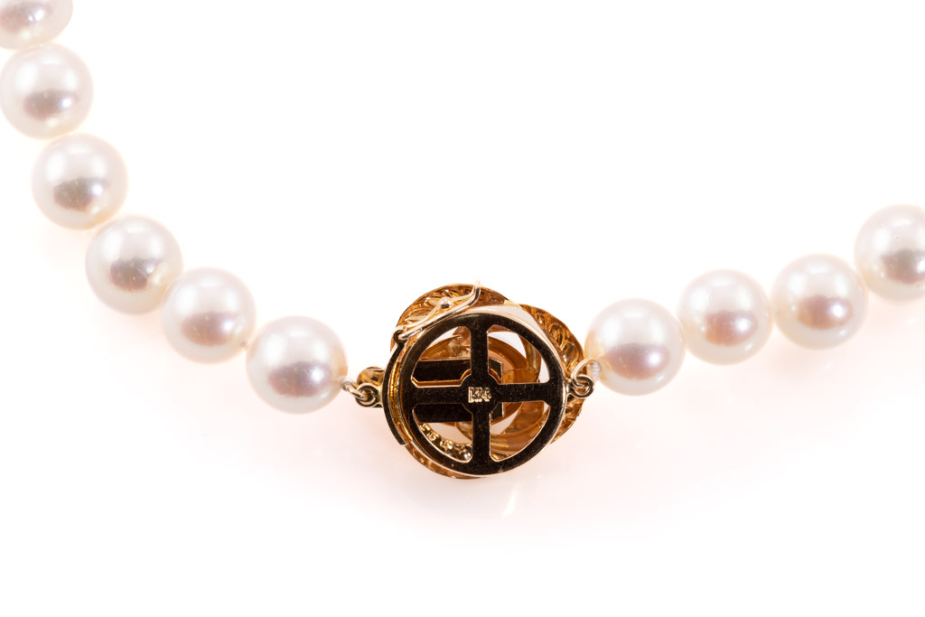 Pearl necklace with Akoya Pearls of 8.0mm - 8.4mm. 14ct yellow gold. Length: 43cm. Weight: 42.8g. (Pre-owned)