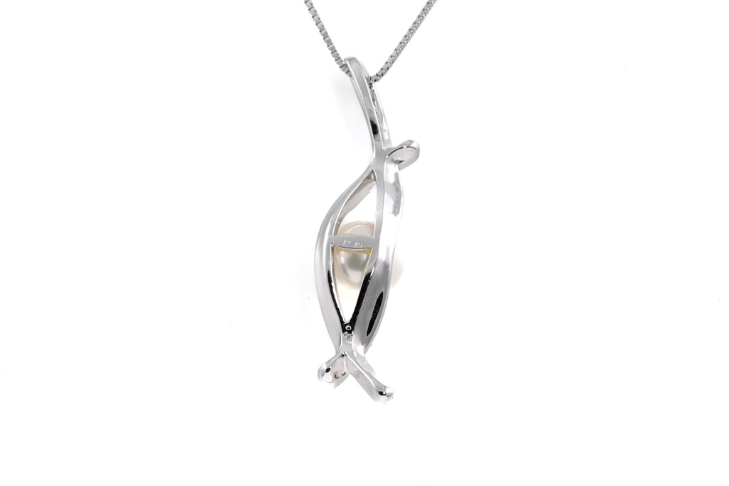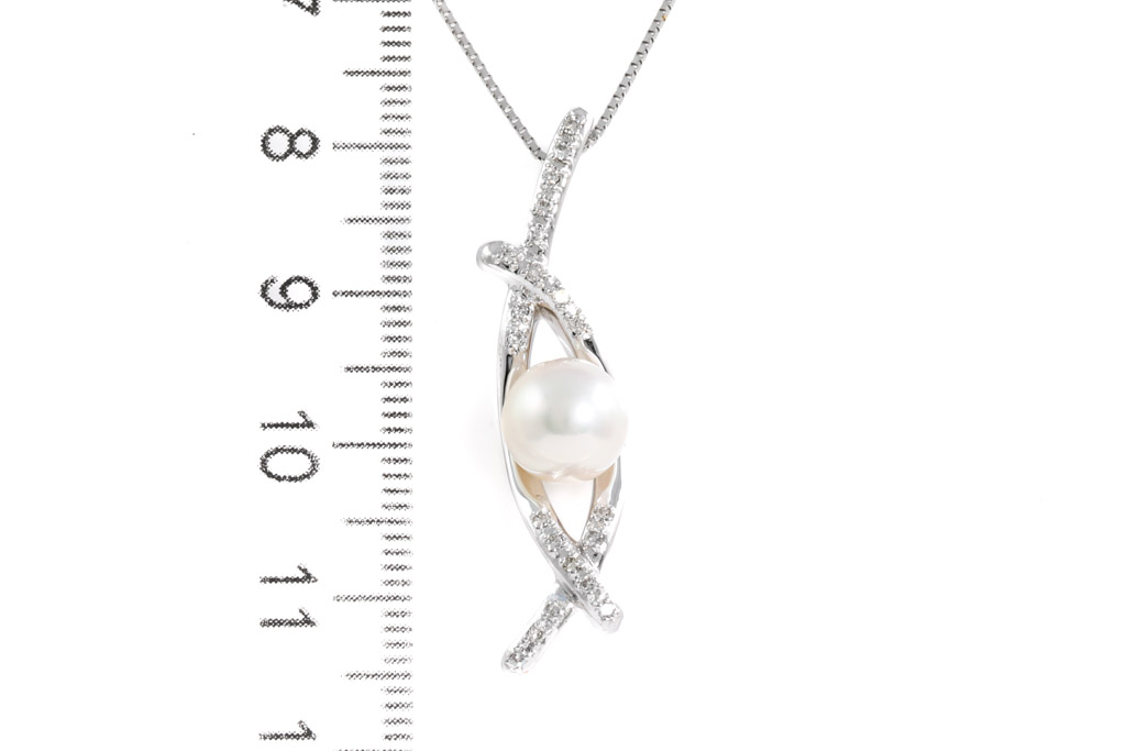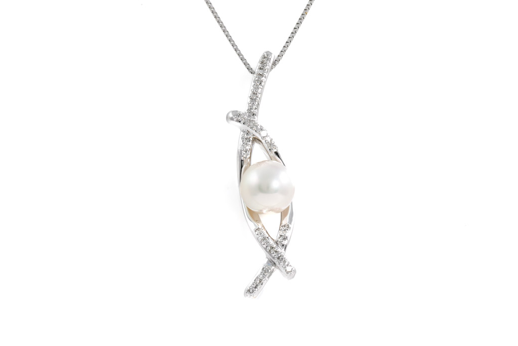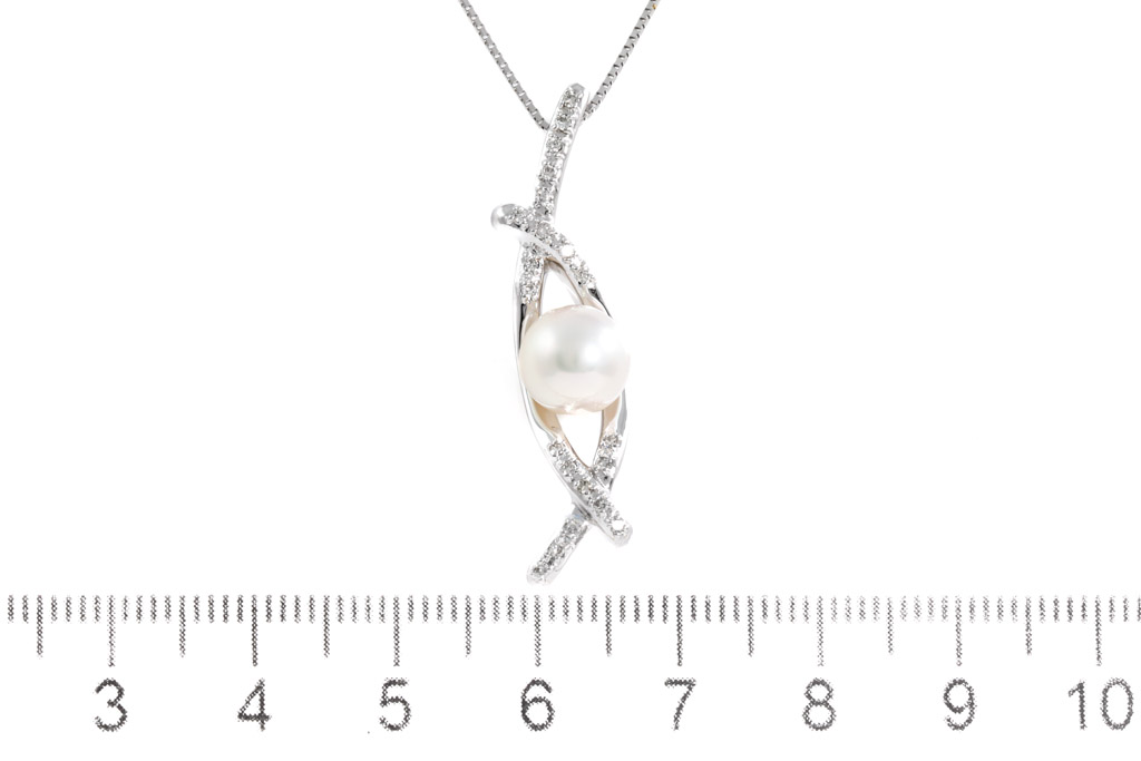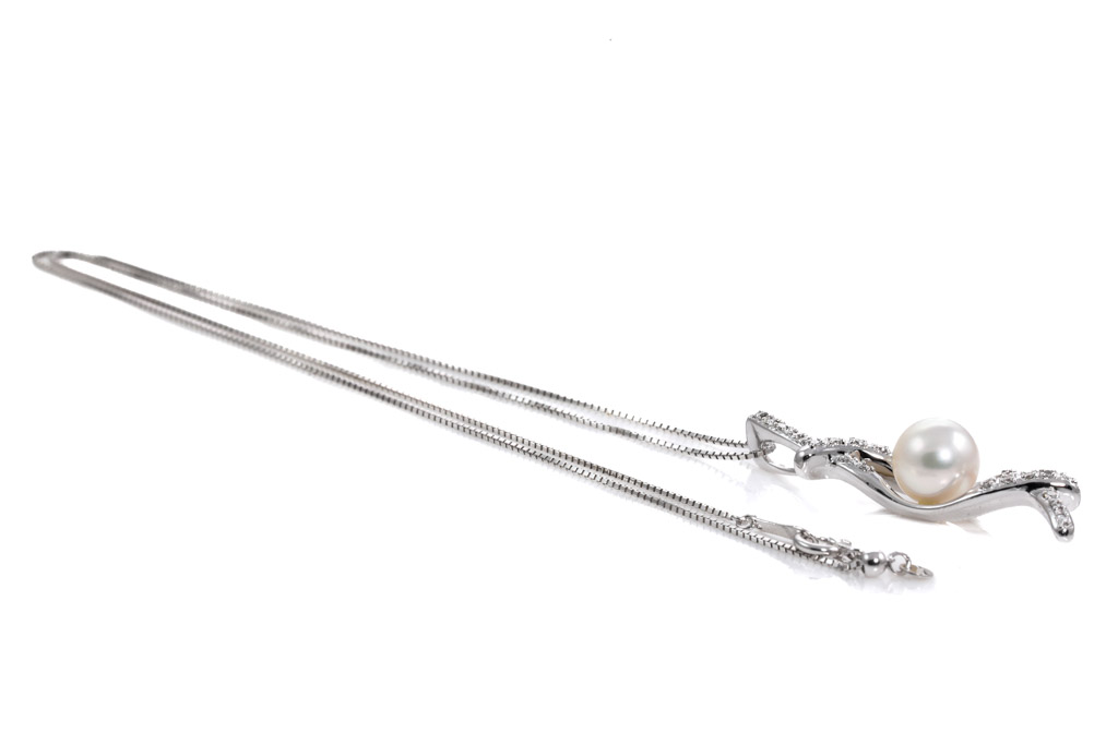 Pearl and Diamond pendant with Akoya Pearl of 8.0mm and round Diamonds totalling 0.15cts. 18ct white gold with 44cm 18ct white gold adjustable chain. Weight: 6.3g. (Pre-owned)