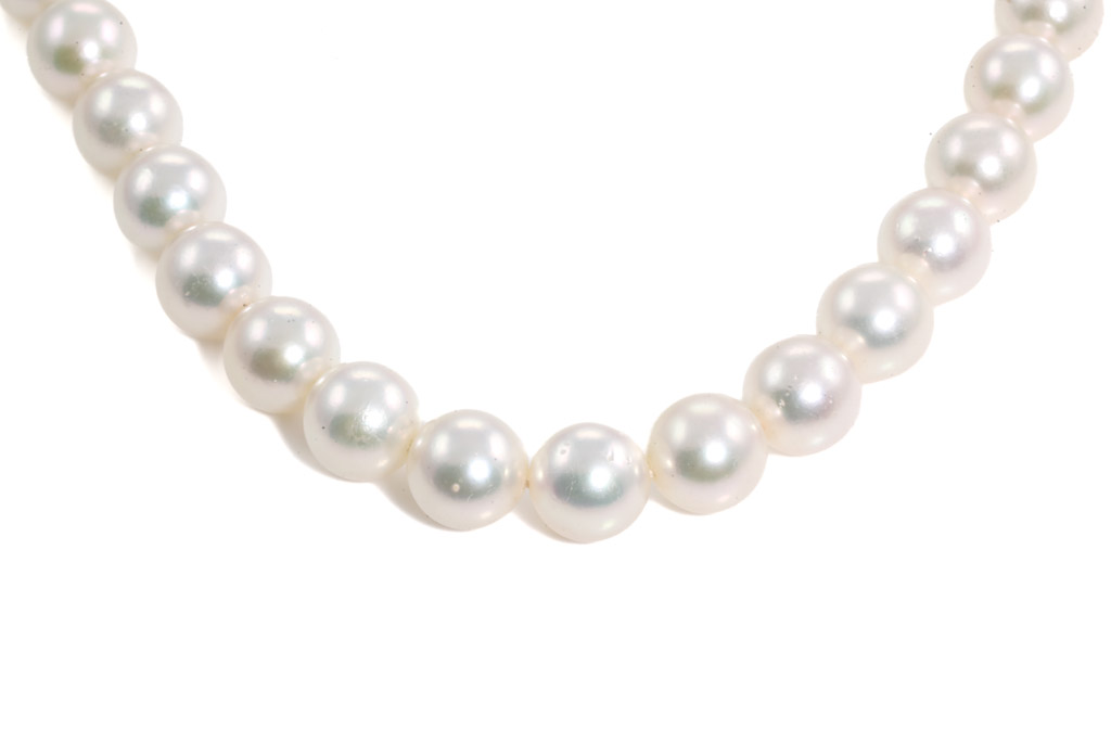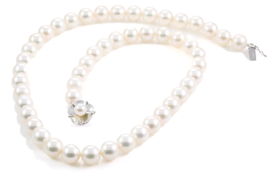 Akoya Pearl necklace with Akoya Pearls of 8.5 - 8.0mm. 14ct white gold clasp with a Akoya Pearl of 5.5mm. Length: 42cm. Weight: 40.9g.