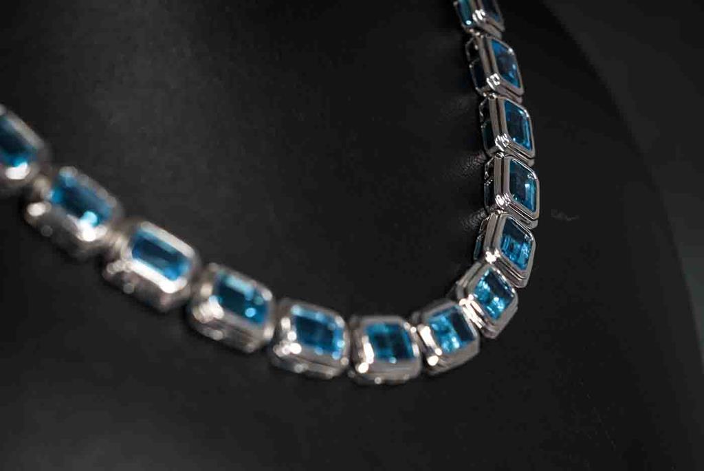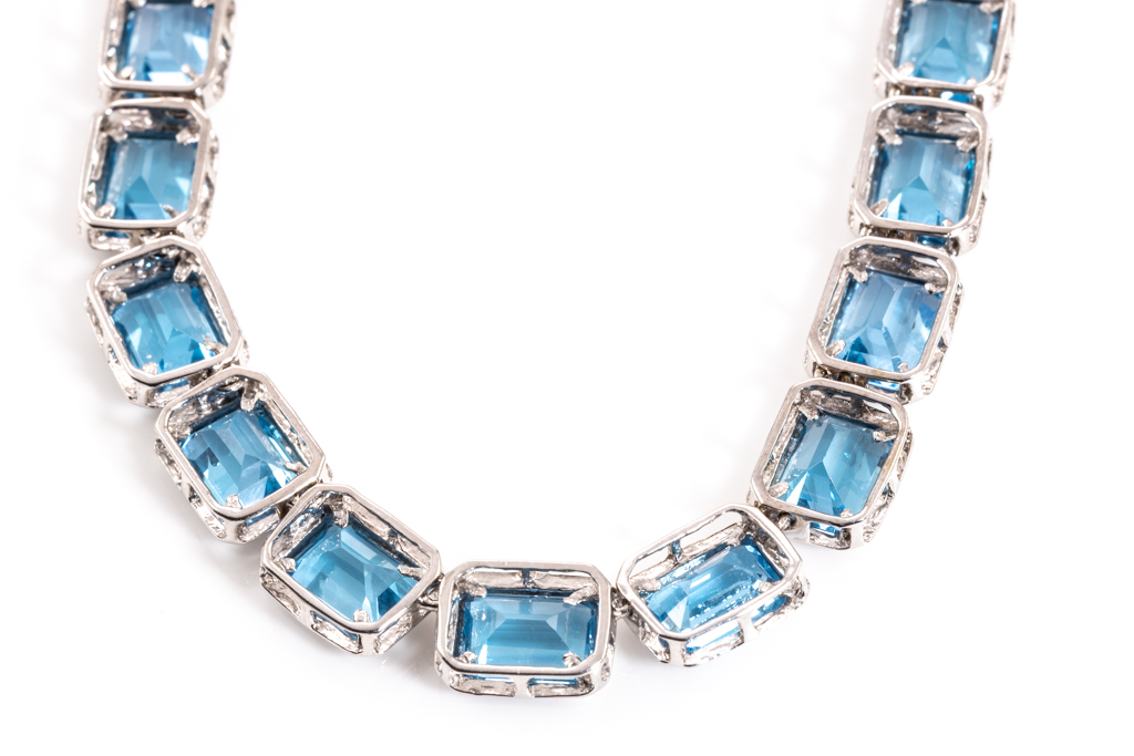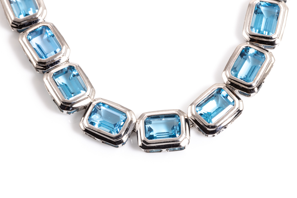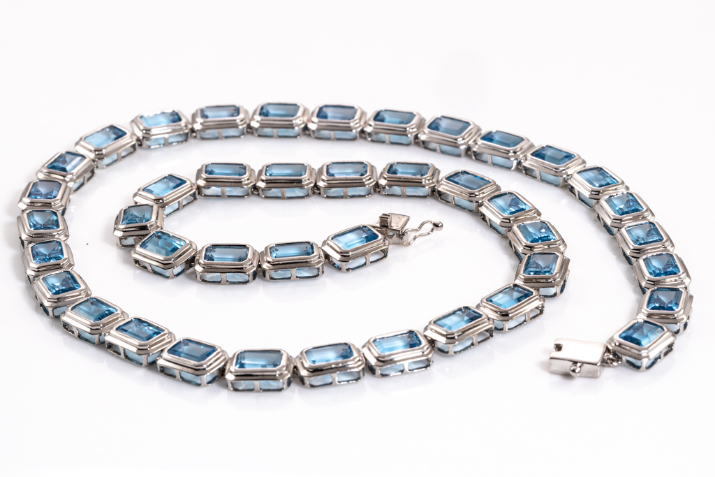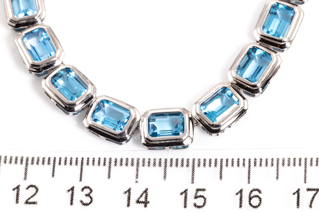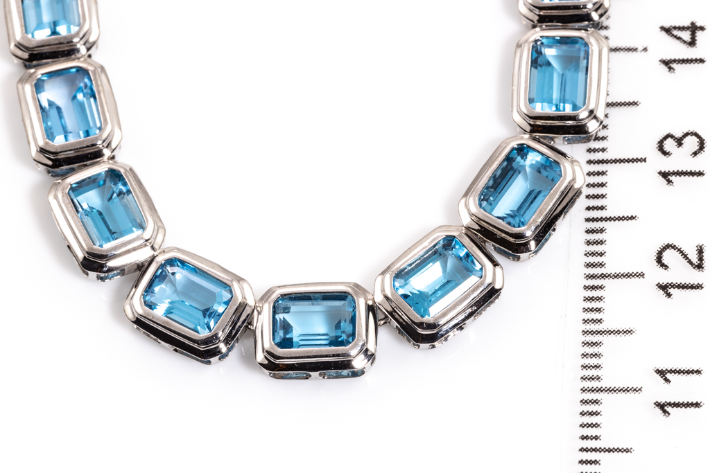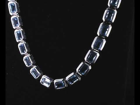 Topaz tennis design necklace with 42 emerald cut blue Topaz totalling approximately 81.06cts. 14ct white gold. Length: 42cm. Weight: 33g. (Pre-owned)