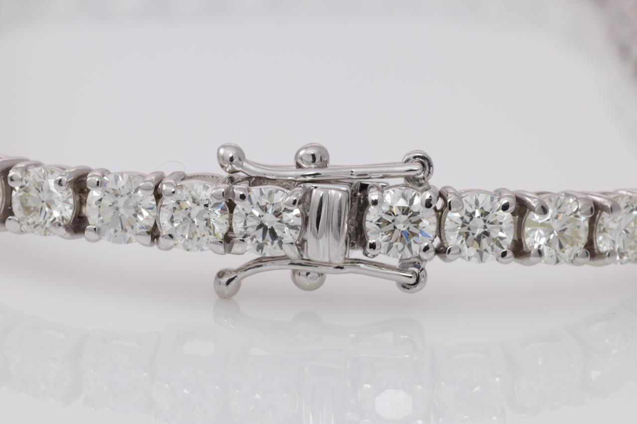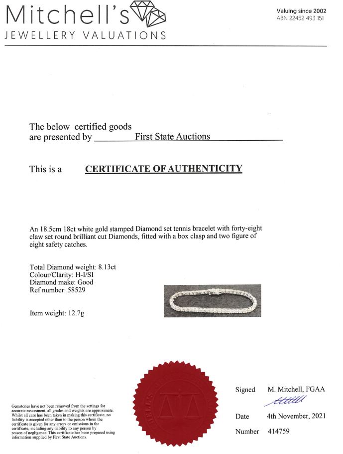 Diamond tennis bracelet with 48 round Diamonds totalling 8.13cts (Estimated grading: H-I SI). 18ct white gold. Length: 18.5cm. Weight: 12.7g. With certificate #414759. (New)