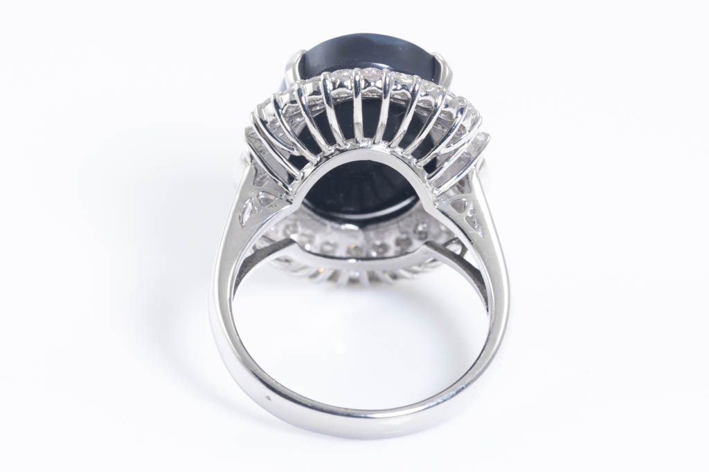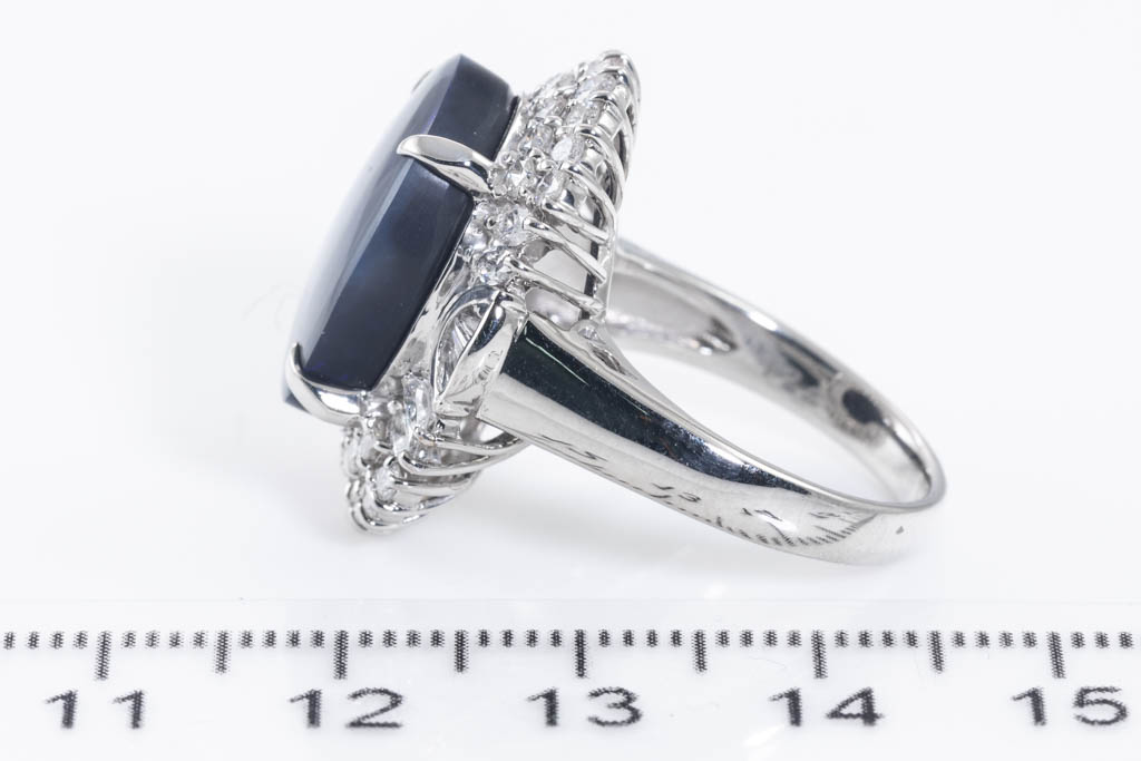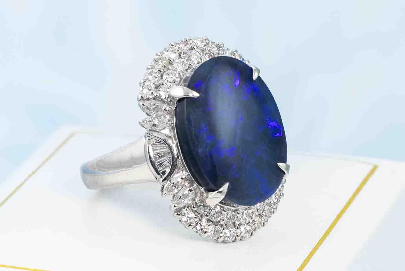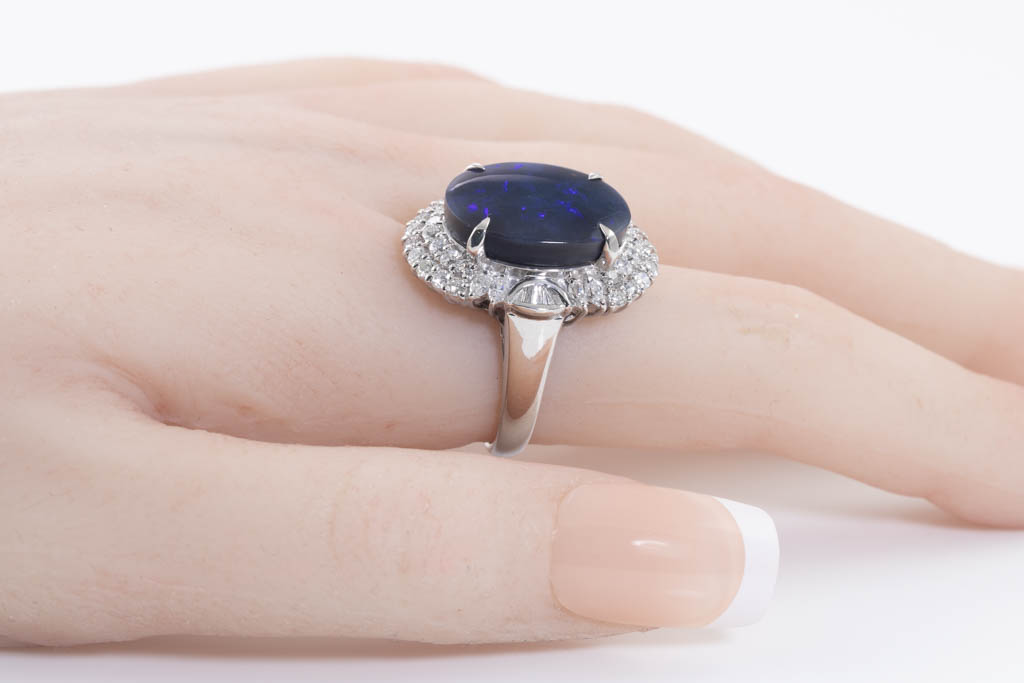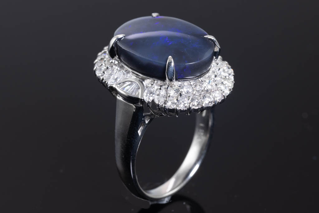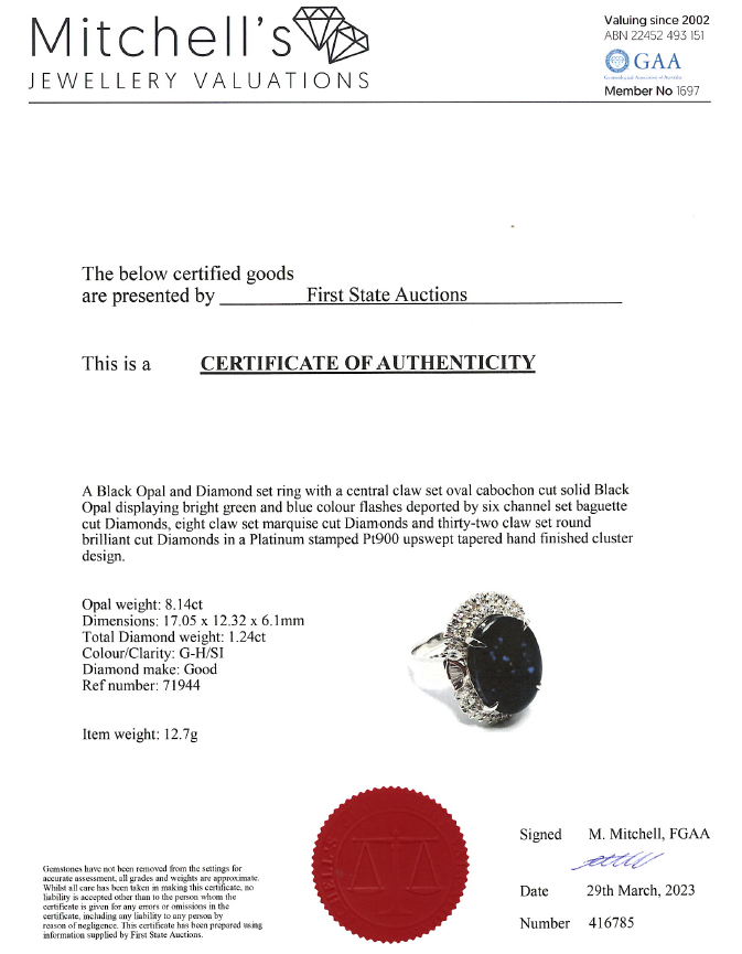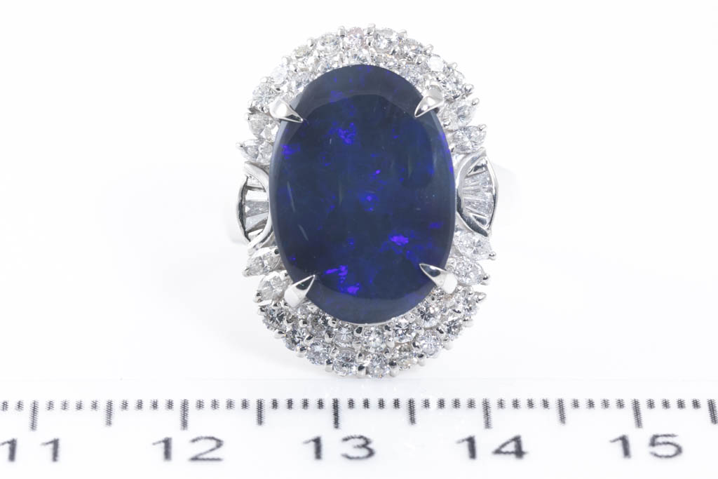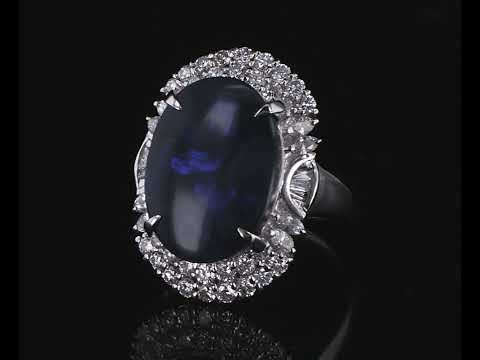 Black Opal and Diamond ring with oval solid Black Opal of 8.14ct and round, marquise & baguette cut Diamonds totalling 1.24cts (Estimated grading: G-H SI). Platinum. Ring size N. Weight: 12.7g. With Certificate #416785. (Pre-owned)