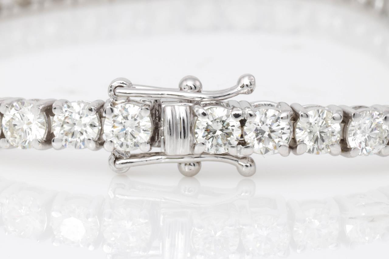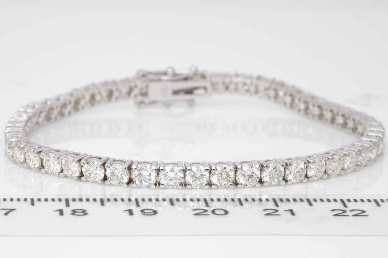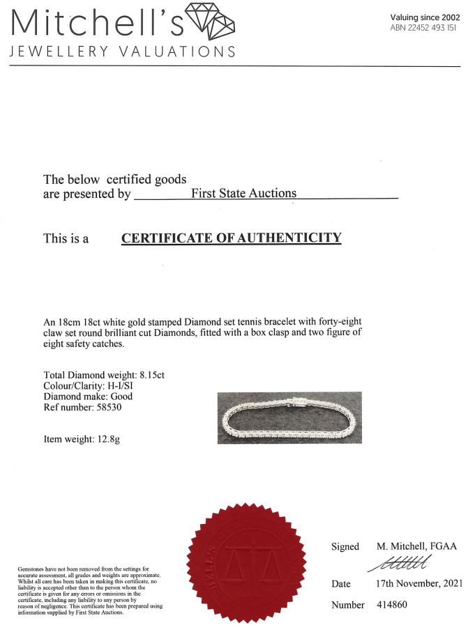 Diamond tennis bracelet with 48 round Diamonds totalling 8.15cts (Estimated grading: H-I SI). 18ct white gold. Length: 18cm. Weight: 12.8g. With certificate #414860. (New)