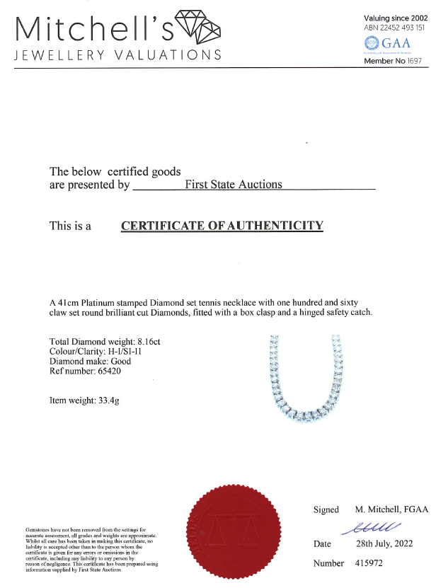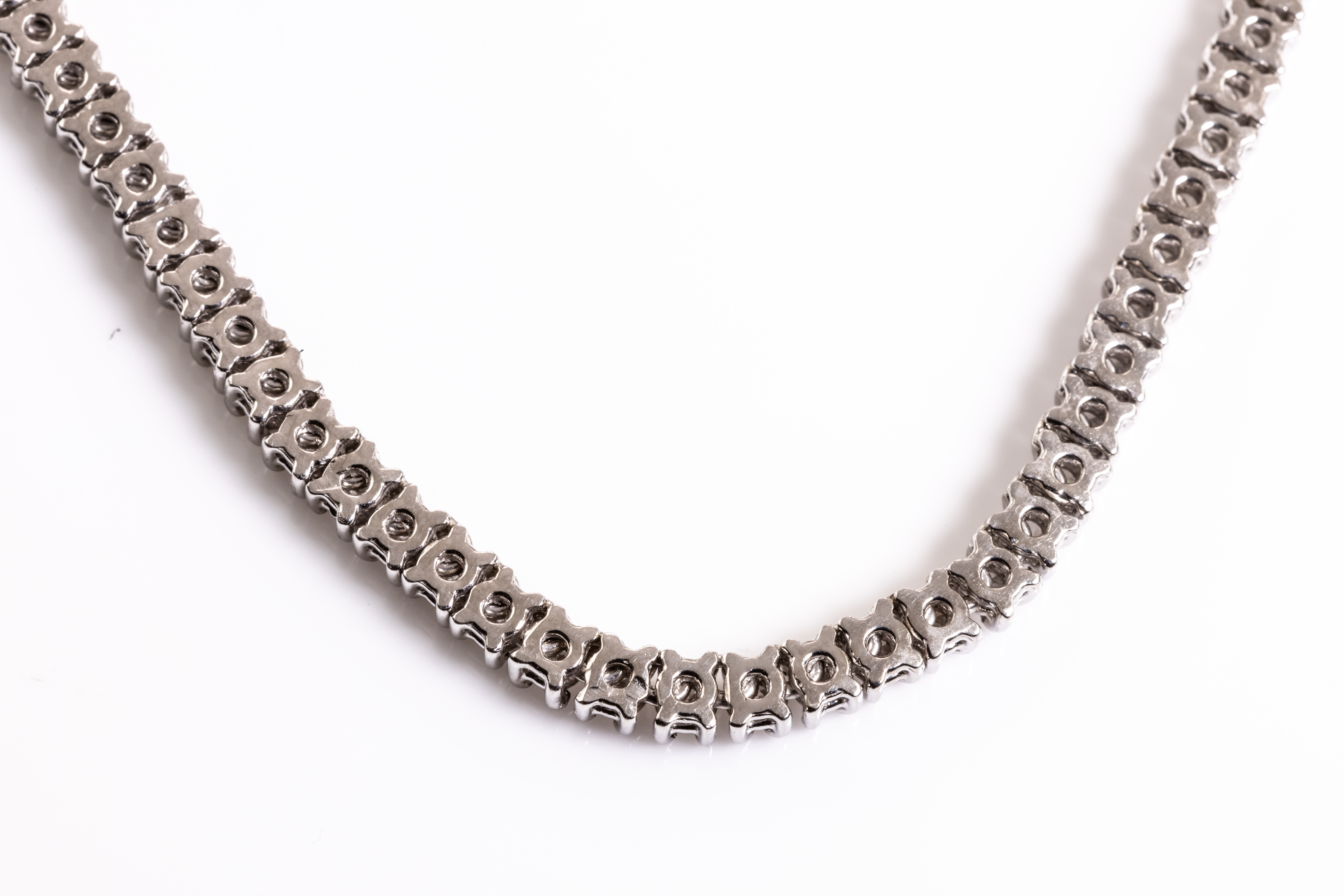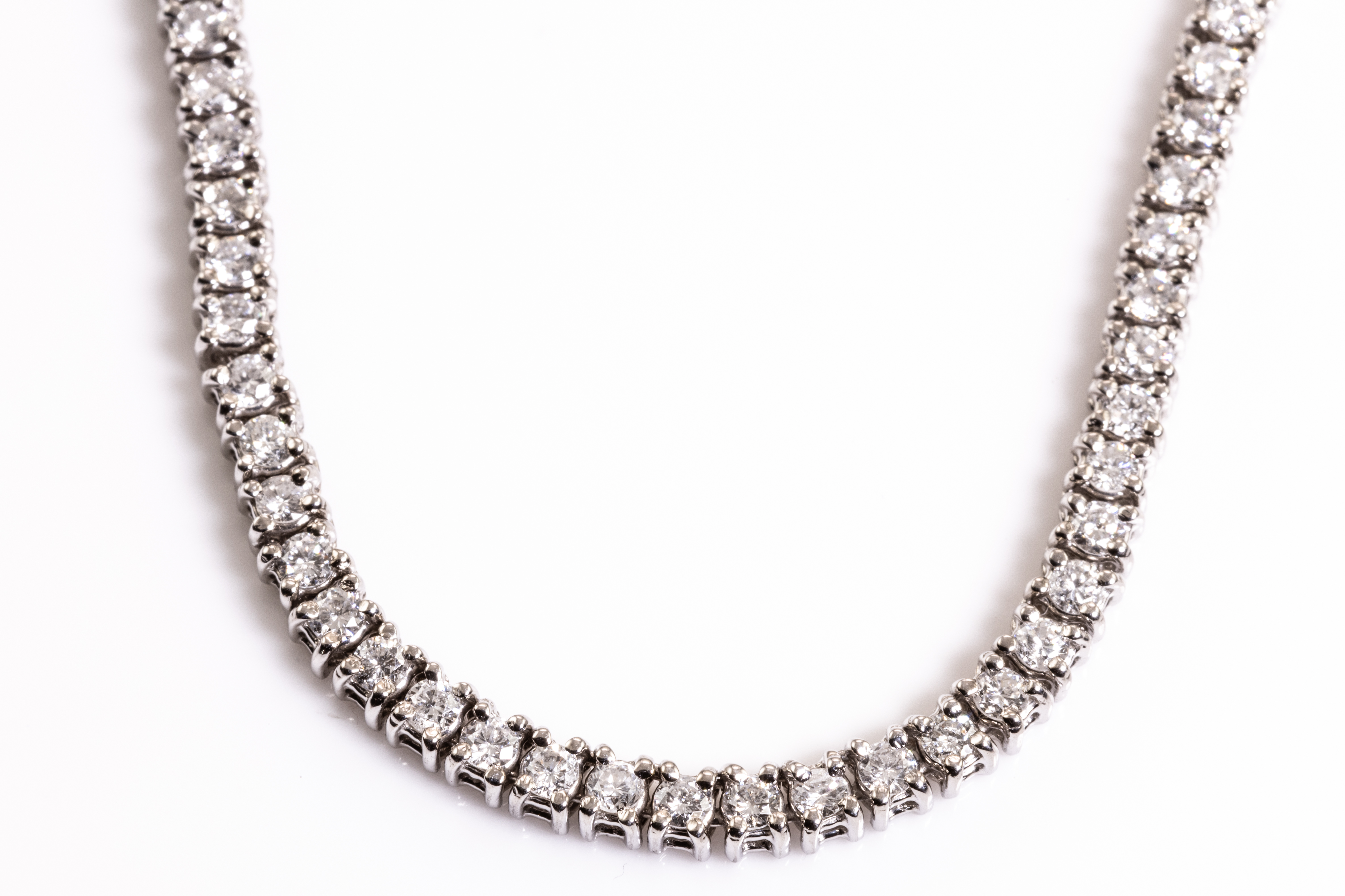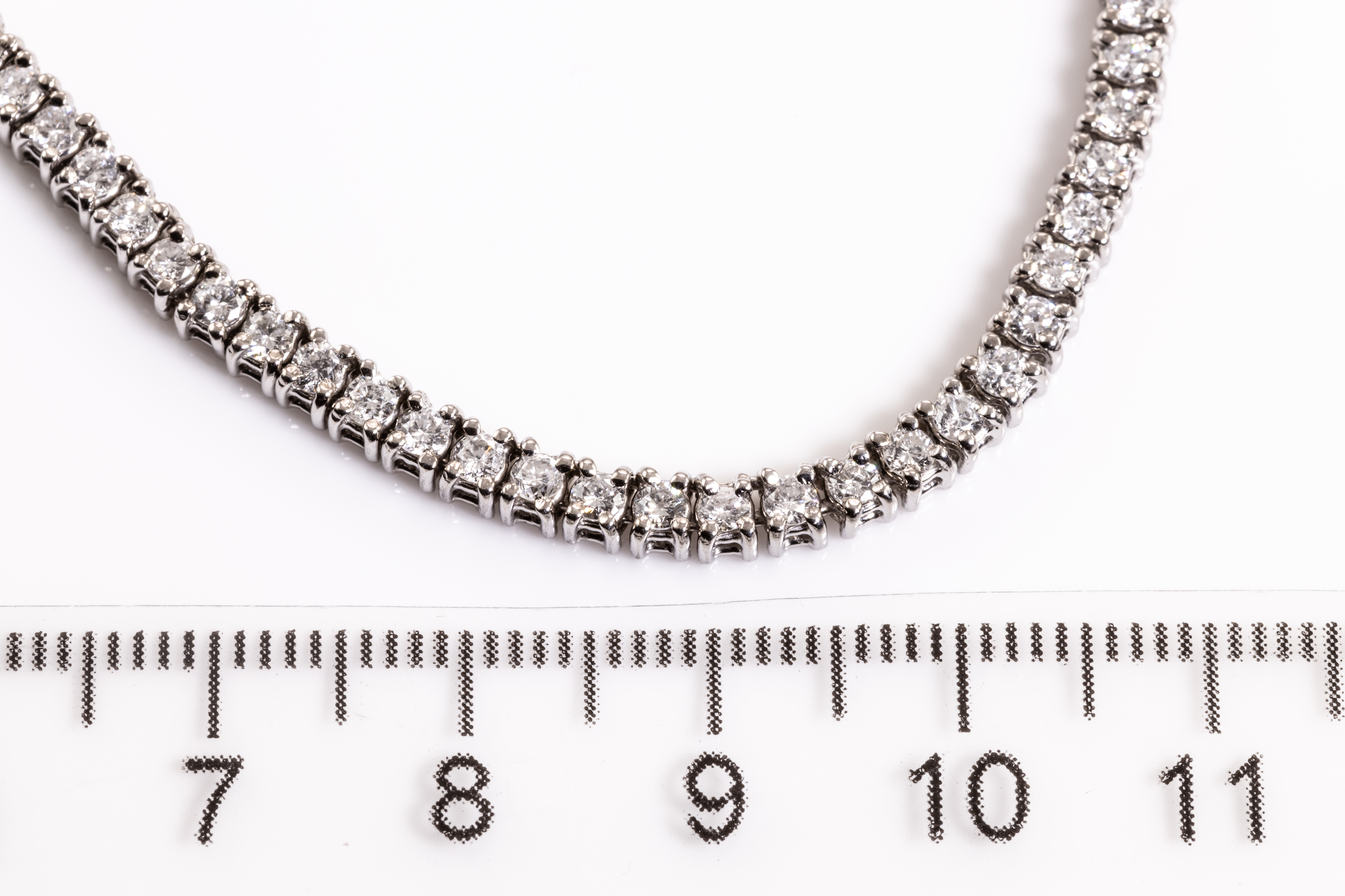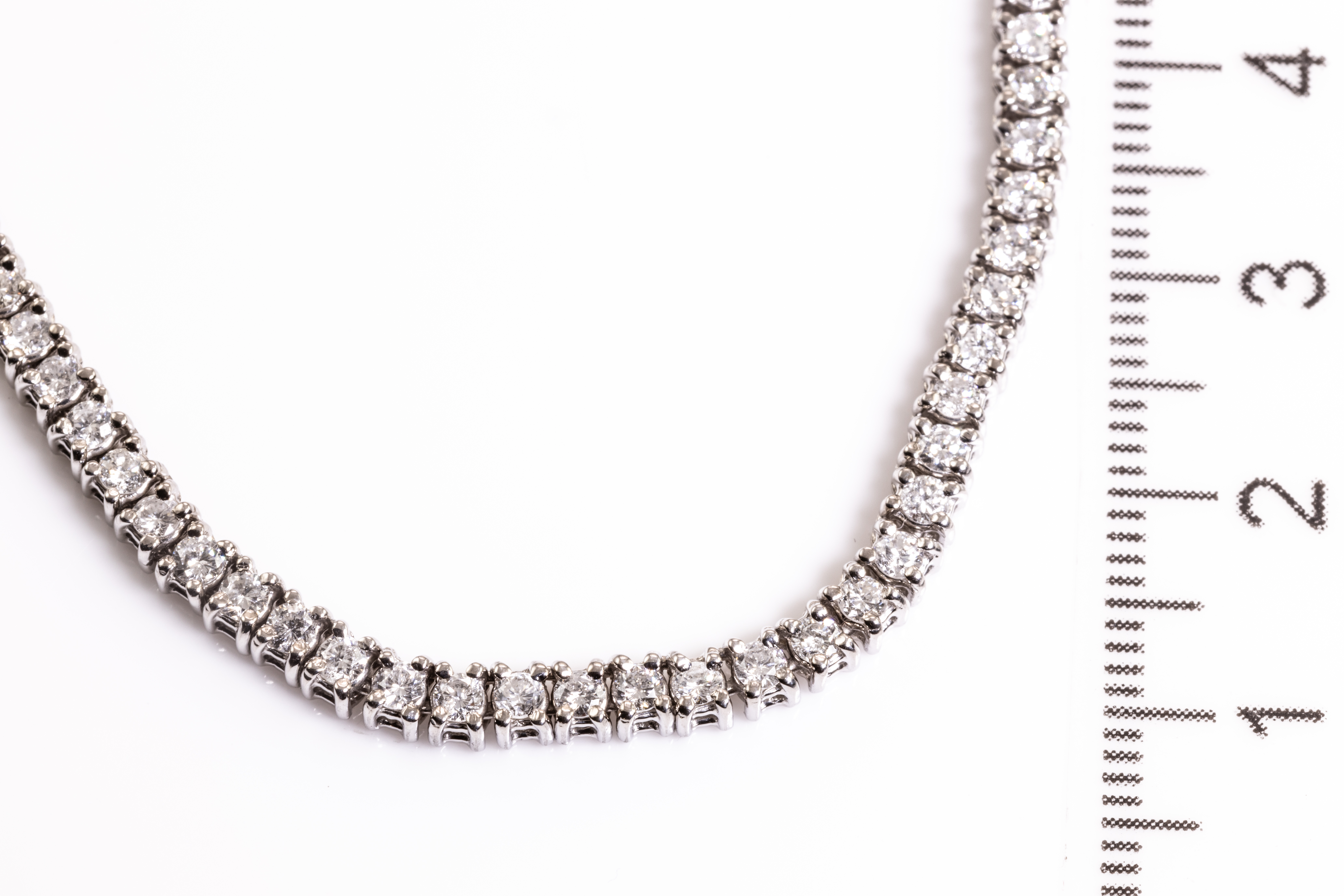 Diamond tennis necklace with round Diamonds totalling 8.16cts (Estimated grading: H-I SI-P1). Platinum. Length: 41cm. Weight: 33.4g. With Certificate #415972. (Pre-owned)