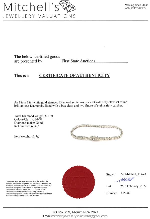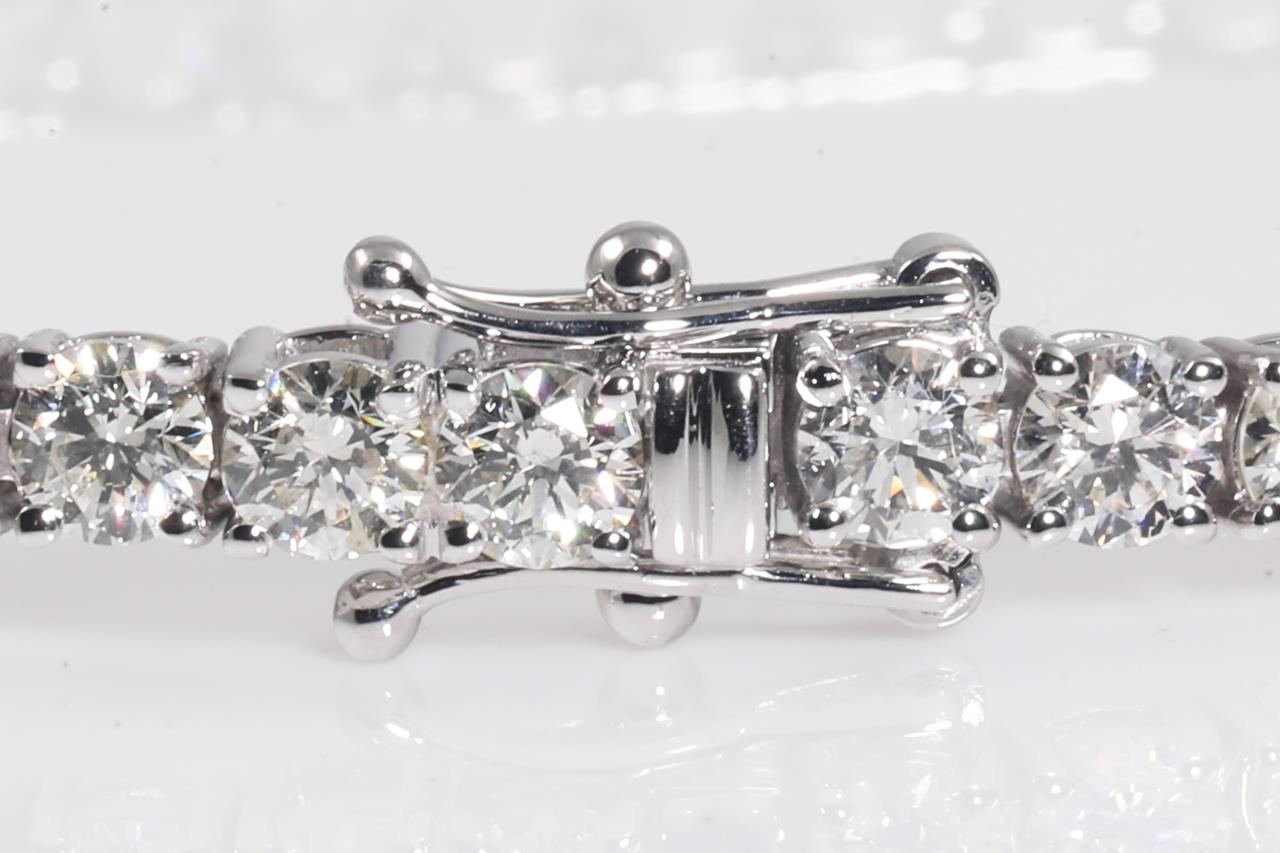 Diamond tennis bracelet with 50 round Diamonds totalling 8.17cts (Estimated grading: I-J SI). 18ct white gold. Length: 18cm. Weight: 11.5g. With certificate #415287. (New)