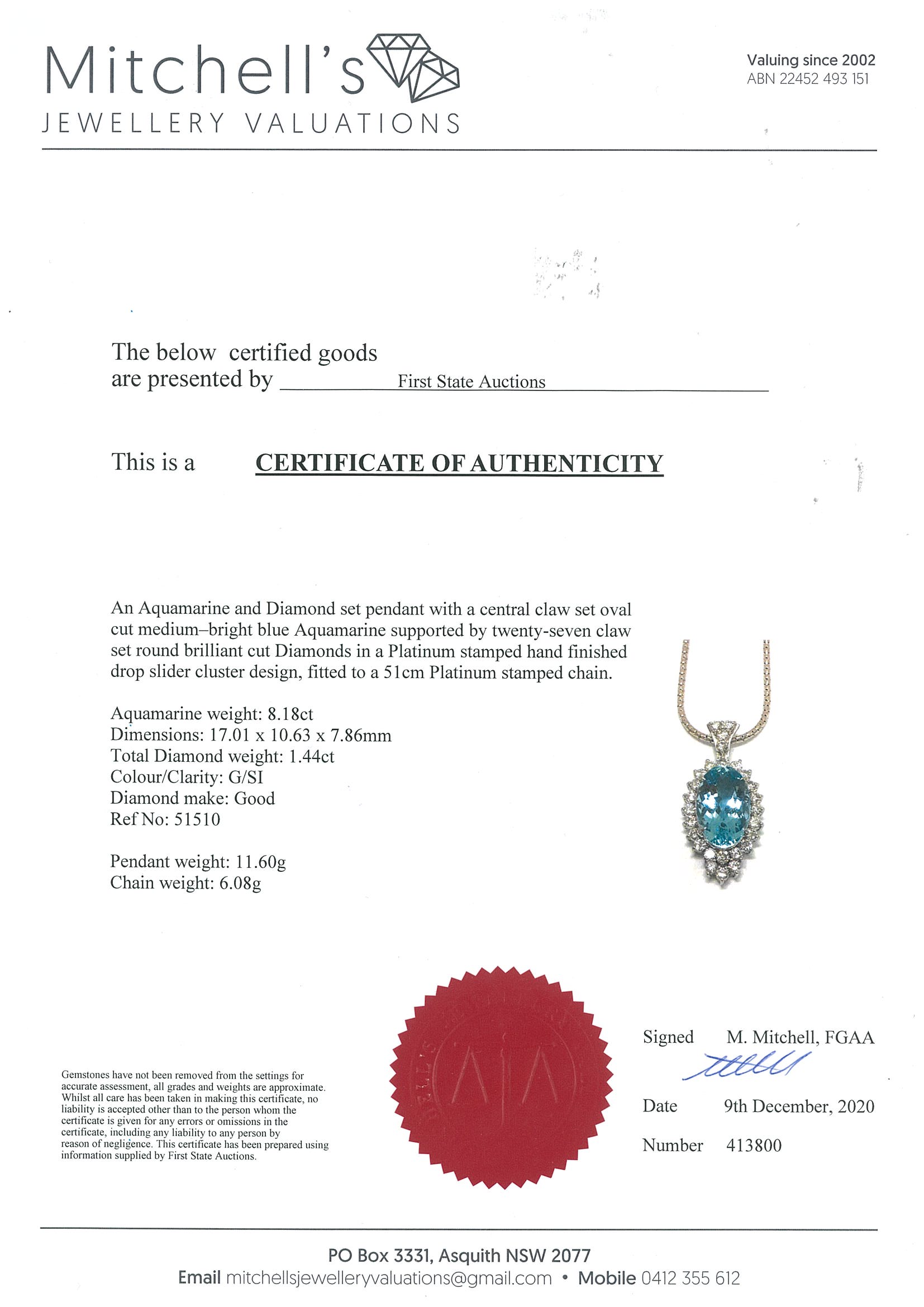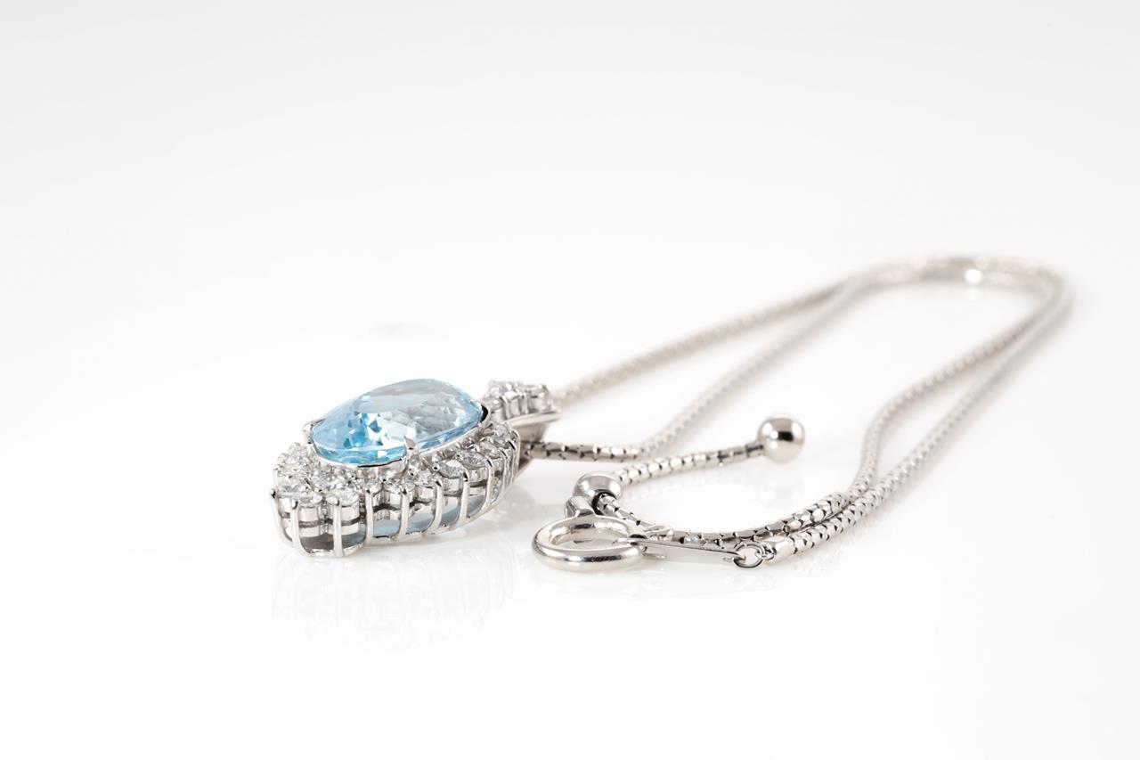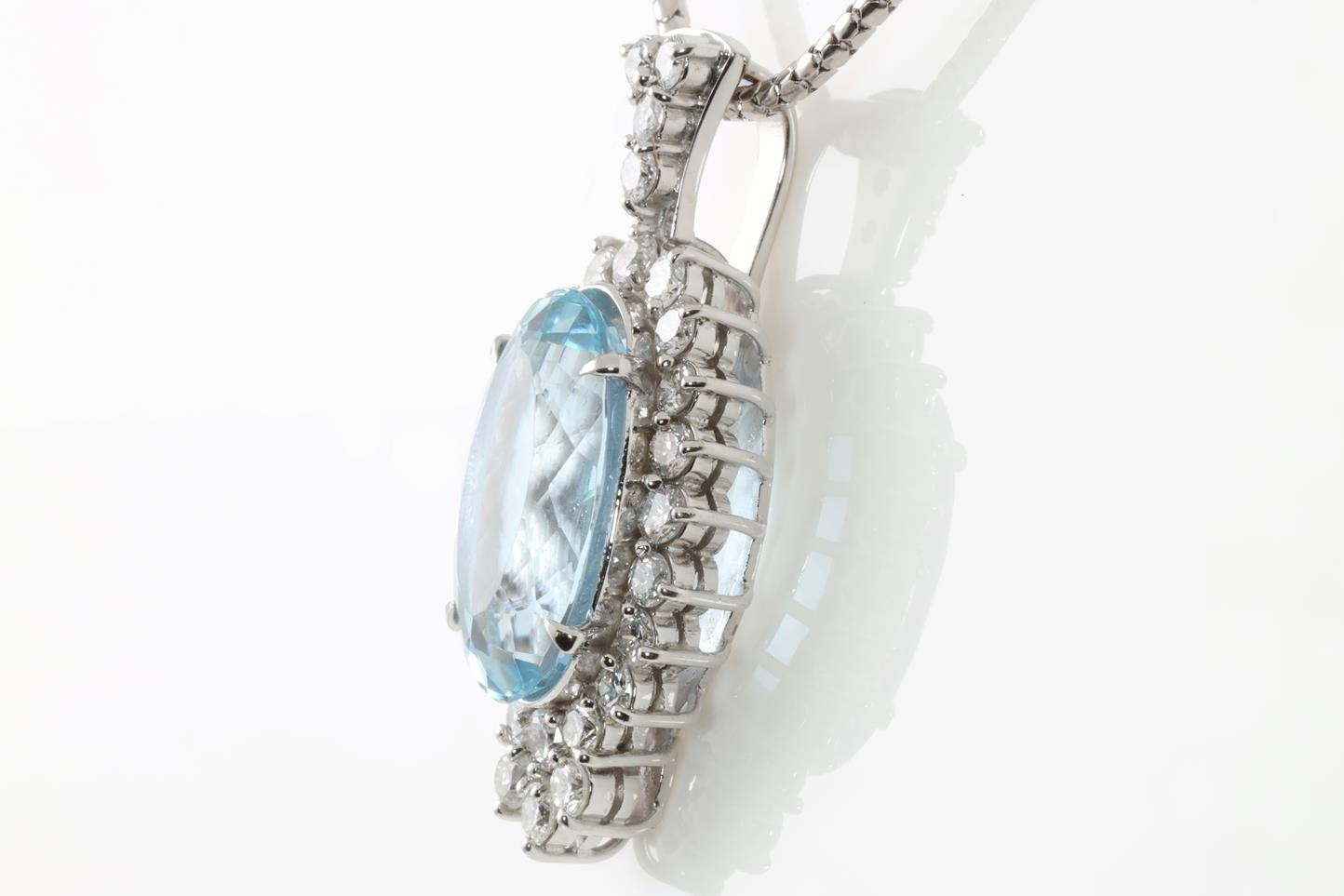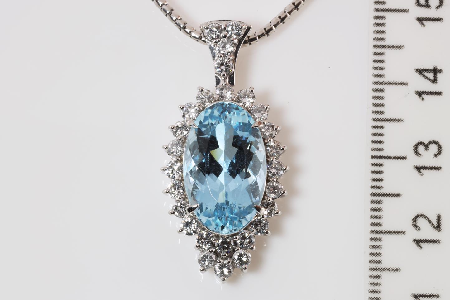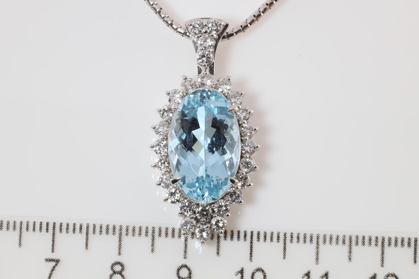 Aquamarine and Diamond pendant with oval shape Aquamarine of 8.18ct and Diamonds totalling 1.44cts (Estimated grading: G SI). Platinum with platinum 51cm adjustable chain. Weight: 17.68g. With Certificate #413800. (Pre-owned)