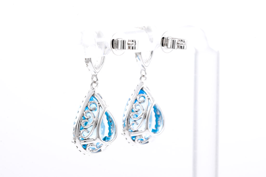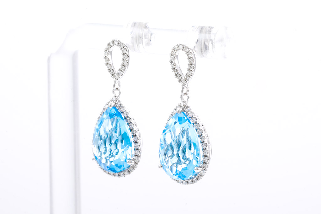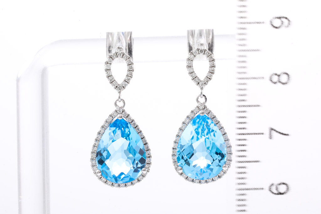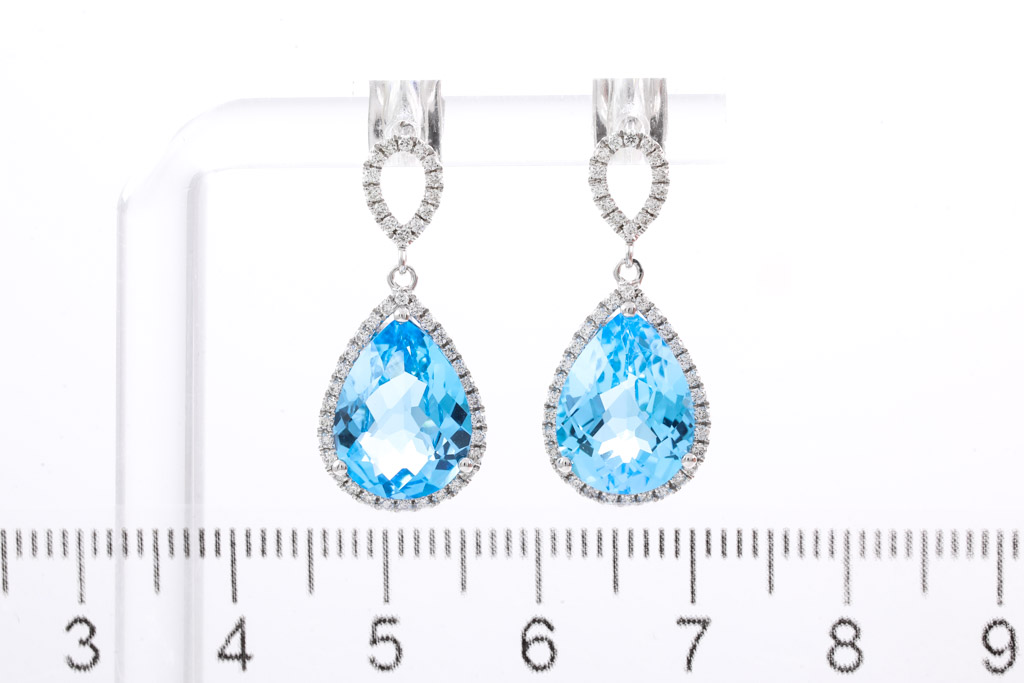 Topaz and Diamond earrings with pear shape blue Topaz totalling 8.19cts and round Diamonds totalling 0.39cts (Estimated grading: H SI). 14ct white gold. Weight: 5.1g. (New).