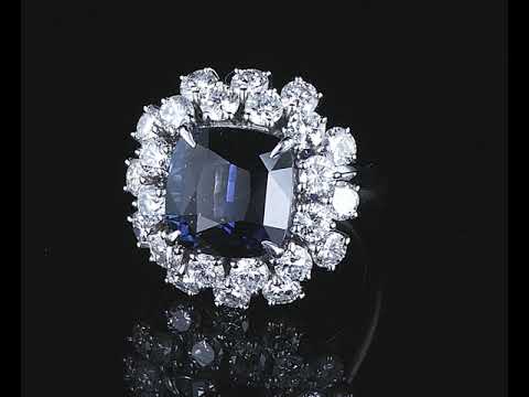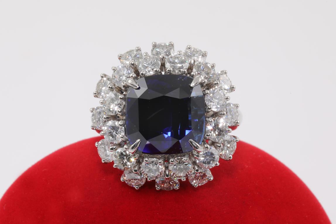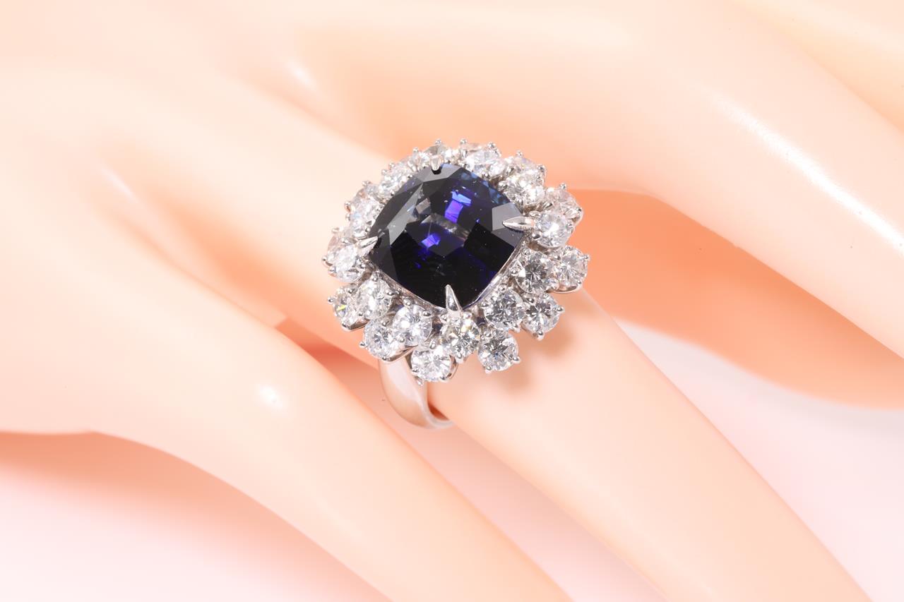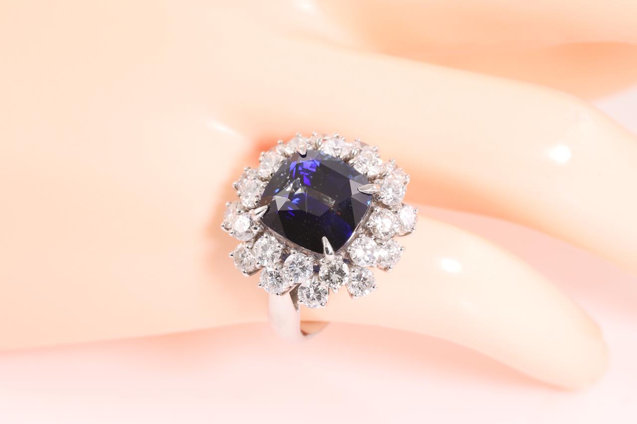 Sapphire and Diamond ring with a cushion cut unheated blue Sri Lankan Sapphire of 8.19ct and Diamonds totalling 2.93cts (Estimated grading: H-I SI-P1). Platinum. Ring size K1/2. Weight: 13.3g. With GIA report #6395676622. (Pre-owned)