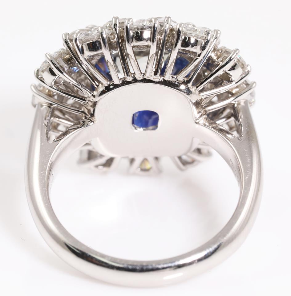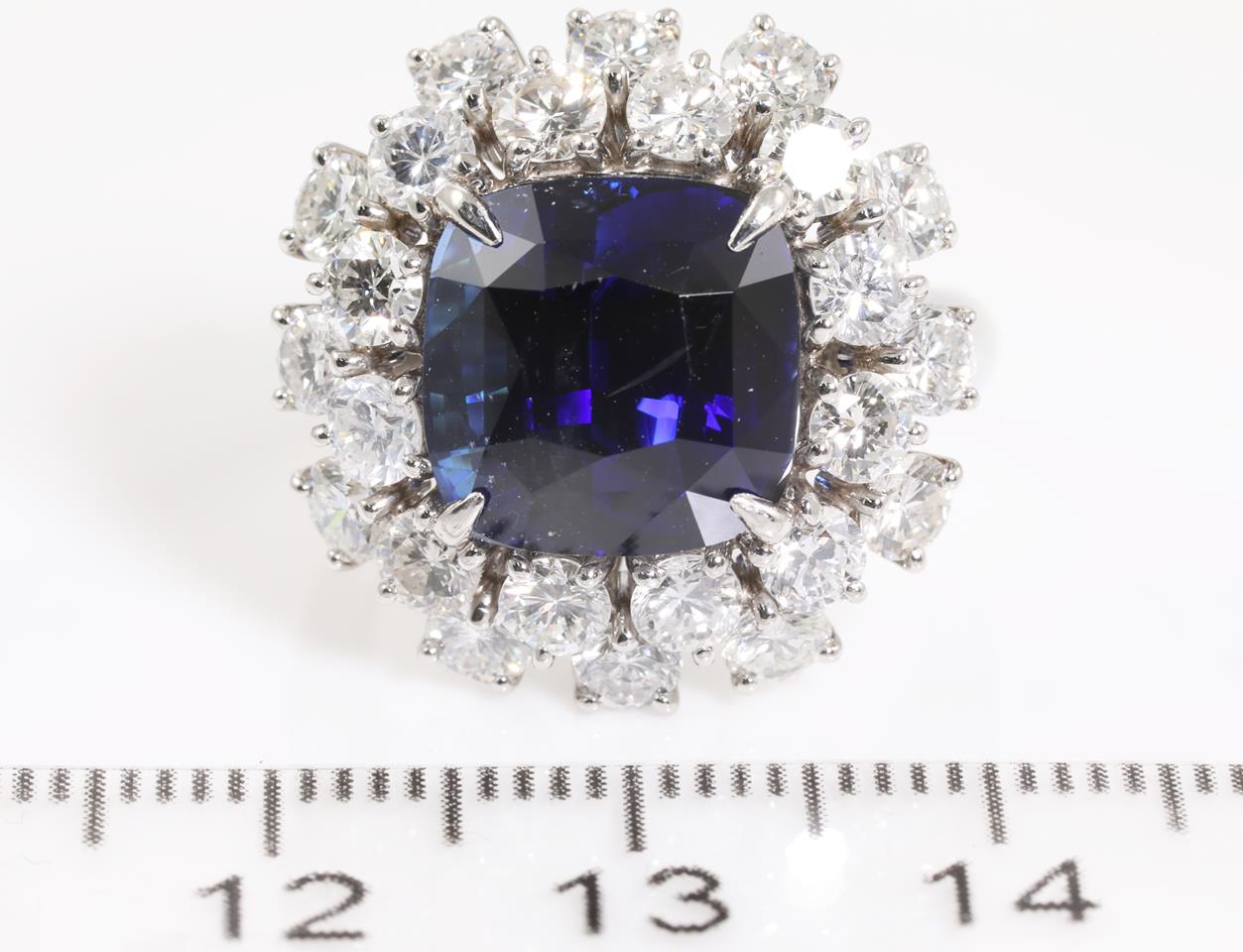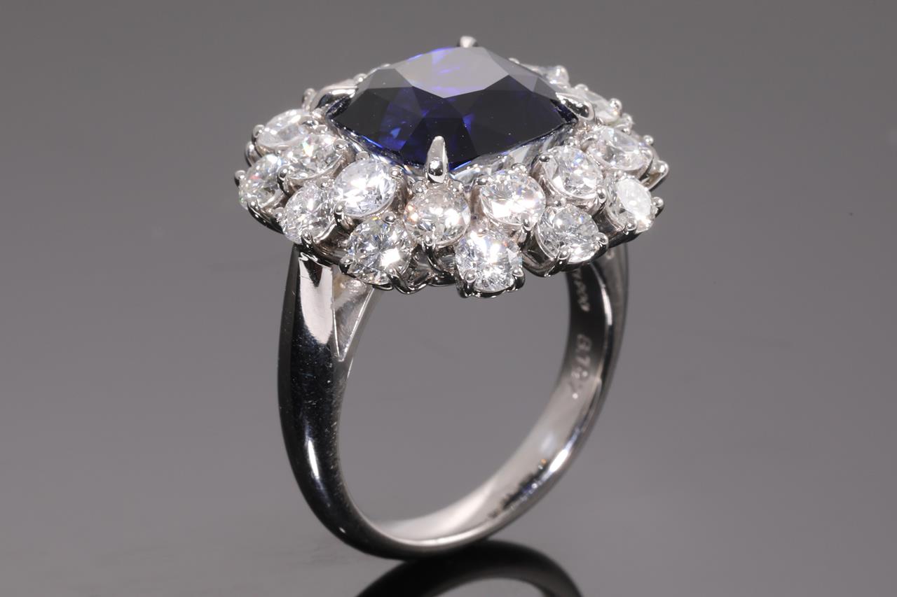 Sapphire and Diamond ring with a cushion cut unheated blue Sri Lankan Sapphire of 8.19ct and Diamonds totalling 2.93cts (Estimated grading: H-I SI-P1). Platinum. Ring size K1/2. Weight: 13.3g. With GIA report #6395676622. (Pre-owned)