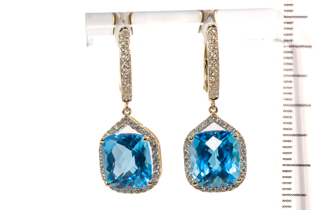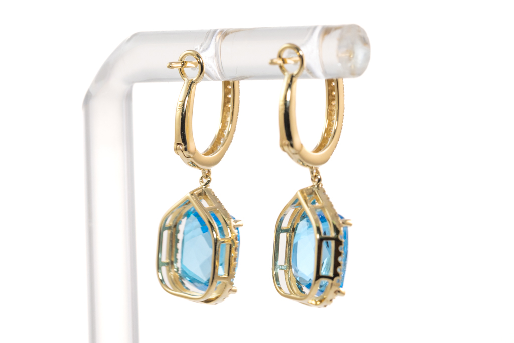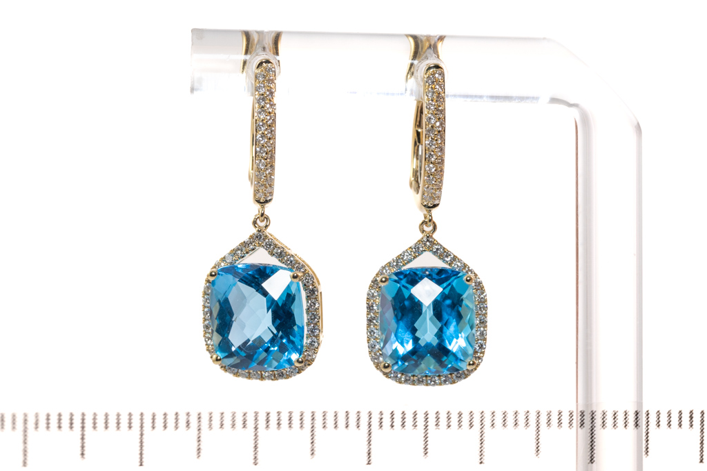 Topaz and Diamond earrings with cushion cut blue Topaz totalling 8.20cts and Diamonds totalling 0.48cts (Estimated grading: H SI). 14ct yellow gold. Weight: 4.6g. (New)