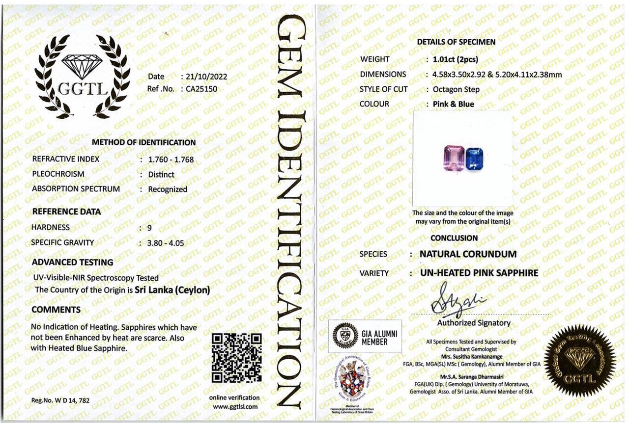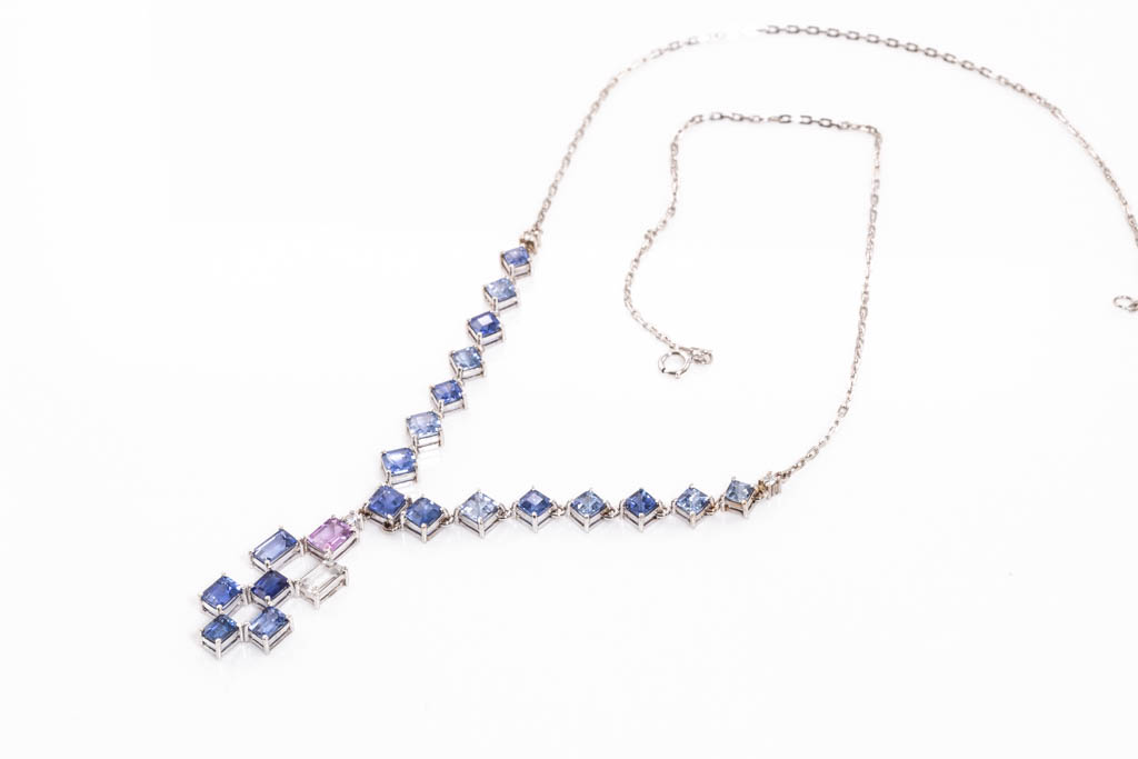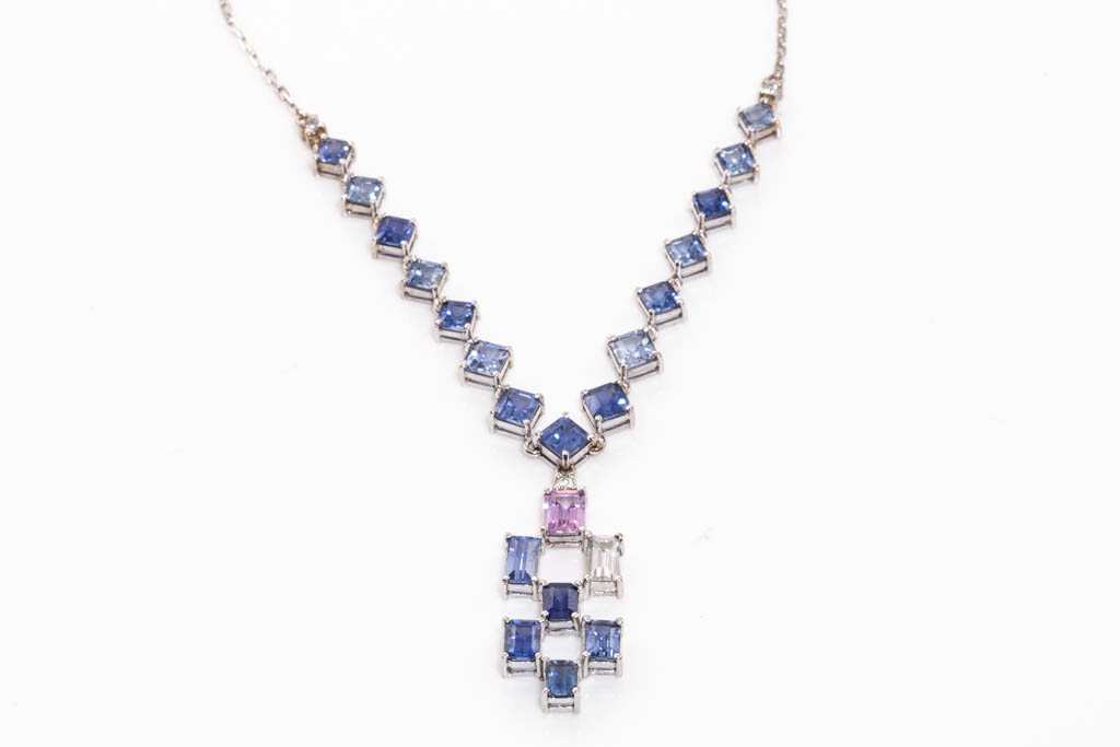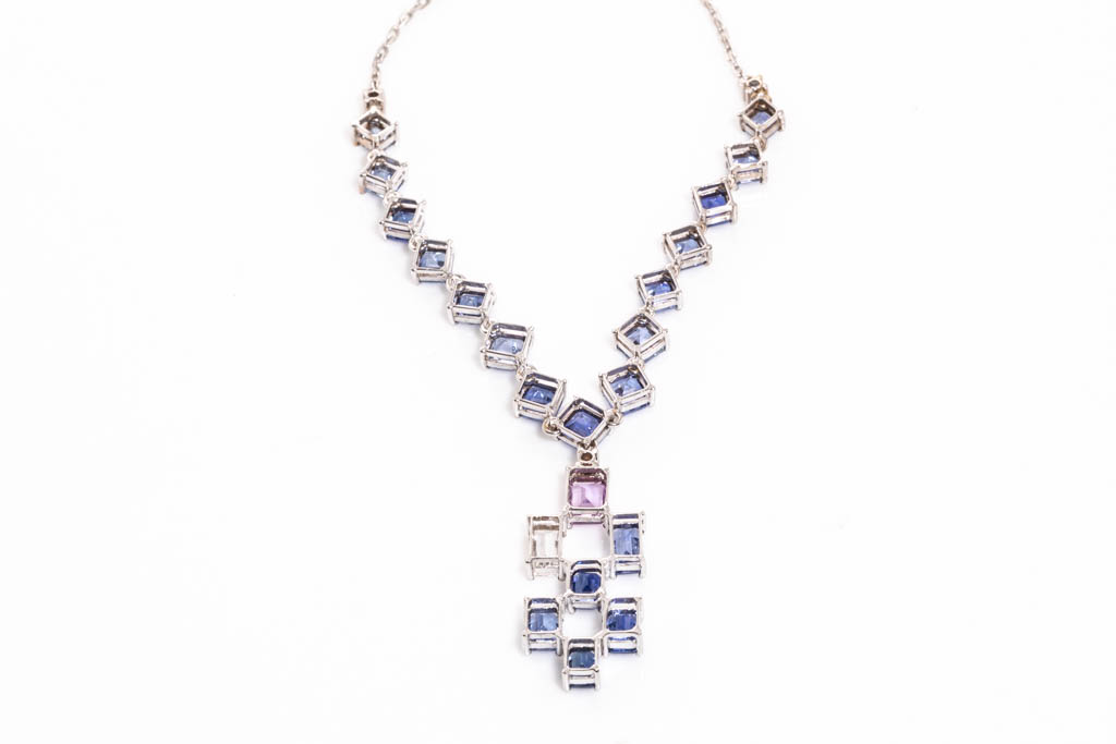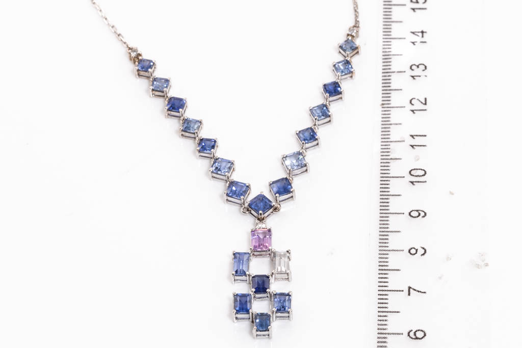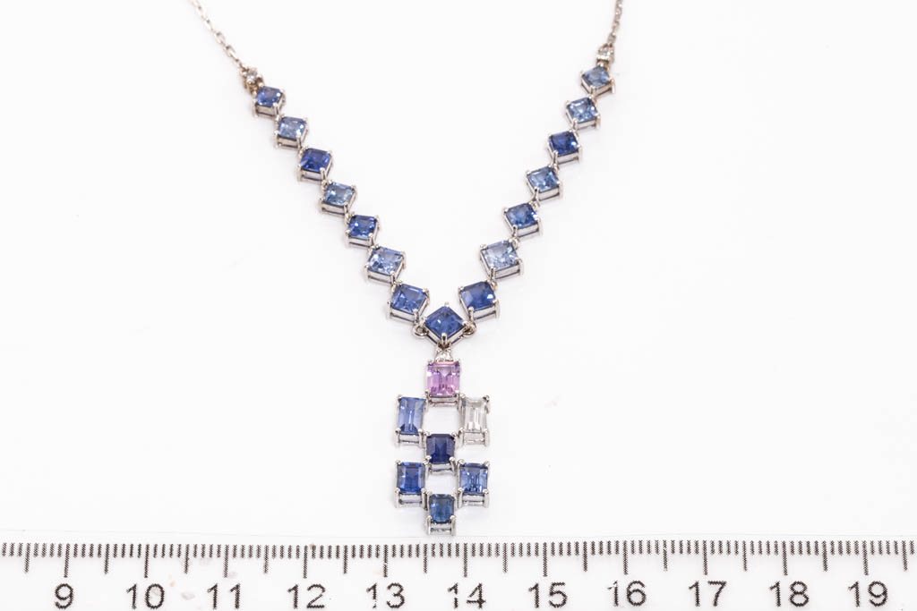 Sapphire necklace with emerald cut blue, colourless & an unheated Ceylon pink Sapphire totalling approximately 8.26cts (With Gem report details 2 stones) and round Diamonds totalling approximately 0.06cts. 18ct white gold. Length 42.5cm. Weight 7.8g. (As New)