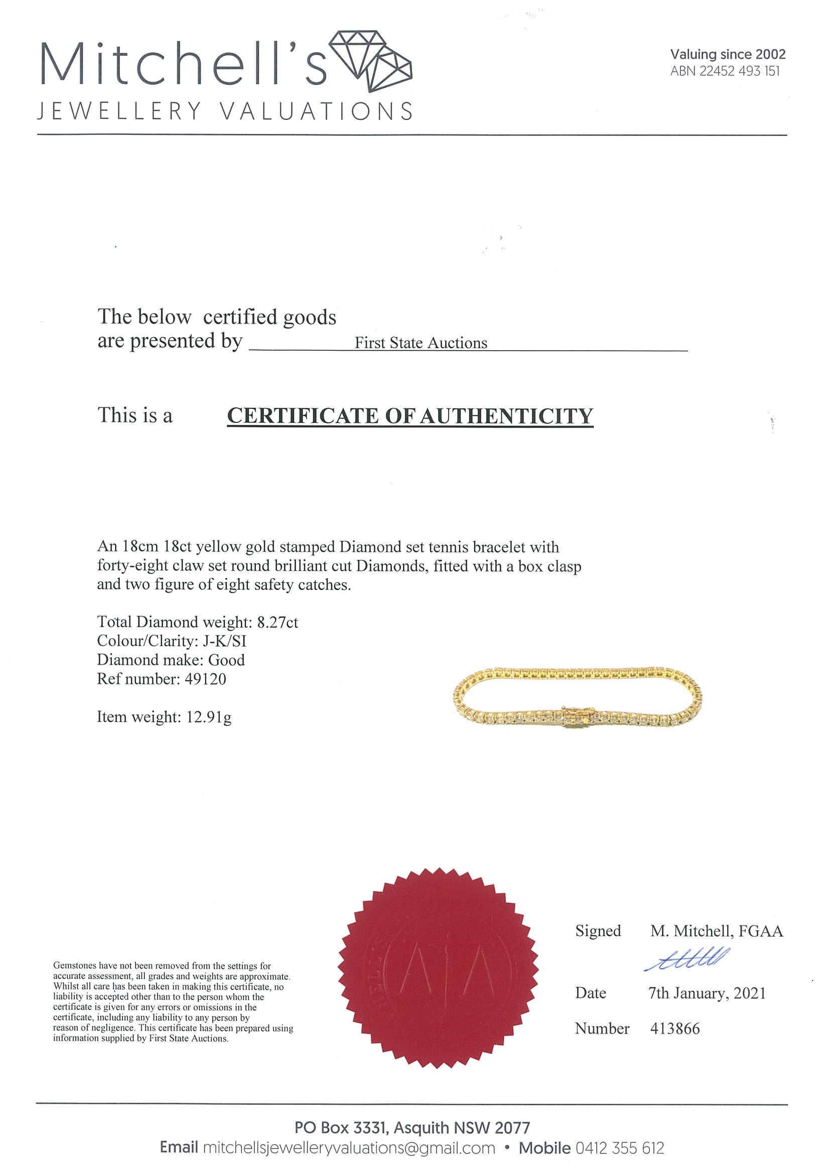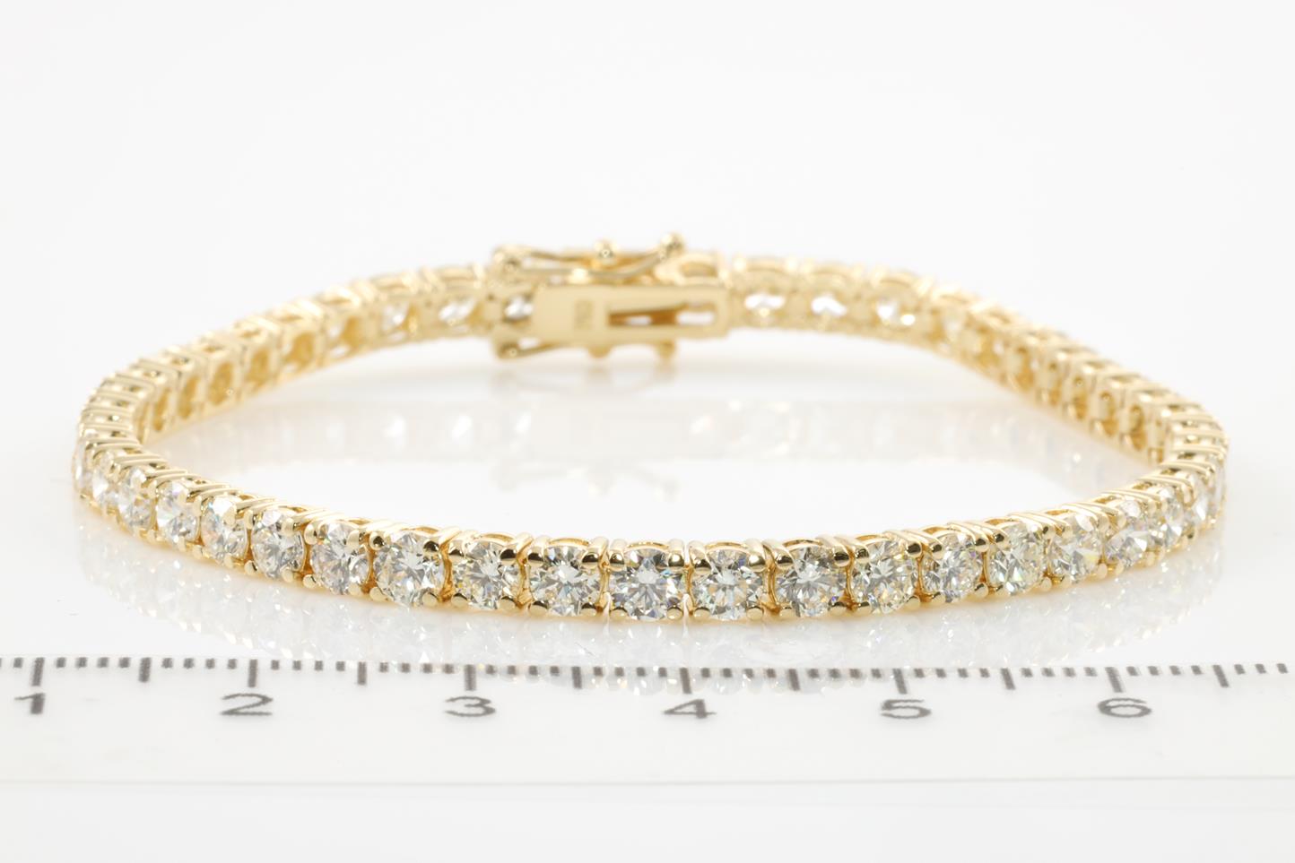 Diamond tennis bracelet with 48 round Diamonds totalling 8.27cts (Estimated grading: J-K SI). 18ct yellow gold. Length: 18cm. With certificate #413866. Weight: 12.9g (New)