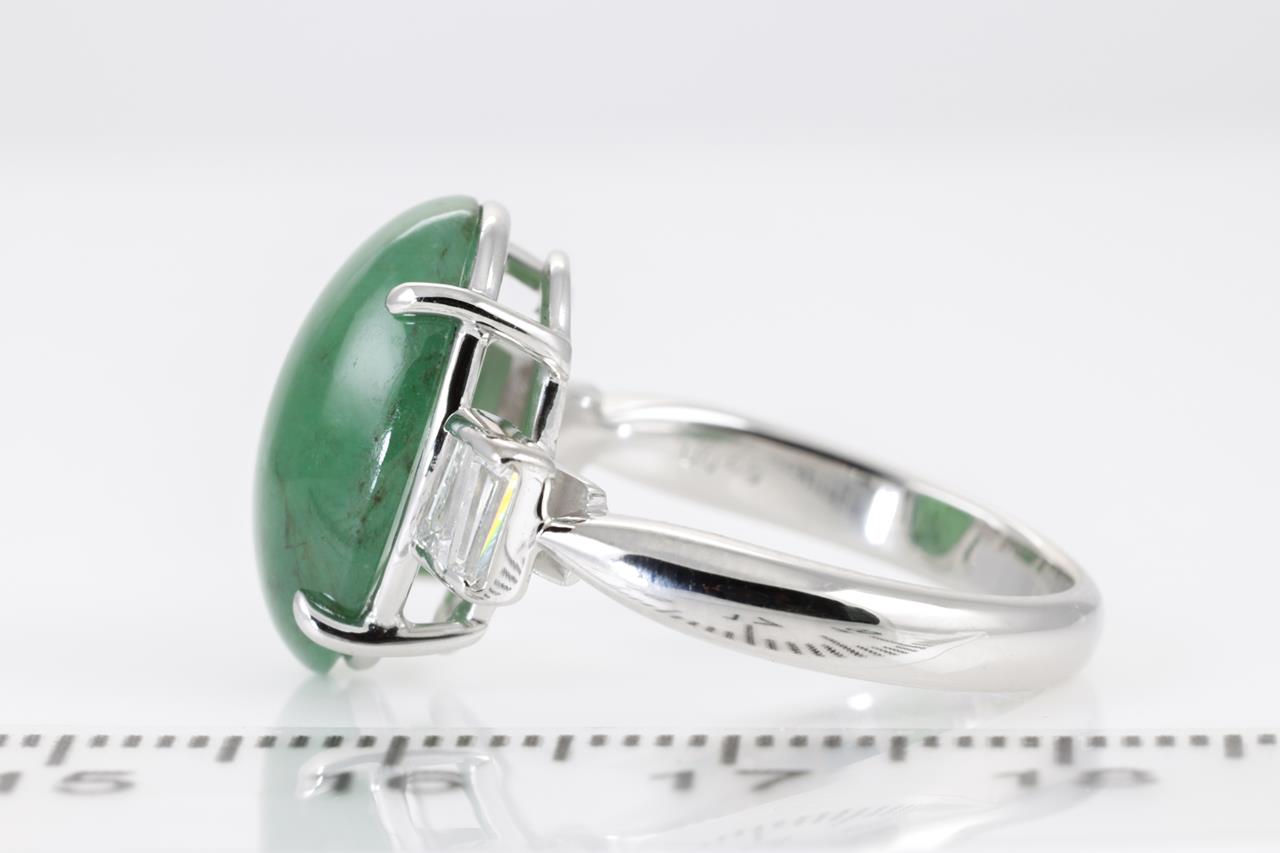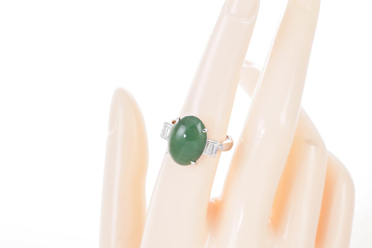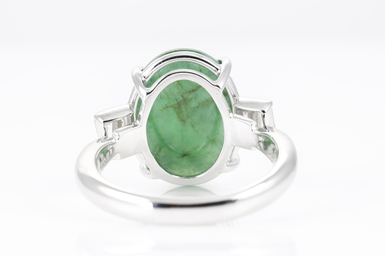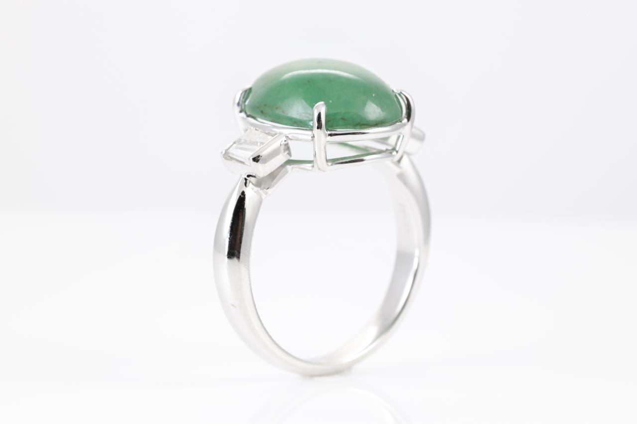 Jade and Diamod ring with centre oval shape Type A Jadeite Jade of 8.35ct and 4 baguette cut Diamonds totalling 0.45cts (Estimated grading: G SI). Platinum. Ring size: O1/2 - ring resizing is not recommended. Weight: 8.7g. (Pre-owned)