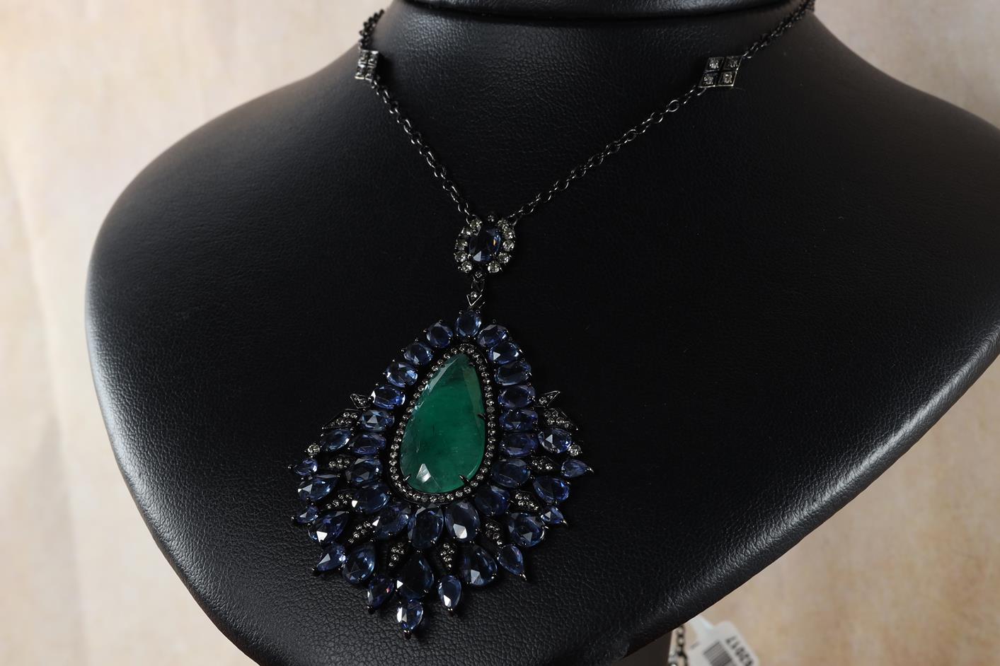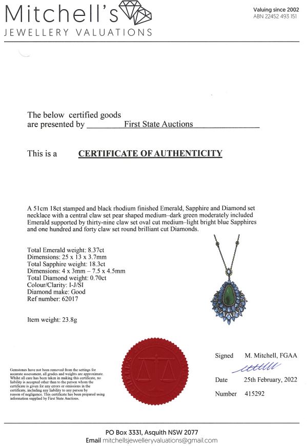 Emerald, Sapphire and Diamond necklace with pear shape Emerald of 8.37ct and blue oval Sapphires totalling 18.3cts and round Diamonds totalling 0.70cts (Estimated grading I-J, SI). 18ct white gold with rhodium plated. Length 51cm. By Hardy Brothers. Weight 23.8g. With Certificate #415292. (As New)