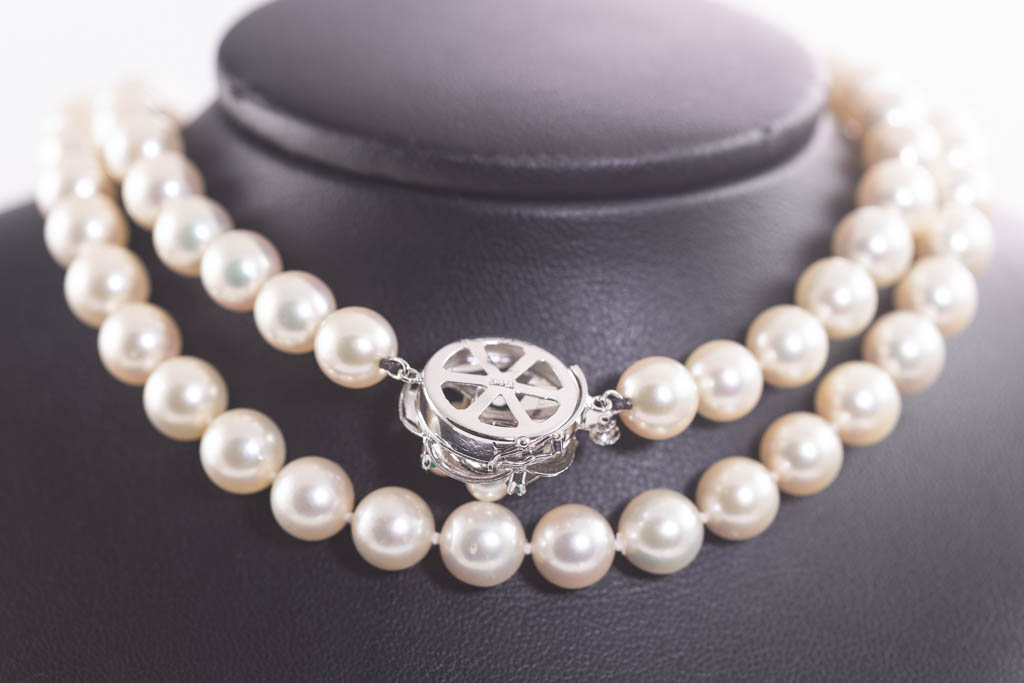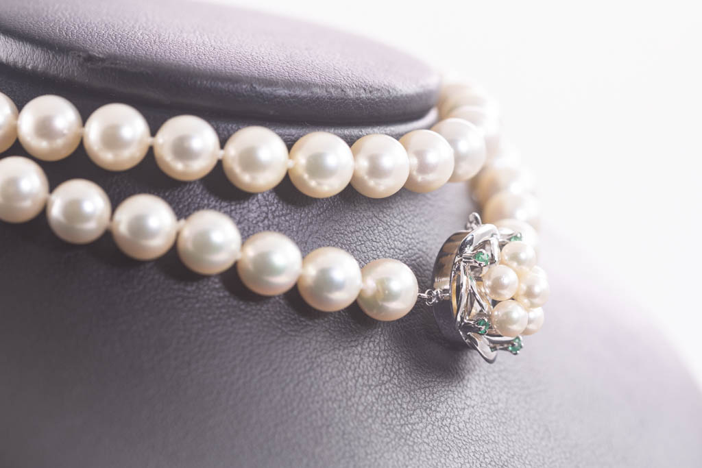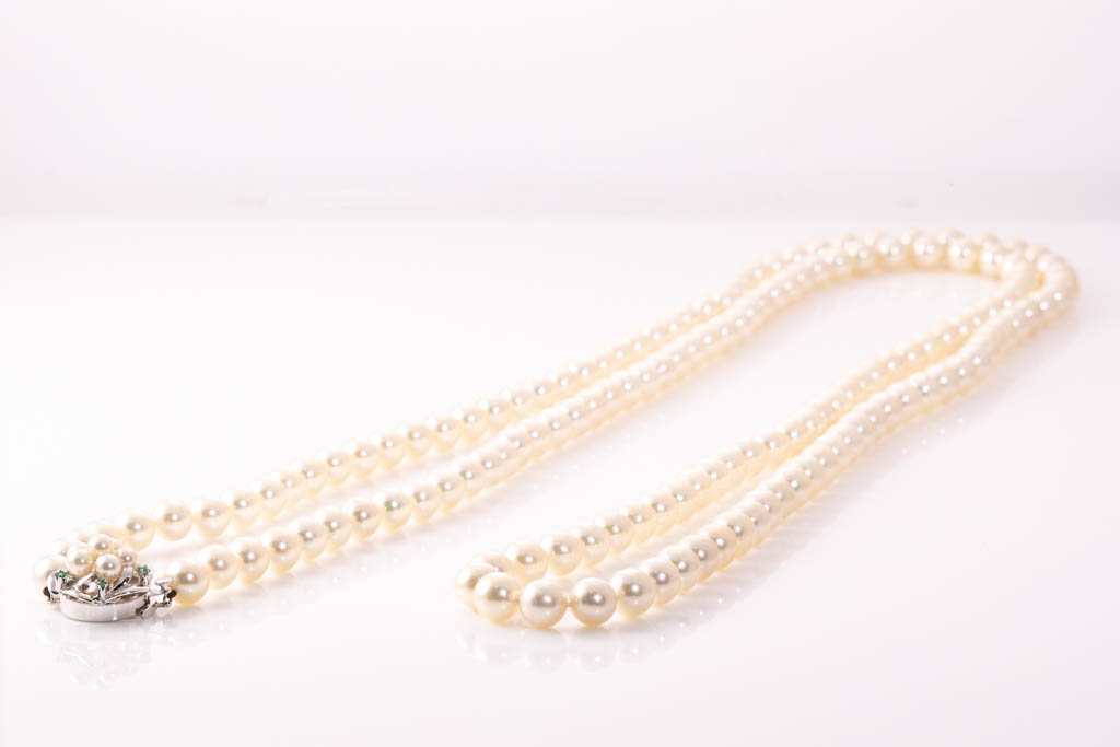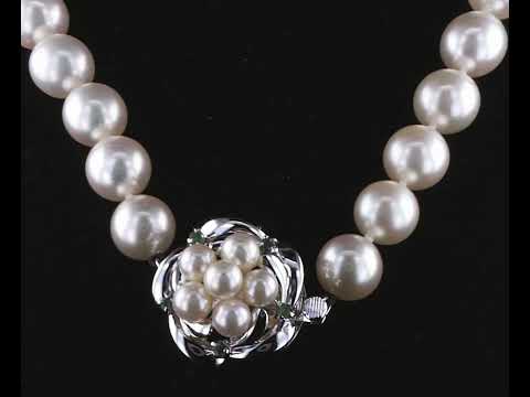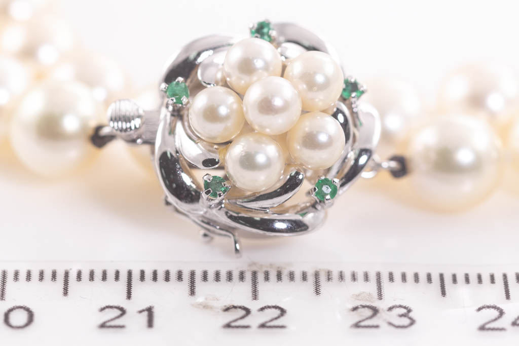 Pearl necklace with Akoya Pearls of 8.0mm - 8.3mm. 14ct white gold clasp set with 6 Akoya Pearl of 5.5mm-5.0mm and 5 round Emeralds totalling 0.15cts. Length approximately 134cm. Weight: 123.5g. (Pre-owned)