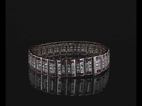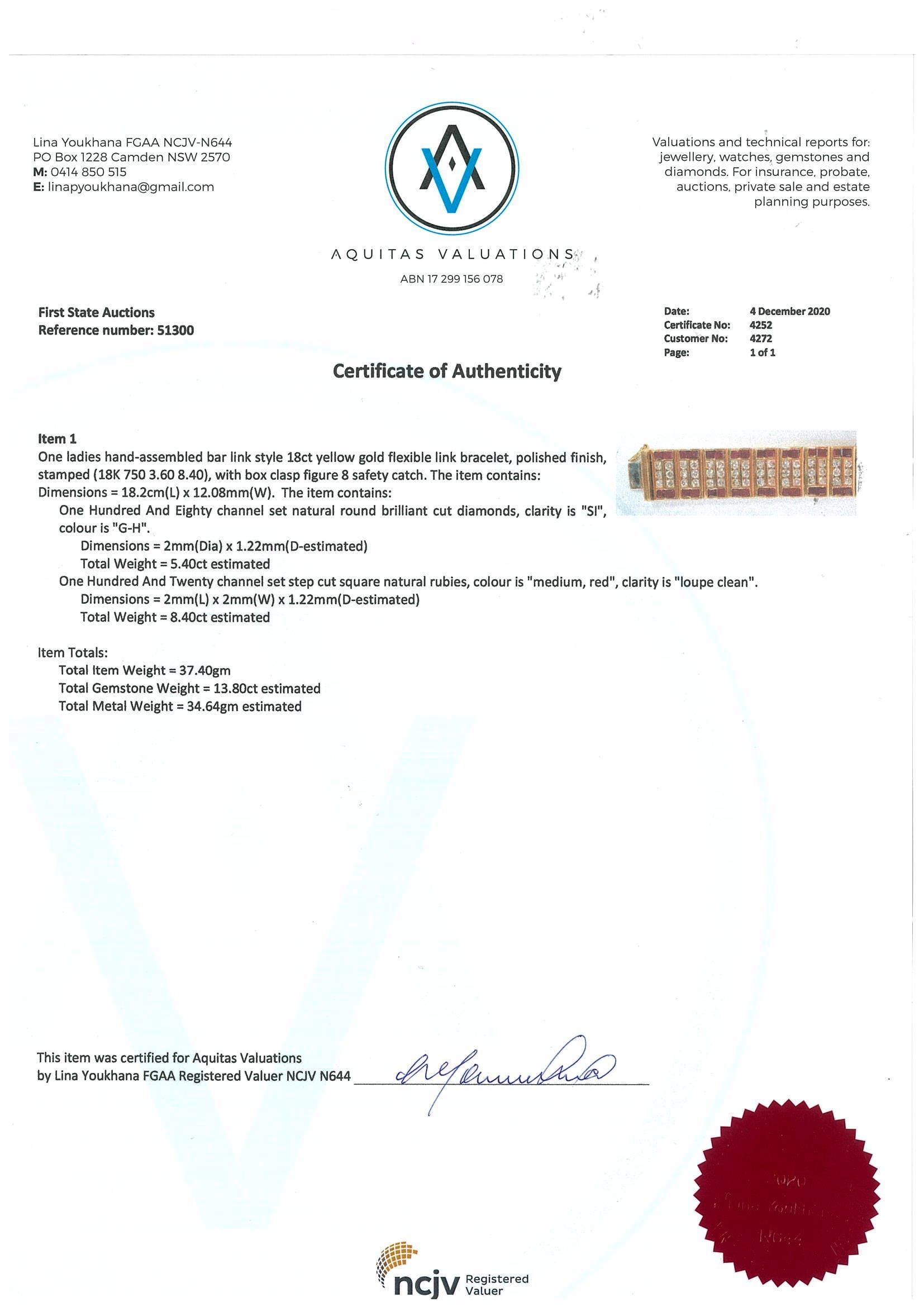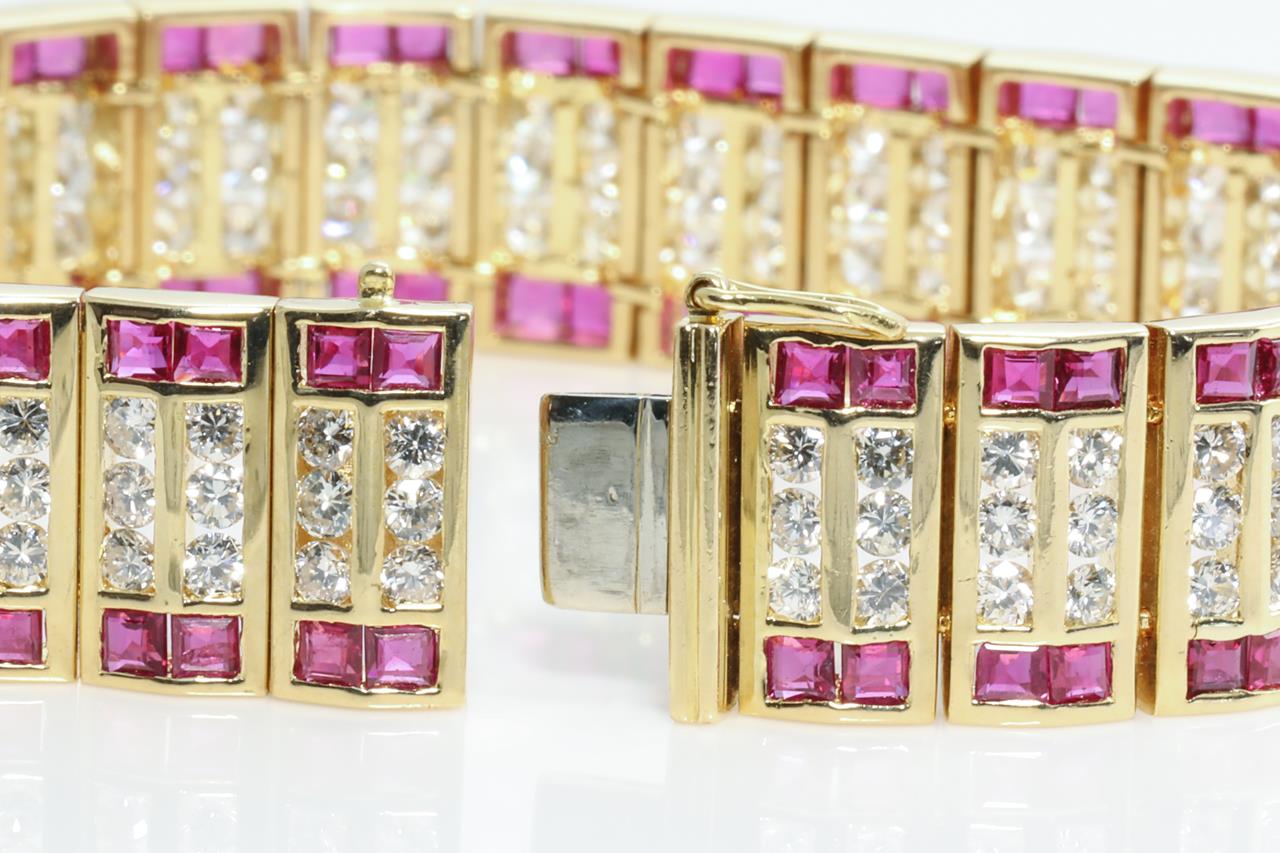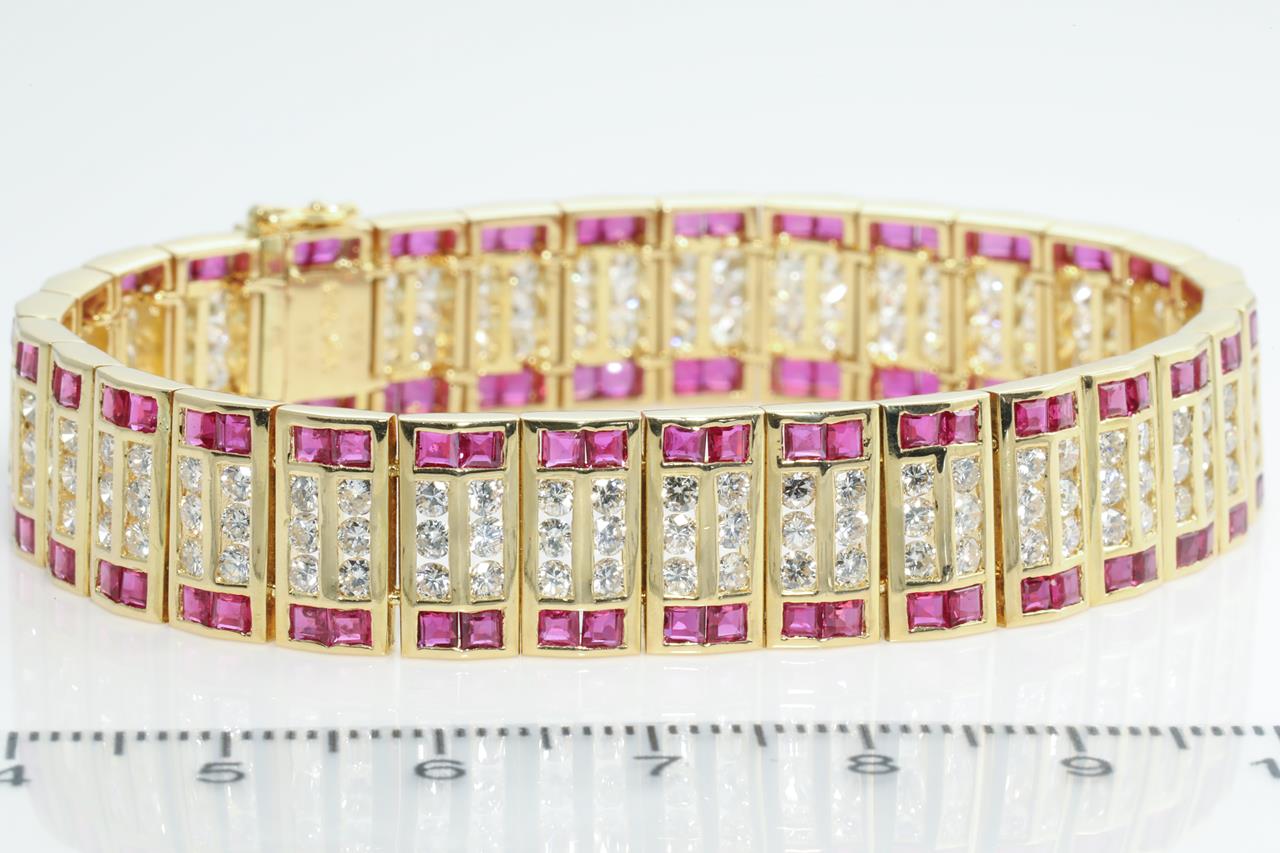 Ruby and Diamond bracelet with square cut Rubies totalling 8.40cts and round Diamonds totalling 5.40cts (Estimated grading: G-H SI). 18ct yellow gold. Length: 18.2cm. Weight: 37.4g With certificate #4252 (Pre-owned)