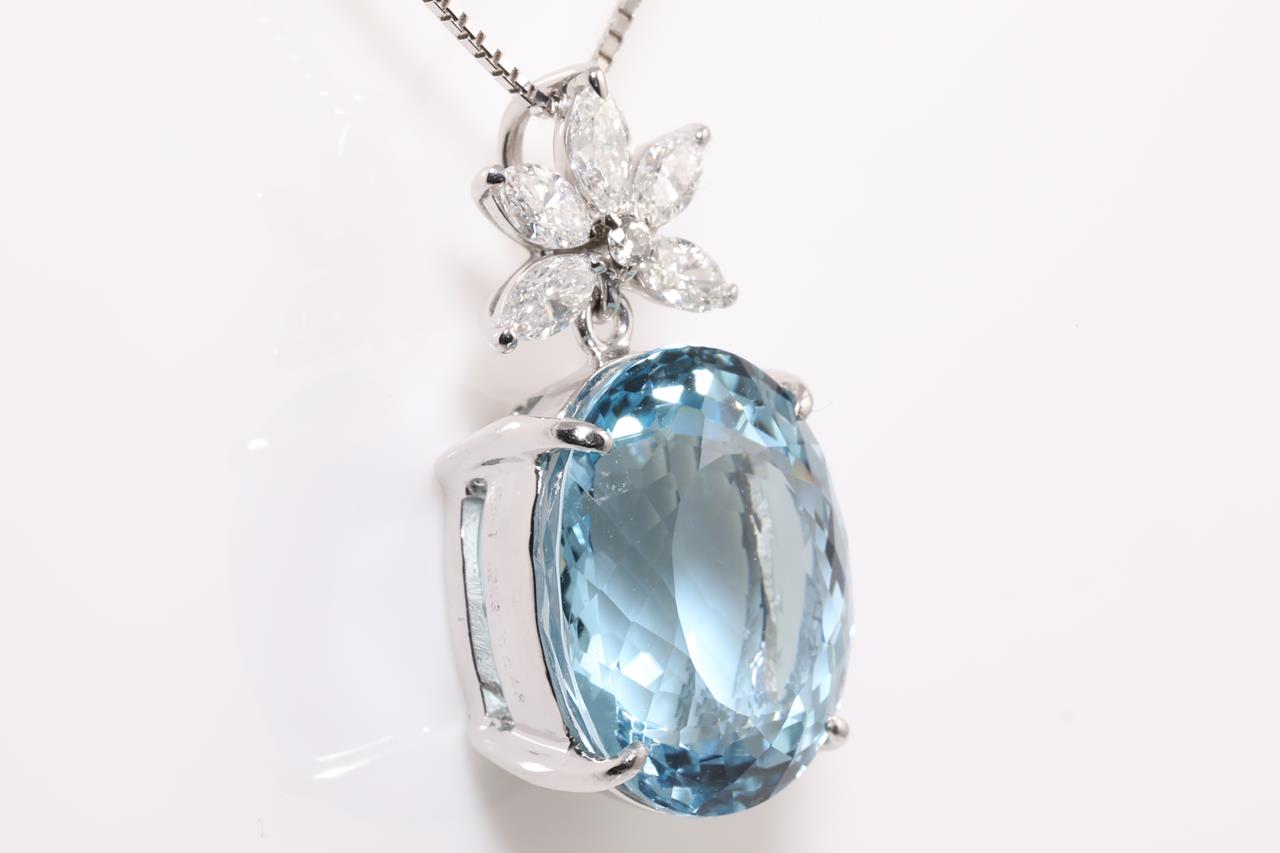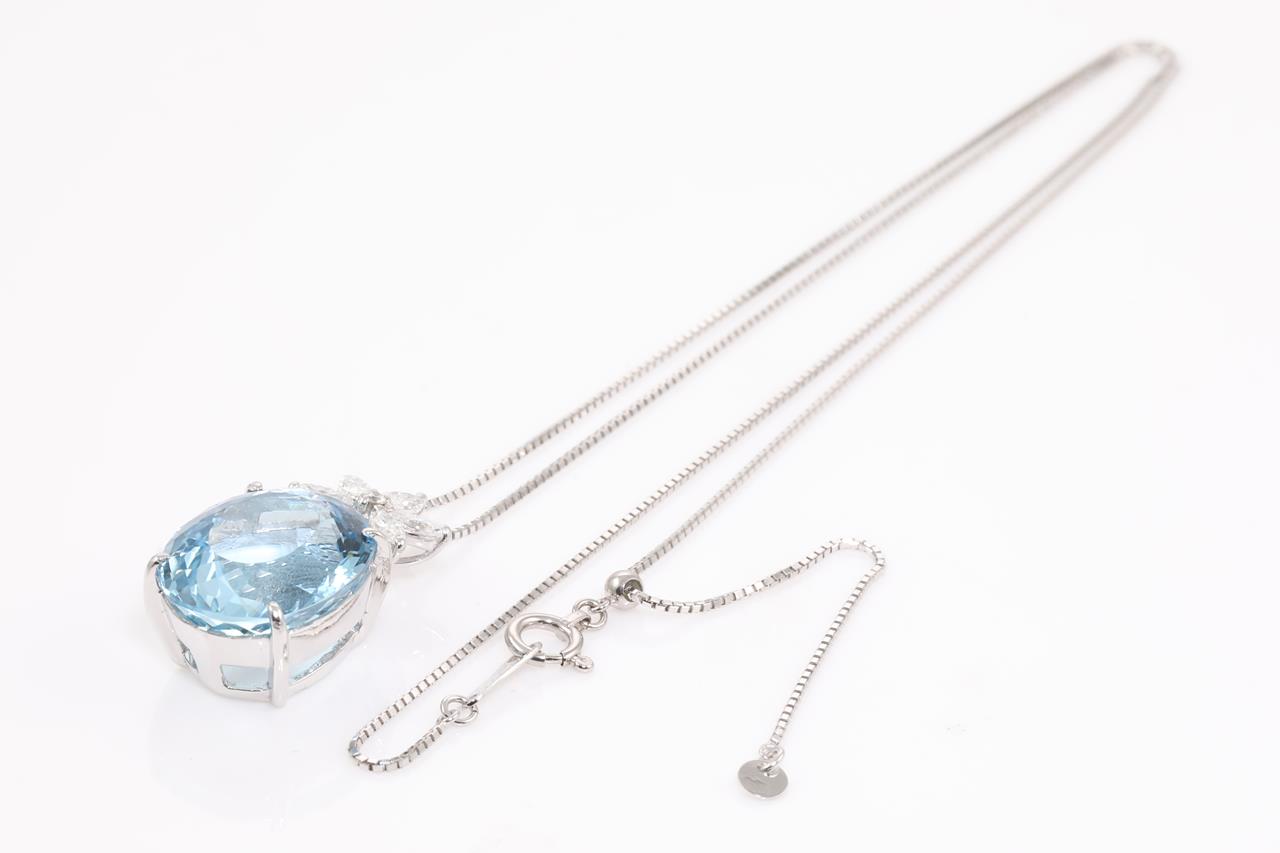 Aquamarine and Diamond pendant with an oval Aquamarine of 8.41ct and Diamonds totalling 0.43cts (Estimated grading: F-G VS-SI). 18ct white gold with adjustable 44cm chain. Weight: 6.5g. With certificate #414447. (Pre-owned)