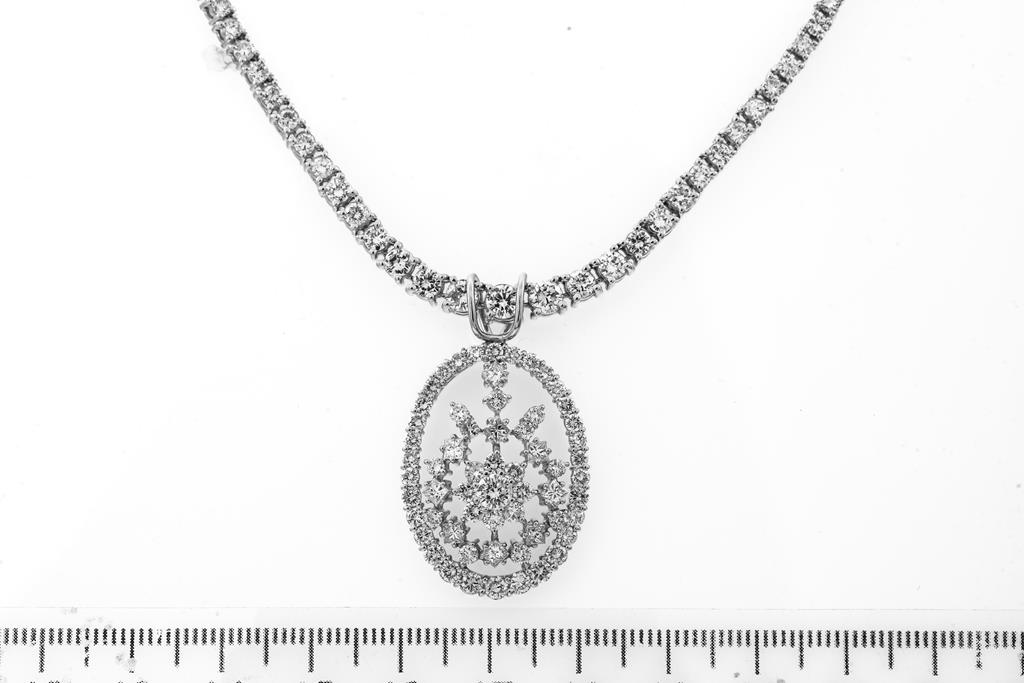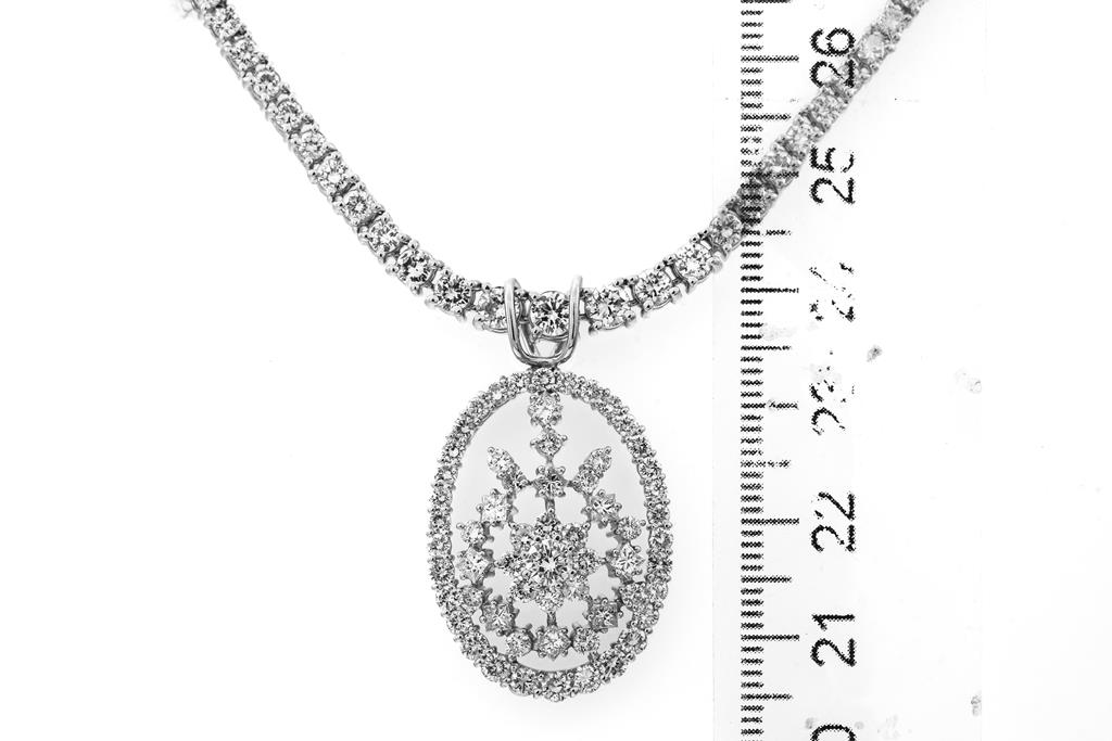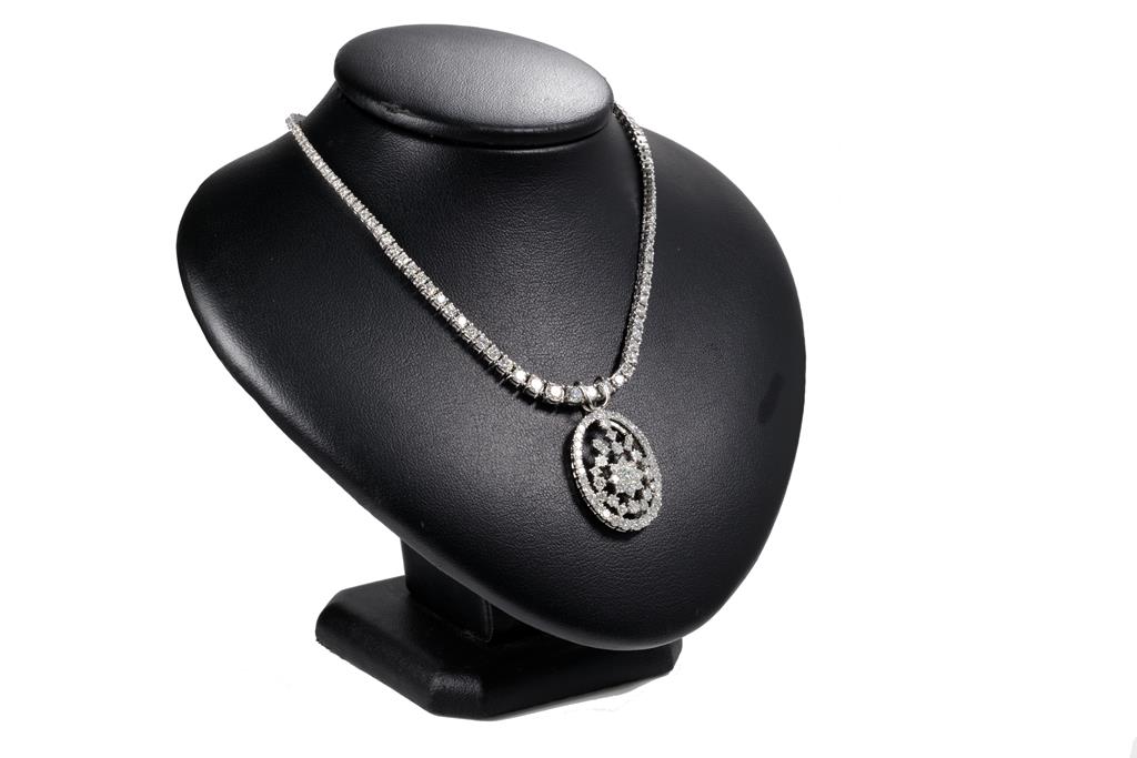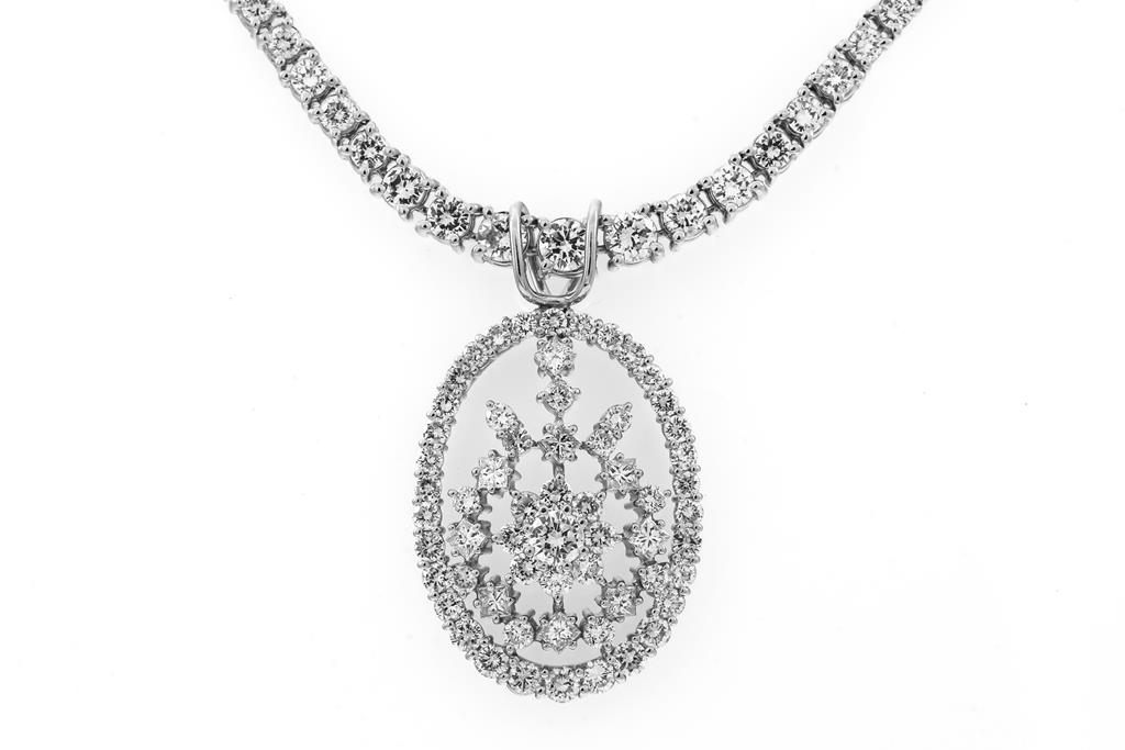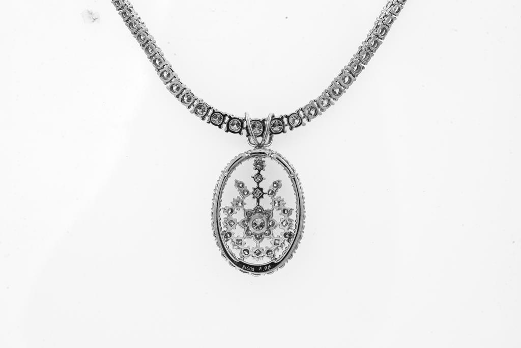 Diamond necklace with 147 graduated round Diamonds totalling 5.50cts (Estimated grading: H-I SI) and pendant with round and princess cut Diamonds totalling 2.92cts (Estimated grading H-I SI). Platinum. Length: 40cm. Weight: 34.1g. With Certificate #416053. (Pre-owned)