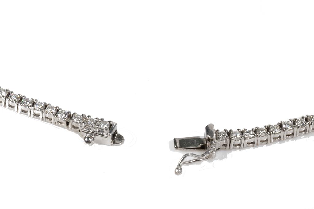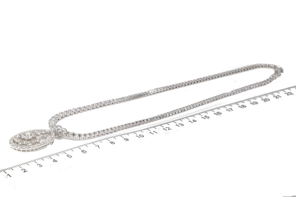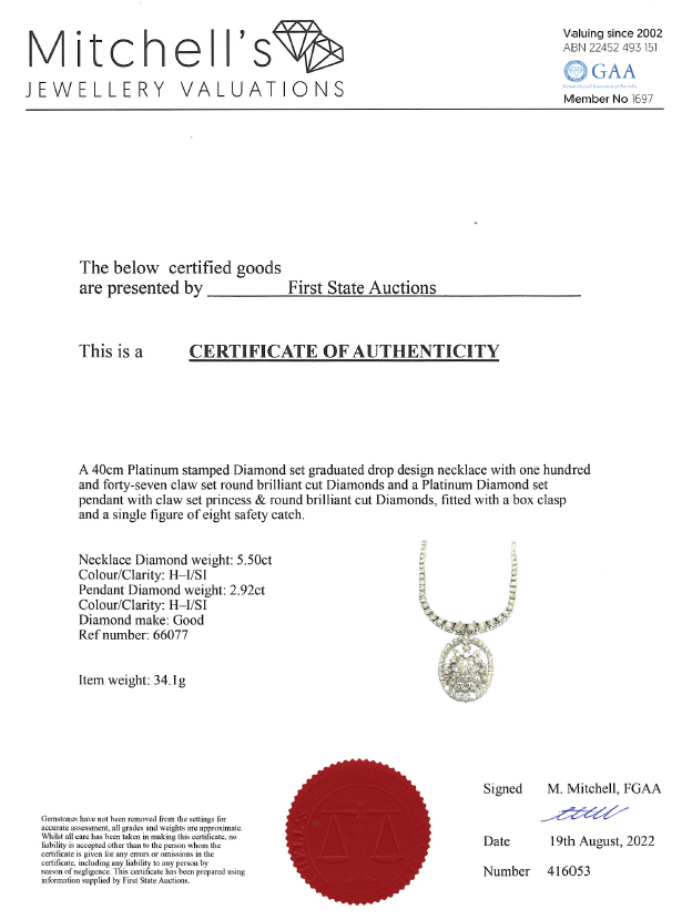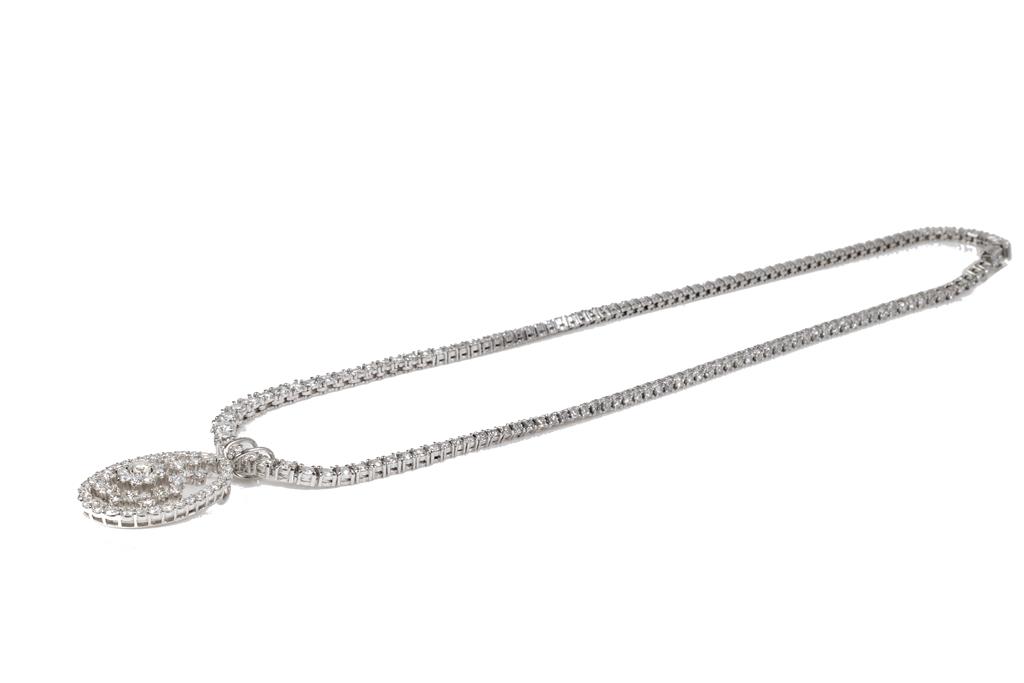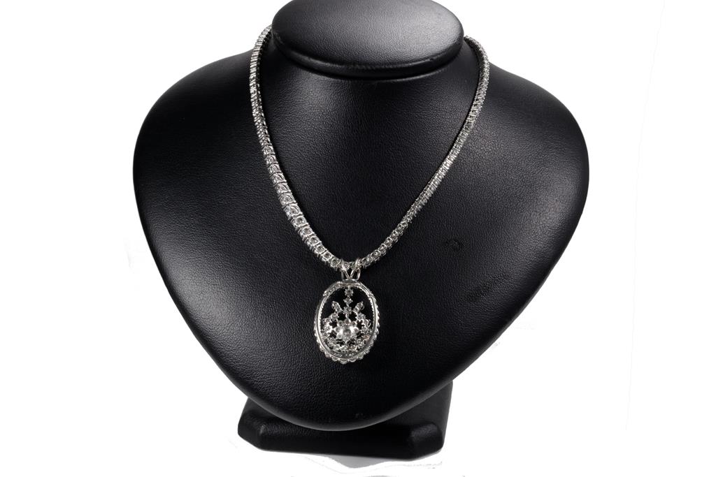 Diamond necklace with 147 graduated round Diamonds totalling 5.50cts (Estimated grading: H-I SI) and pendant with round and princess cut Diamonds totalling 2.92cts (Estimated grading H-I SI). Platinum. Length: 40cm. Weight: 34.1g. With Certificate #416053. (Pre-owned)
