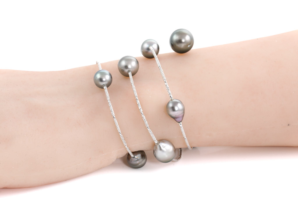 Pearl wrap-around bracelet with 11 ringed and dropped shape Tahitian Pearls of 8.4mm - 11.7mm. 18ct white gold. Expendable circumference: 20cm. Weight: 20.1g. (Pre-owned)