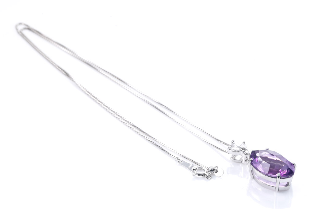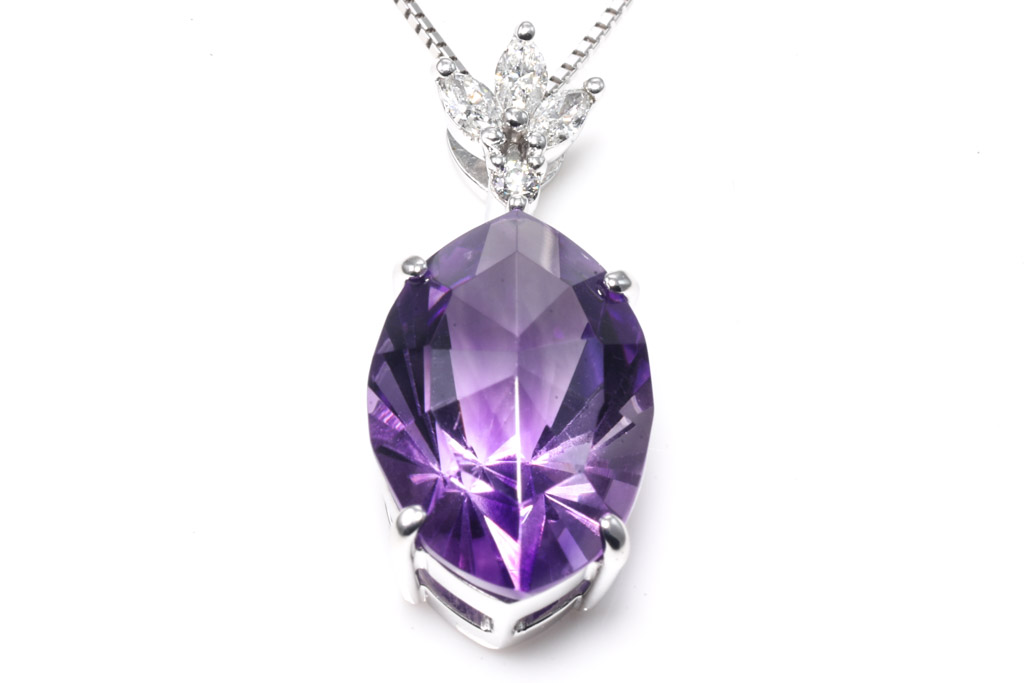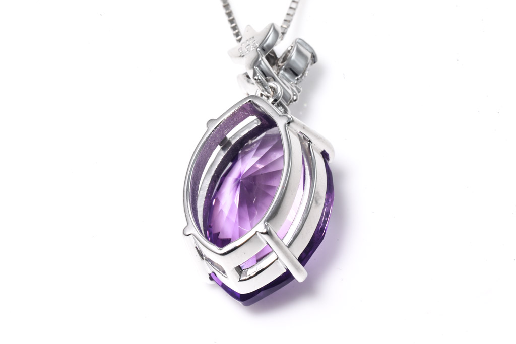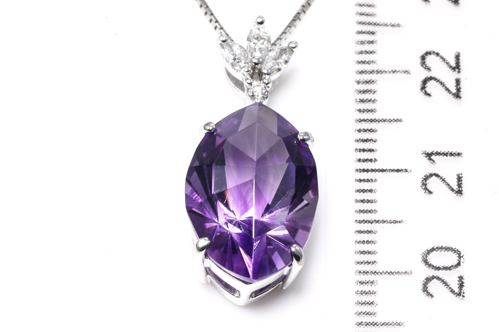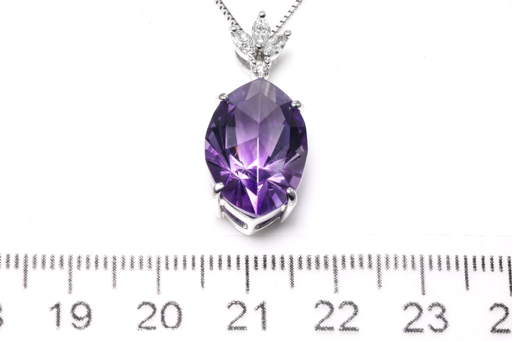 Amethyst and Diamond pendant with fancy cut Amethyst of 8.51ct and round & marquise cut Diamonds totalling 0.21cts. Platinum with 44cm 18ct white gold adjustable chain. Weight: 8.5g. (Pre-owned)