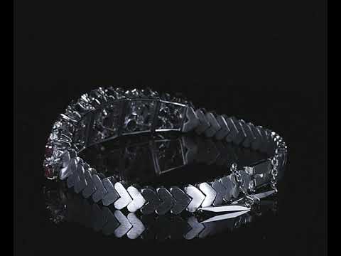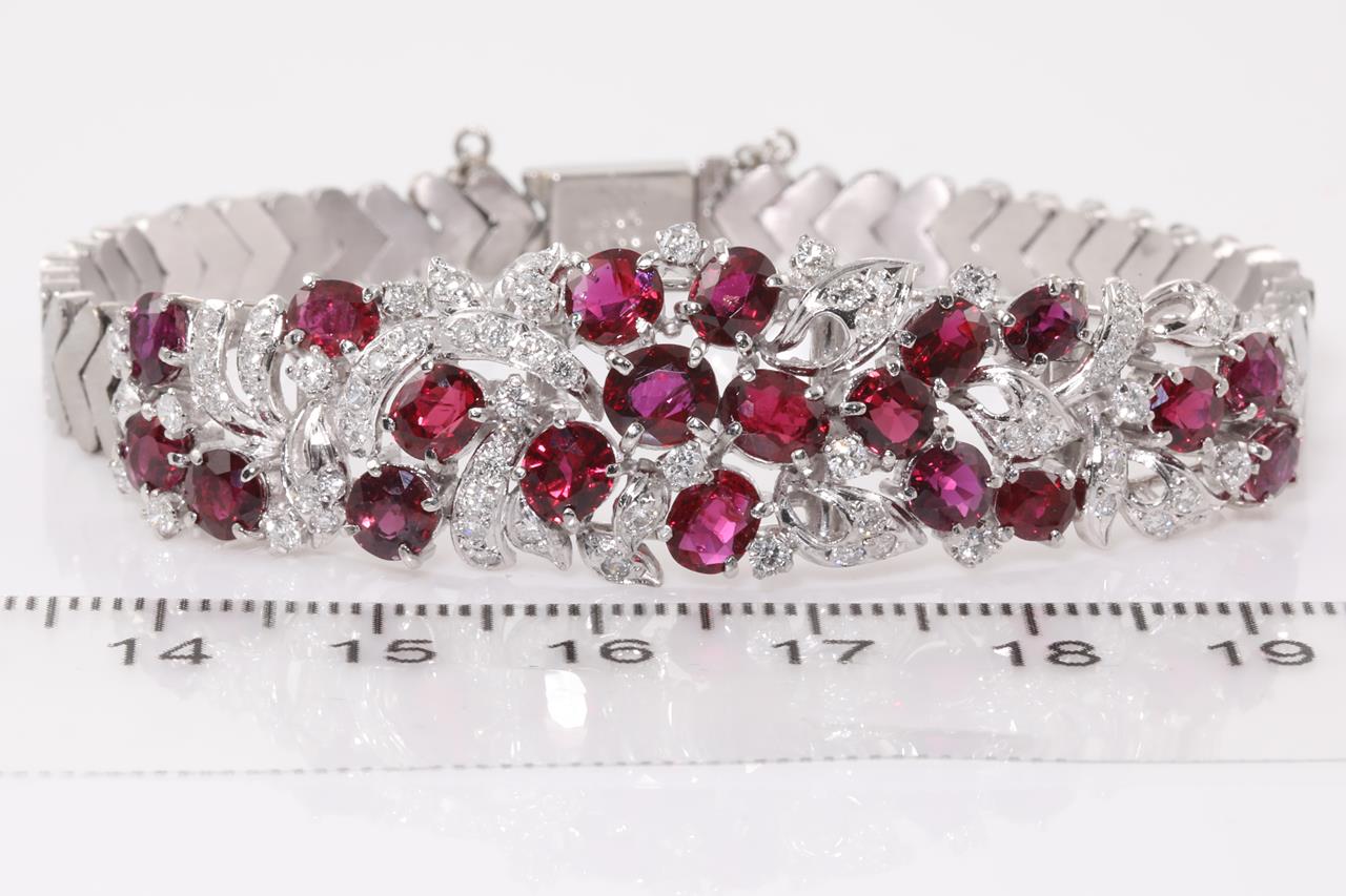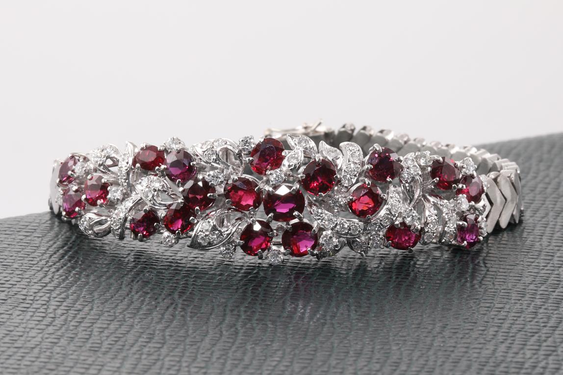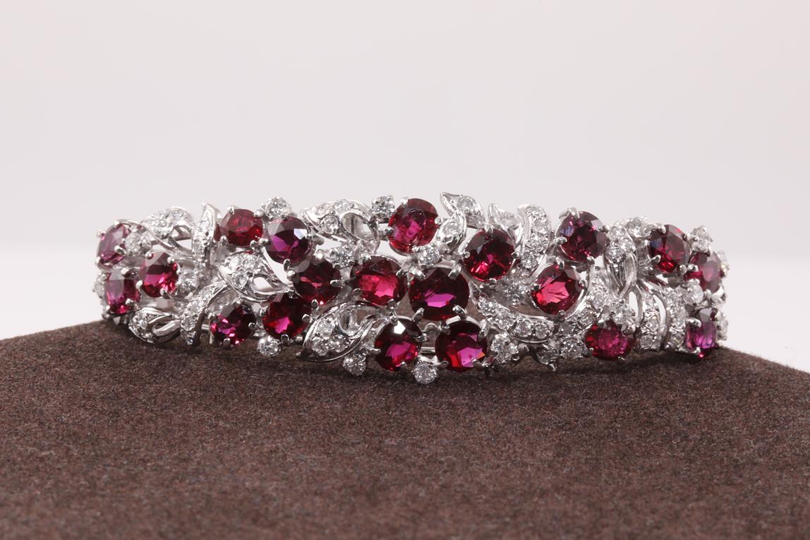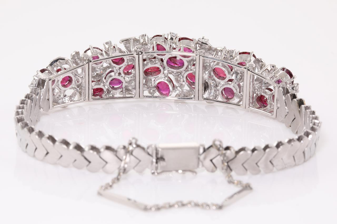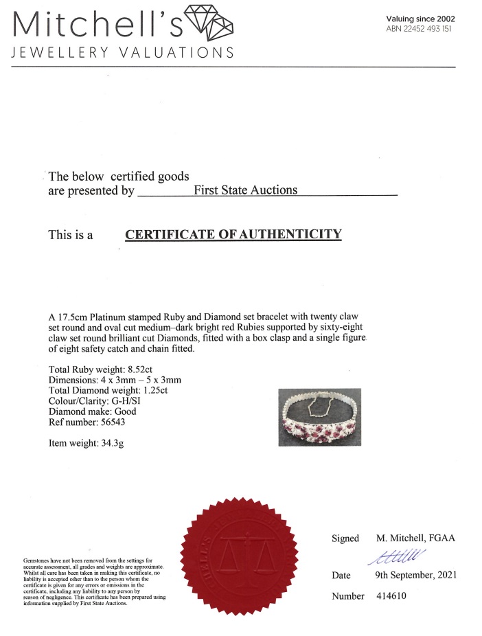 Ruby and Diamond bracelet with oval Rubies totalling 8.52cts and Diamonds totalling 1.25cts (Estimated grading: G-H SI). Platinum. Length: 17.5cm. Weight: 34.3g. With certificate #414610. (Pre-owned)