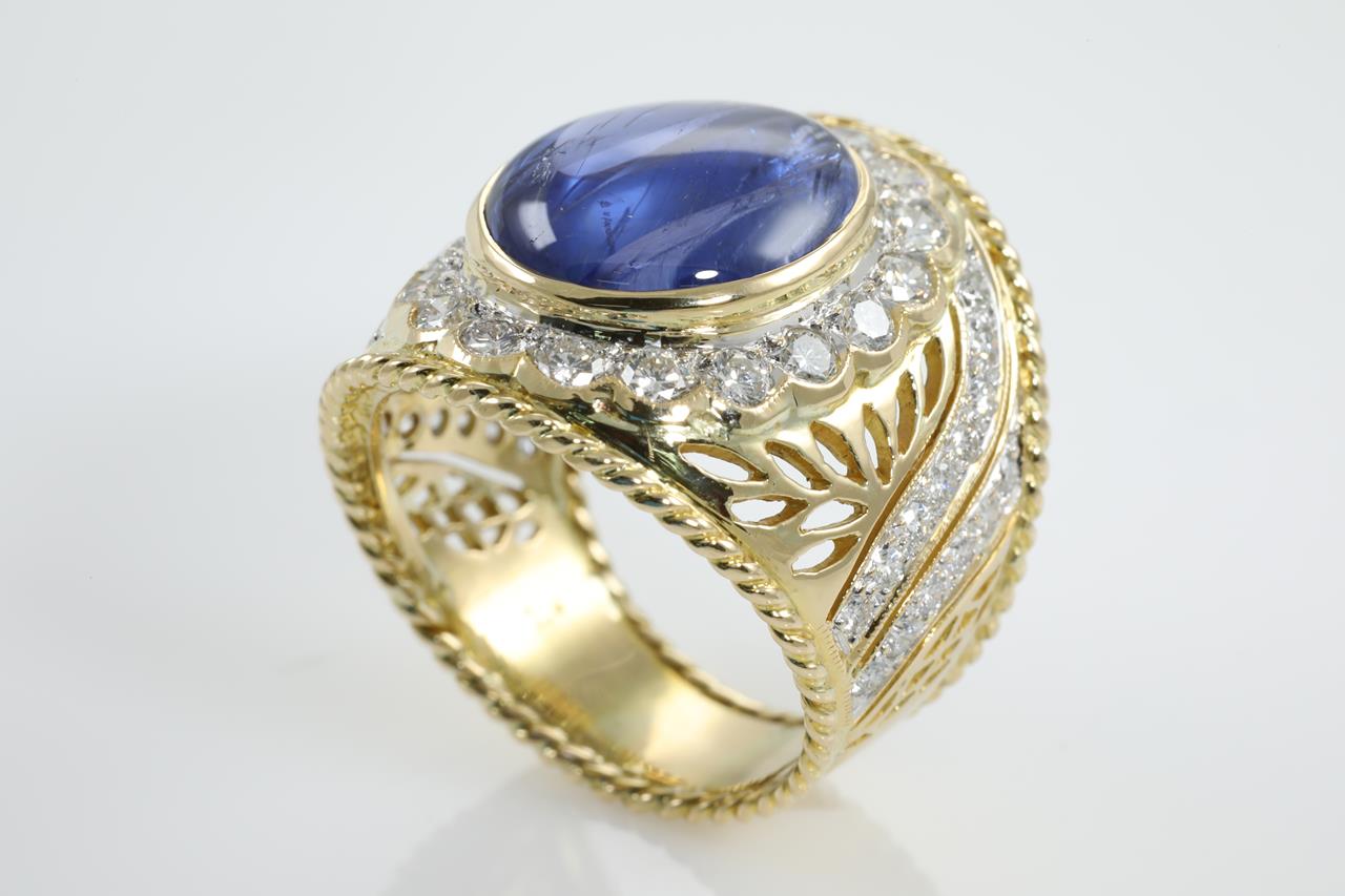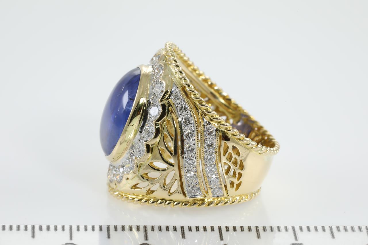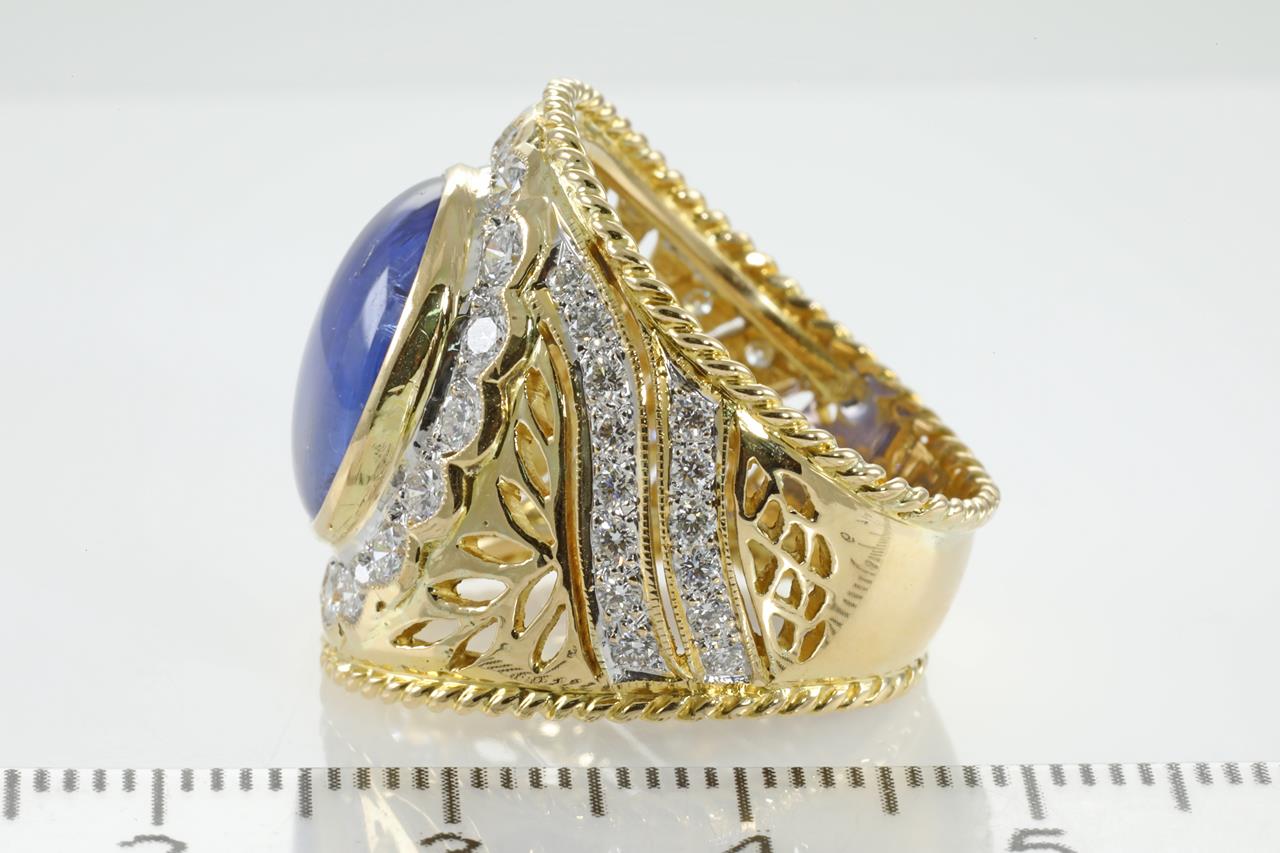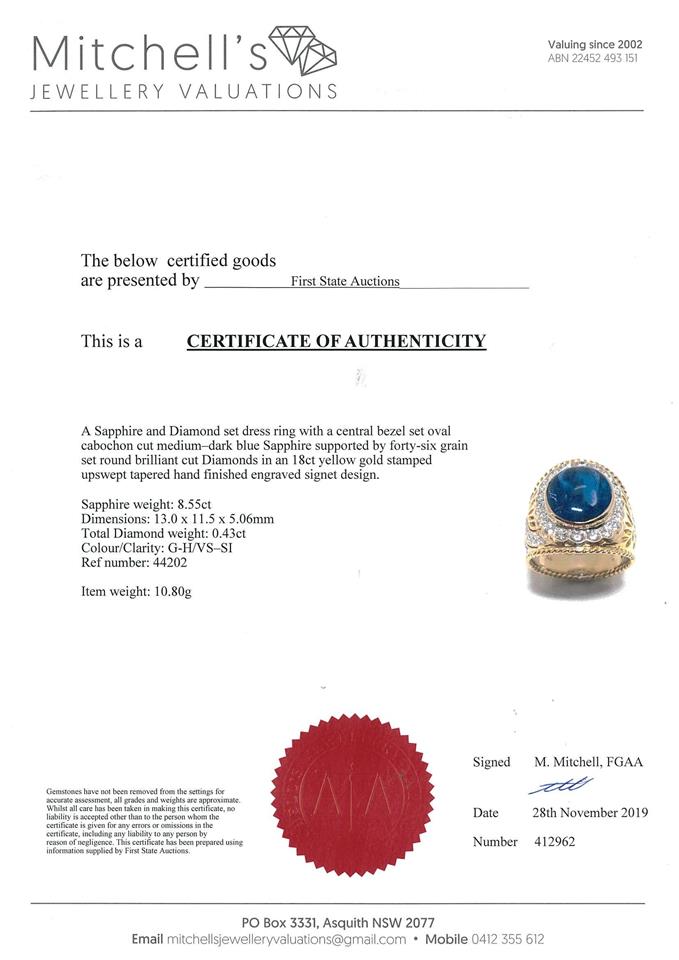 Sapphire and Diamond ring with an oval blue cabochon Sapphire of 8.55ct and Diamonds totalling 0.43cts (Estimated grading: G-H VS-SI). 18ct yellow gold. Ring size O. With certificate #412962. Weight: 10.8g (Pre-owned)