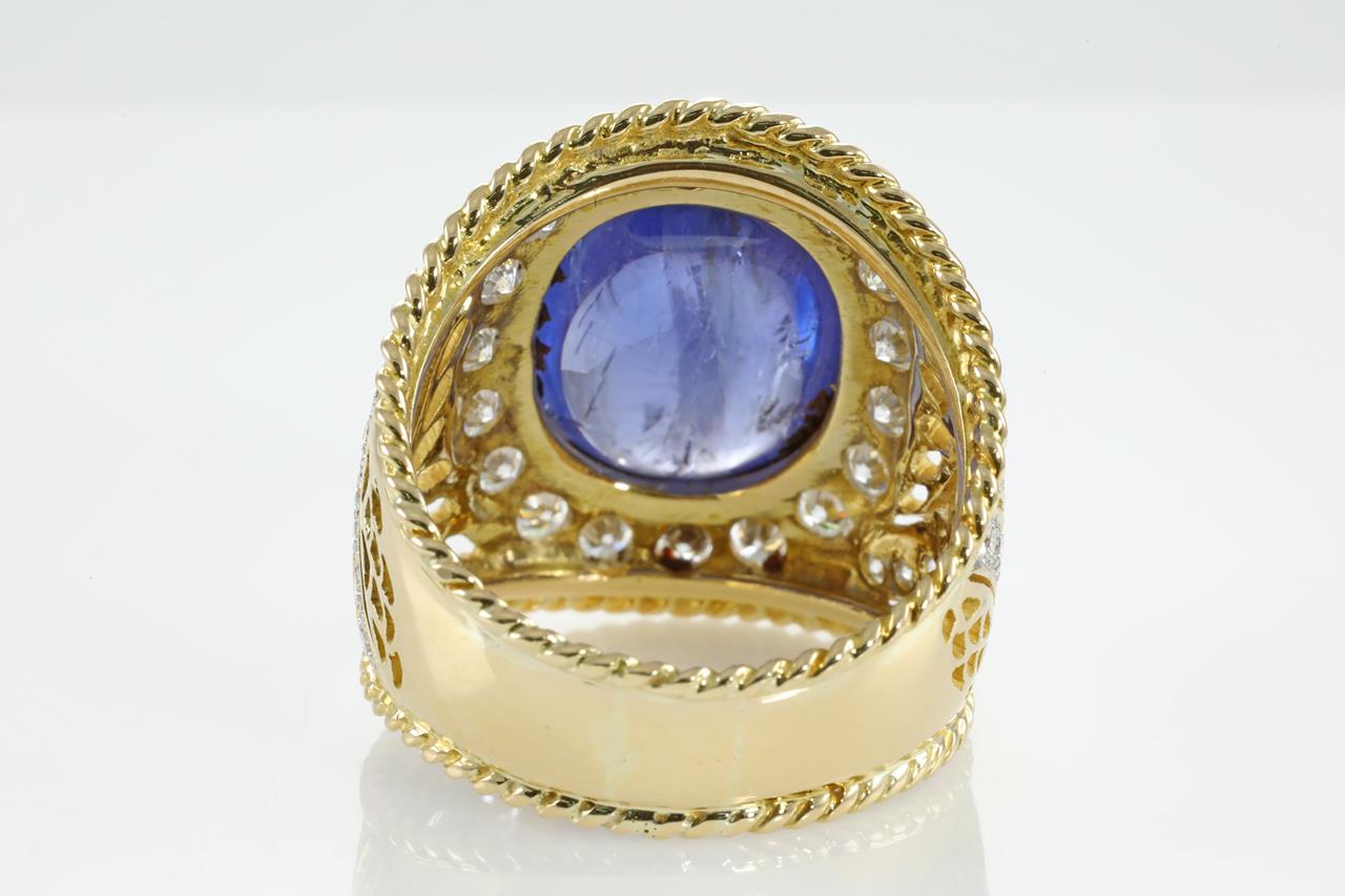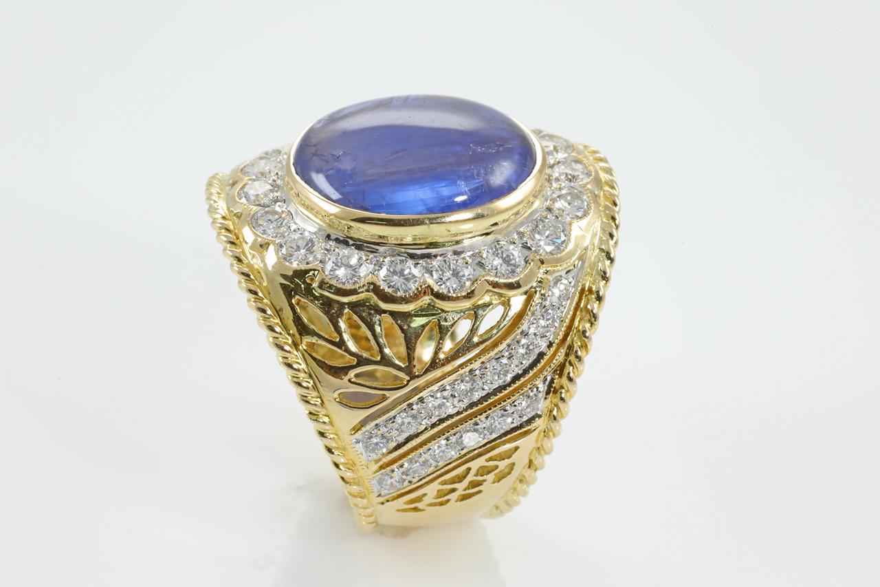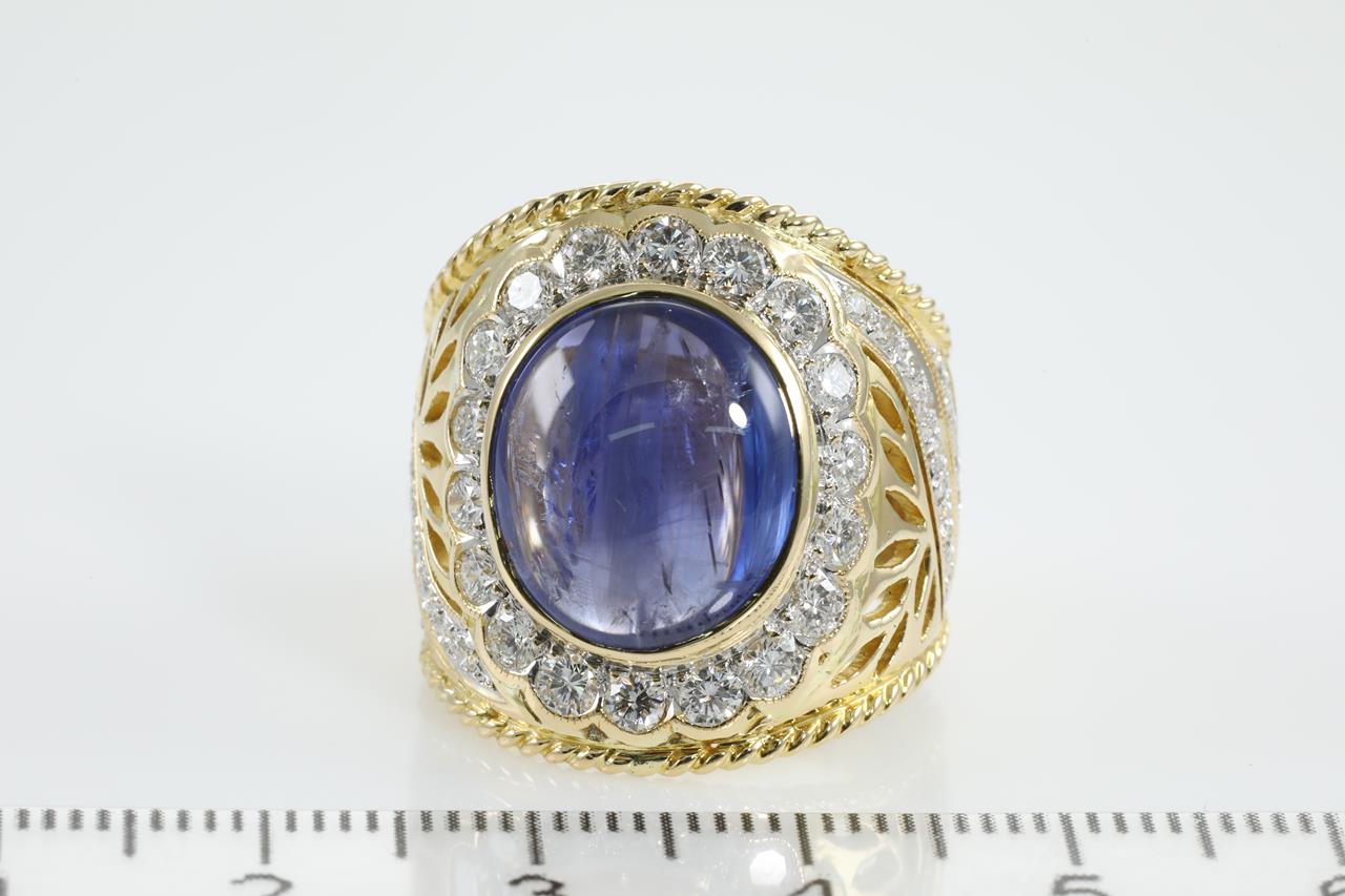 Sapphire and Diamond ring with an oval blue cabochon Sapphire of 8.55ct and Diamonds totalling 0.43cts (Estimated grading: G-H VS-SI). 18ct yellow gold. Ring size O. With certificate #412962. Weight: 10.8g (Pre-owned)